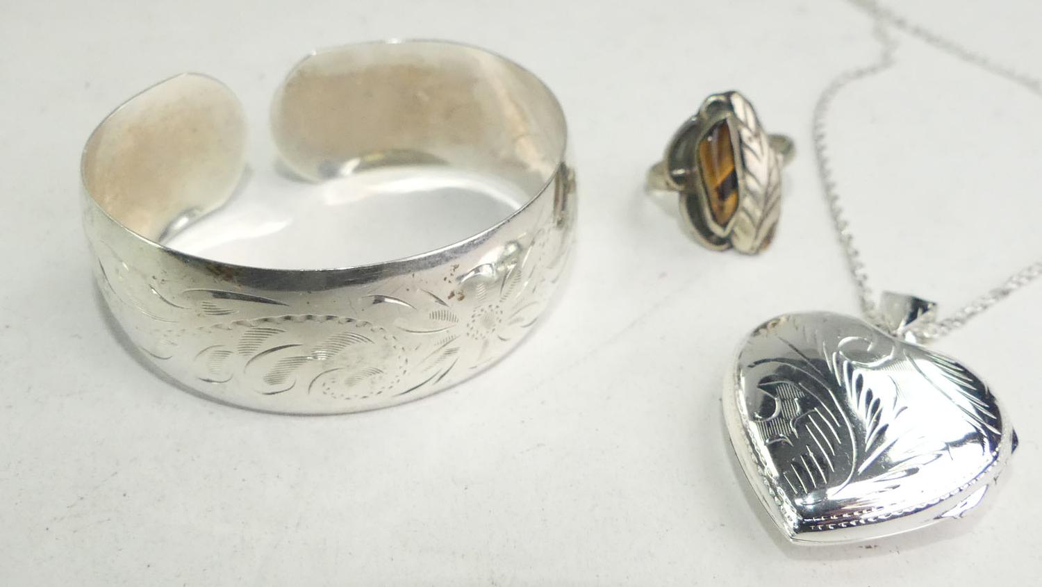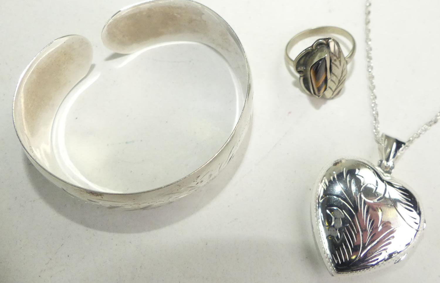 sterling silver cuff bracelet, tigers eye ring, and heart locket on chain, weighing approx 24 grams