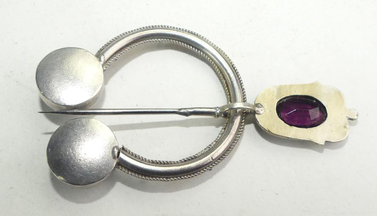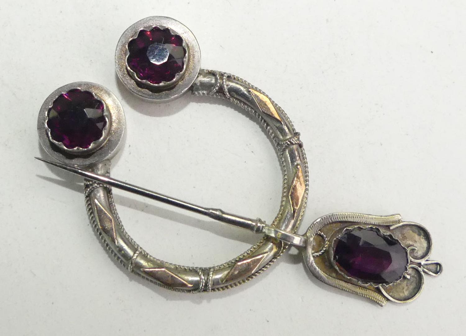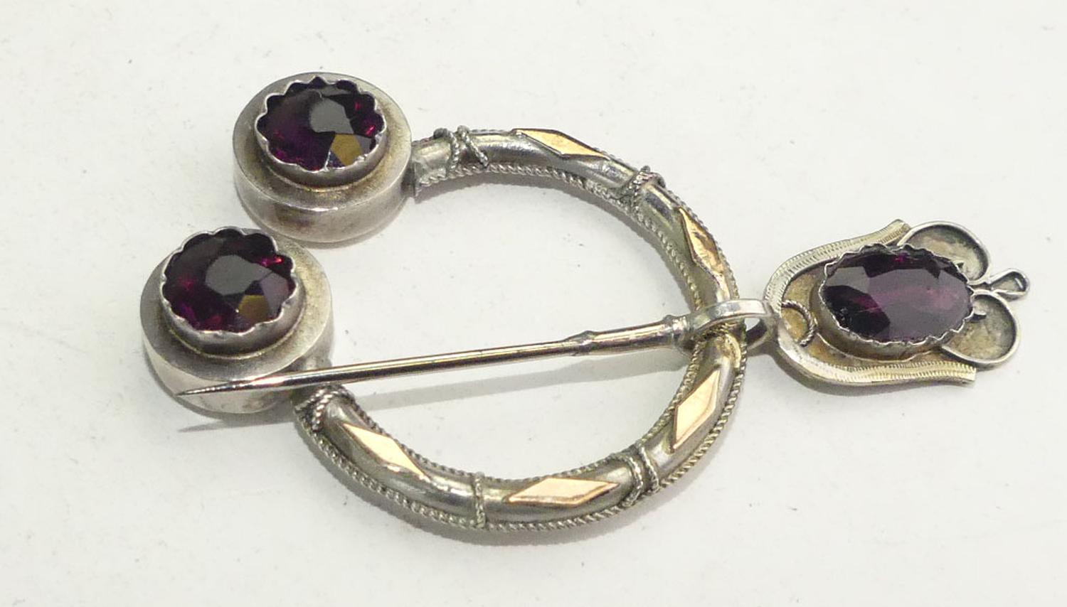 19th century scottish silver and gold paste fibula brooch, length 2 3/4", 8.5 grams