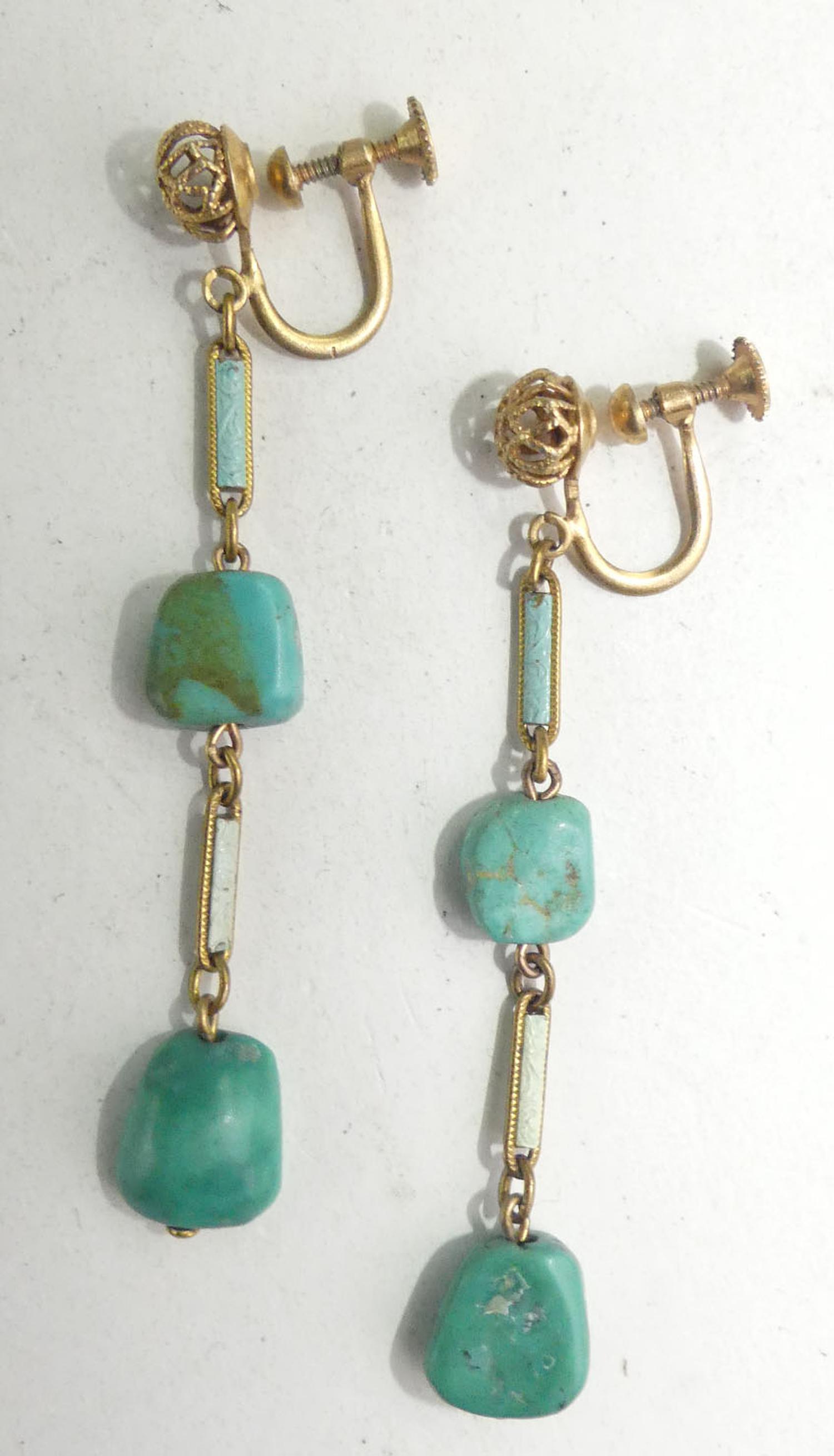 victorian gold filled filigree turquoise enamel drop earrings, height 2 1/2"