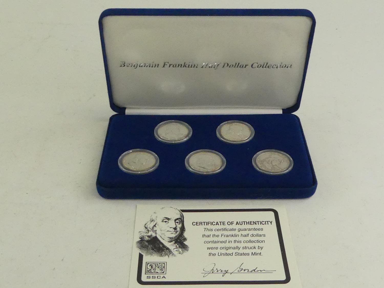 cased set of five benjamin franklin half dollar coin collection