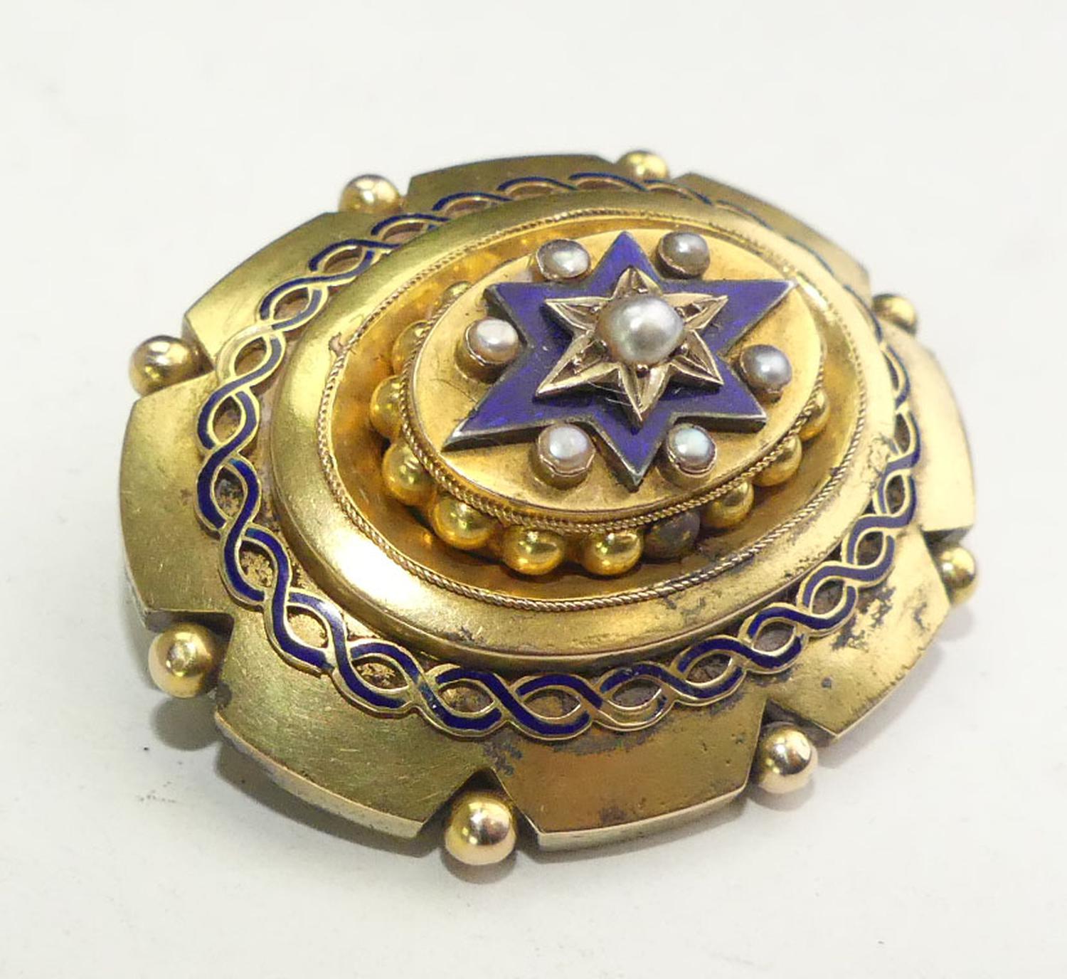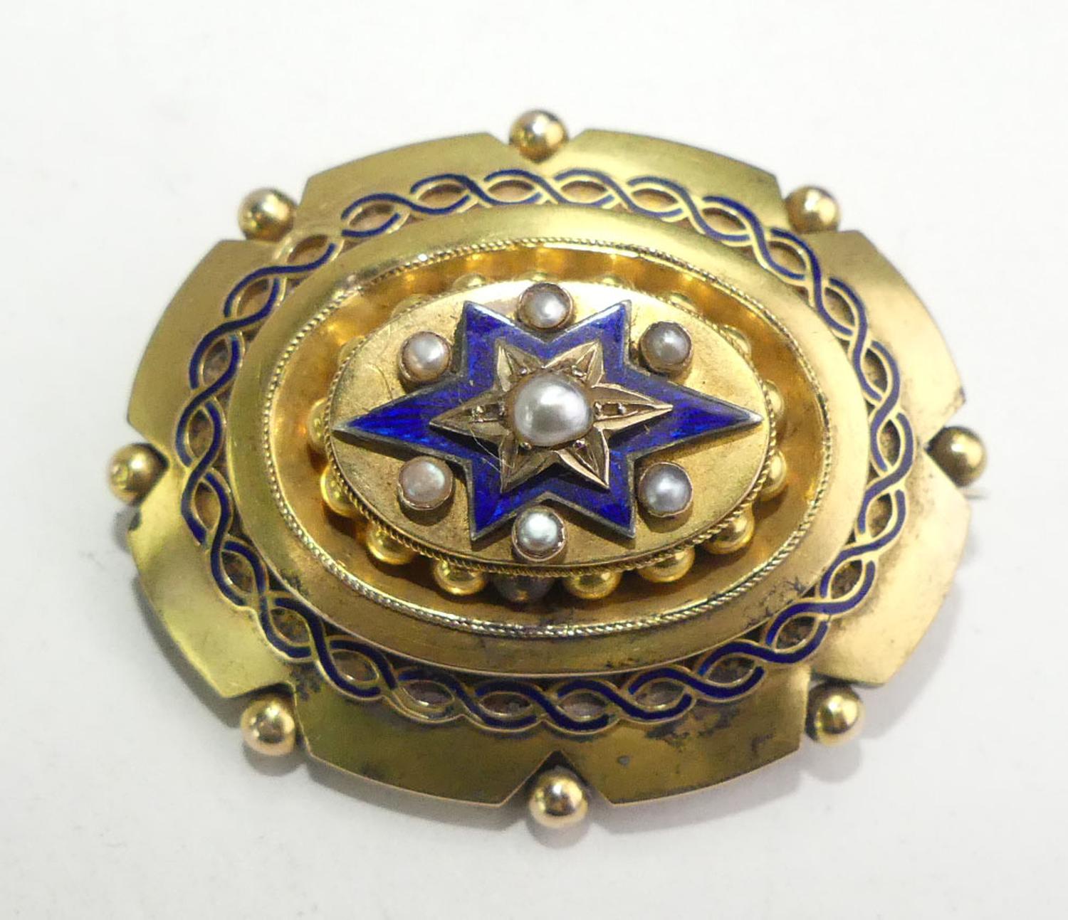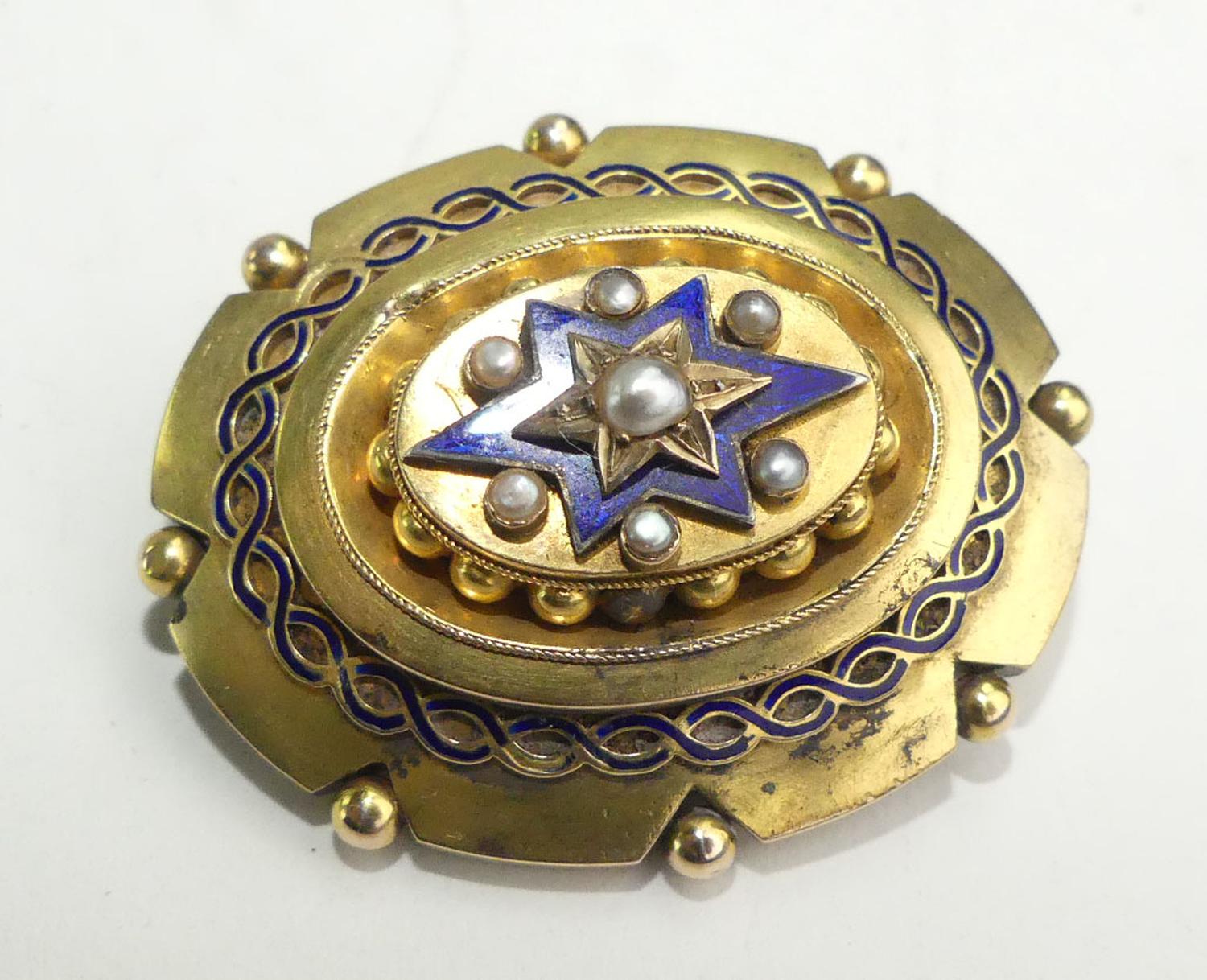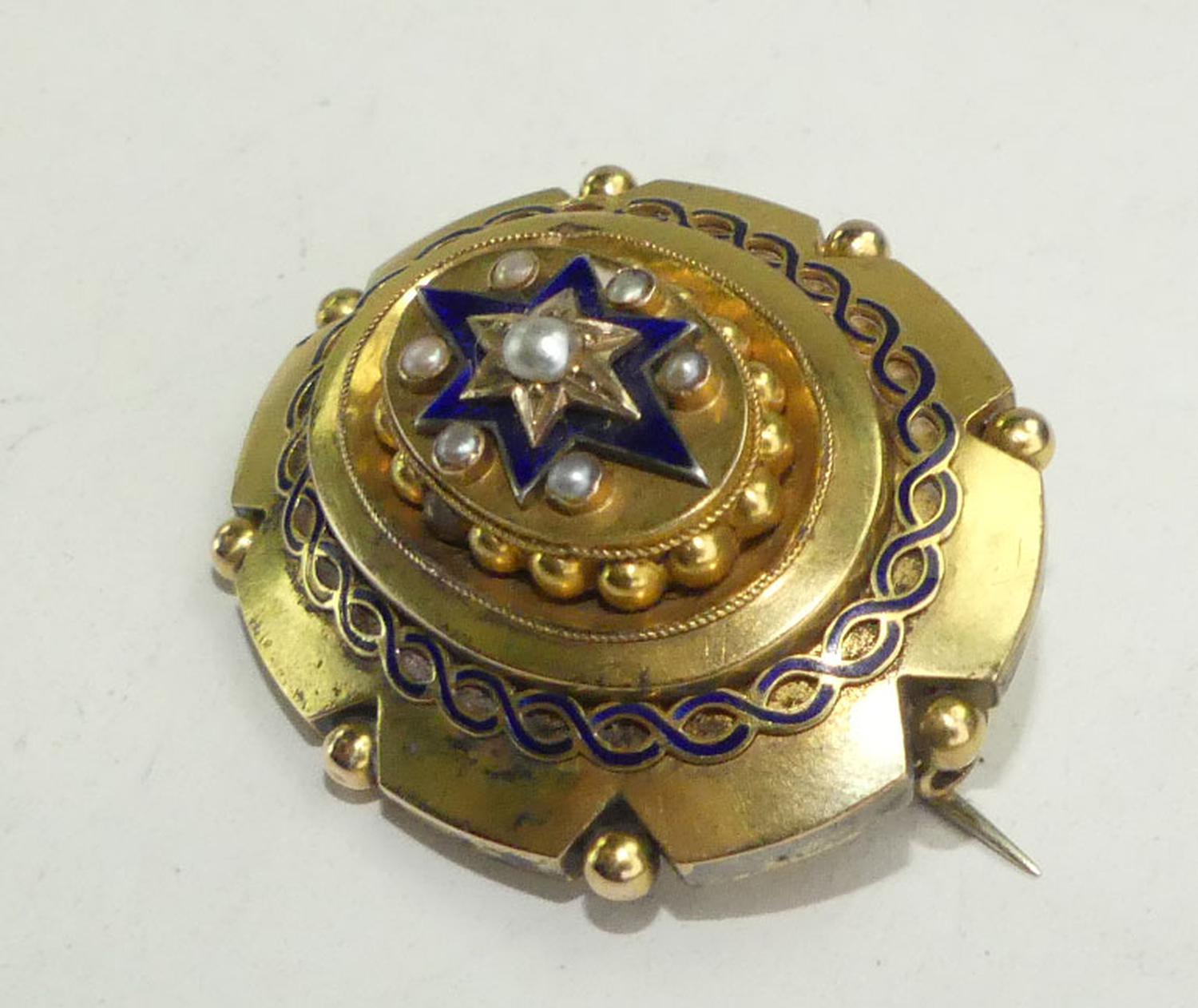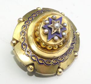 victorian 14k blue enamel seed pearl brooch, w/a 14.8 grams