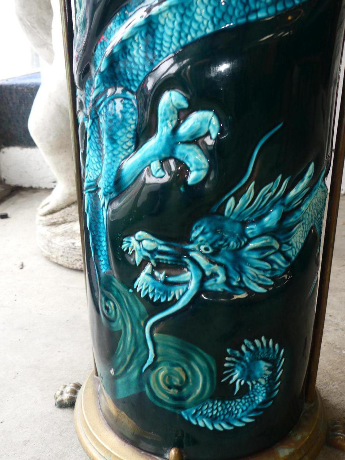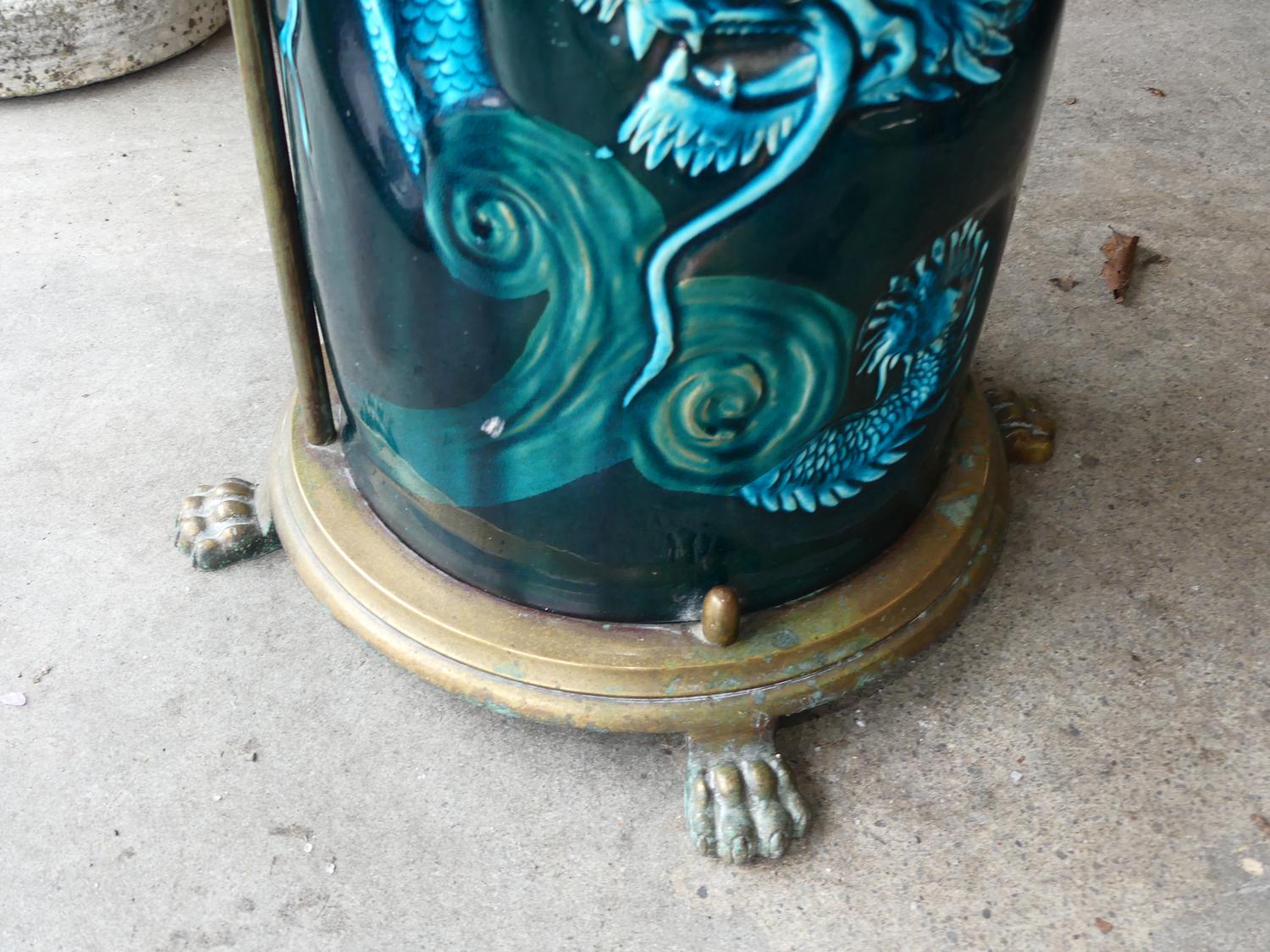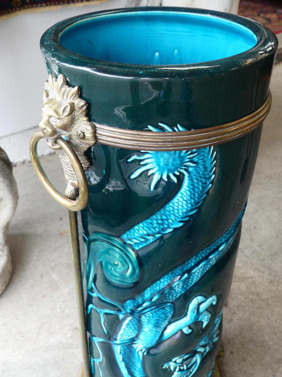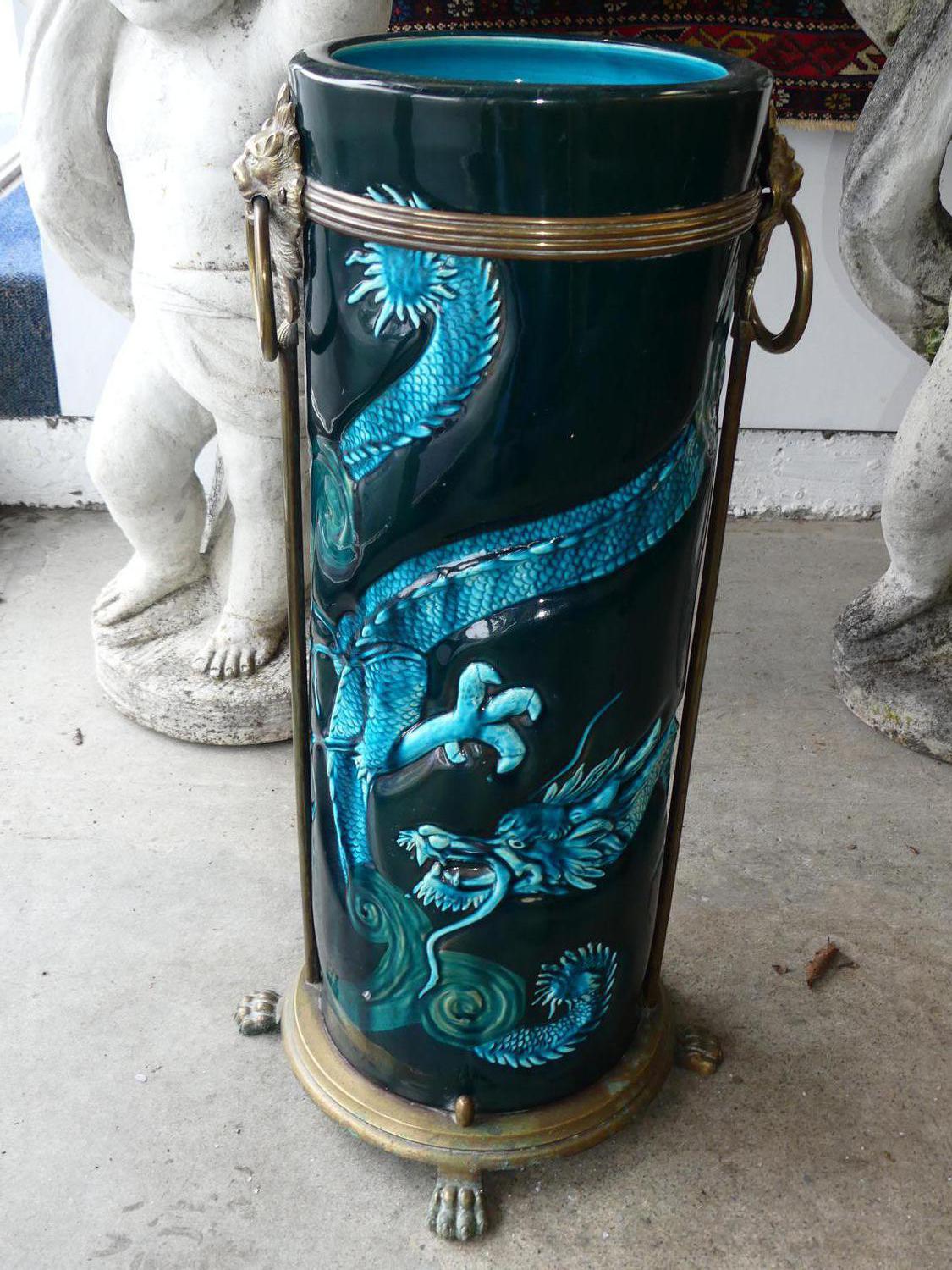 early 20th century dragon motif umbrella stand with brass, bretby, england, 25" x12"