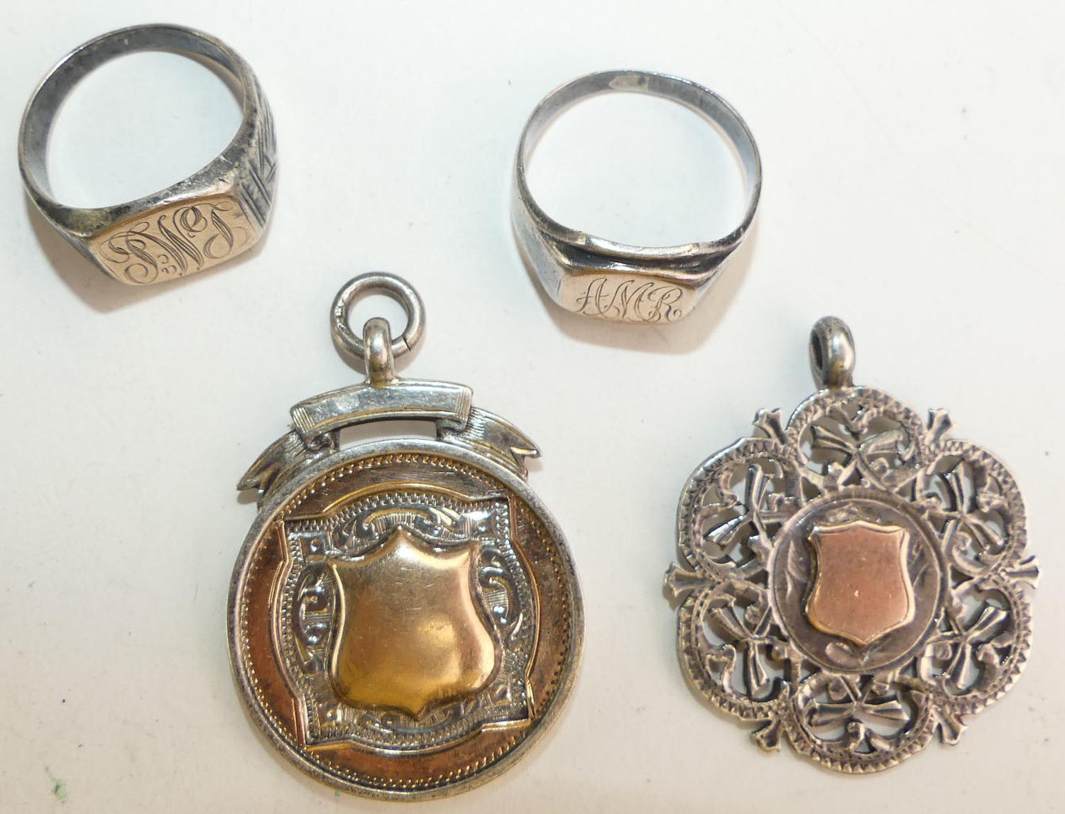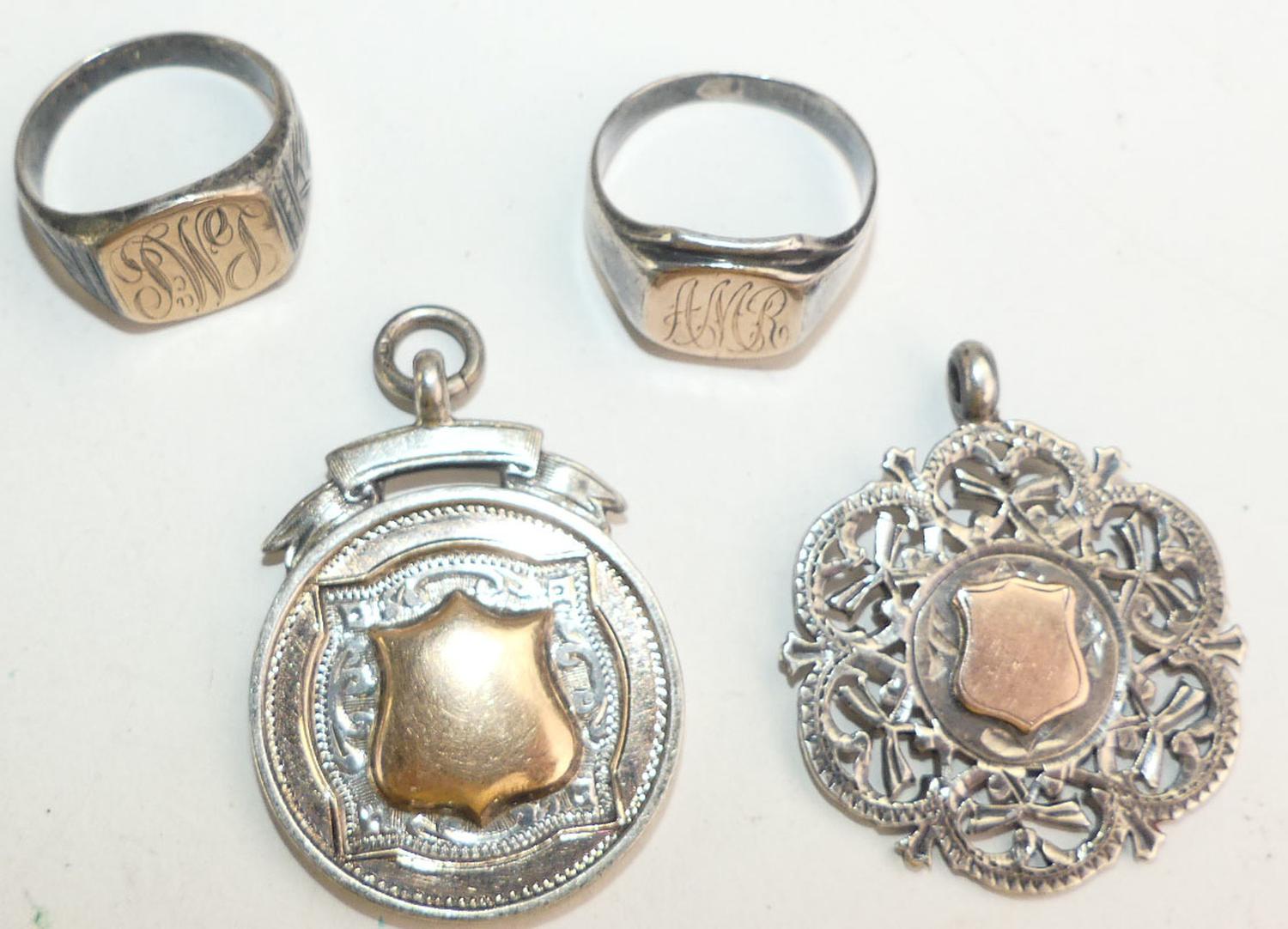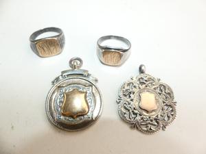 1900s sterling silver rose gold sheild watch fob pendants, with 2 rings