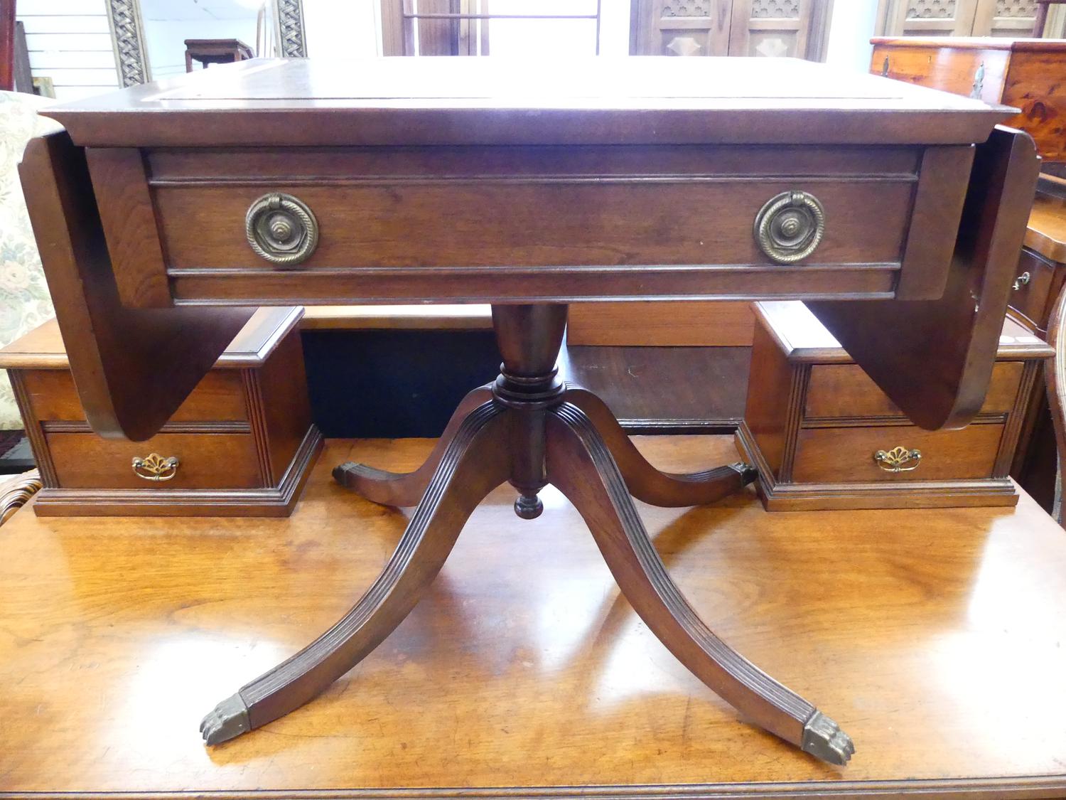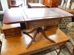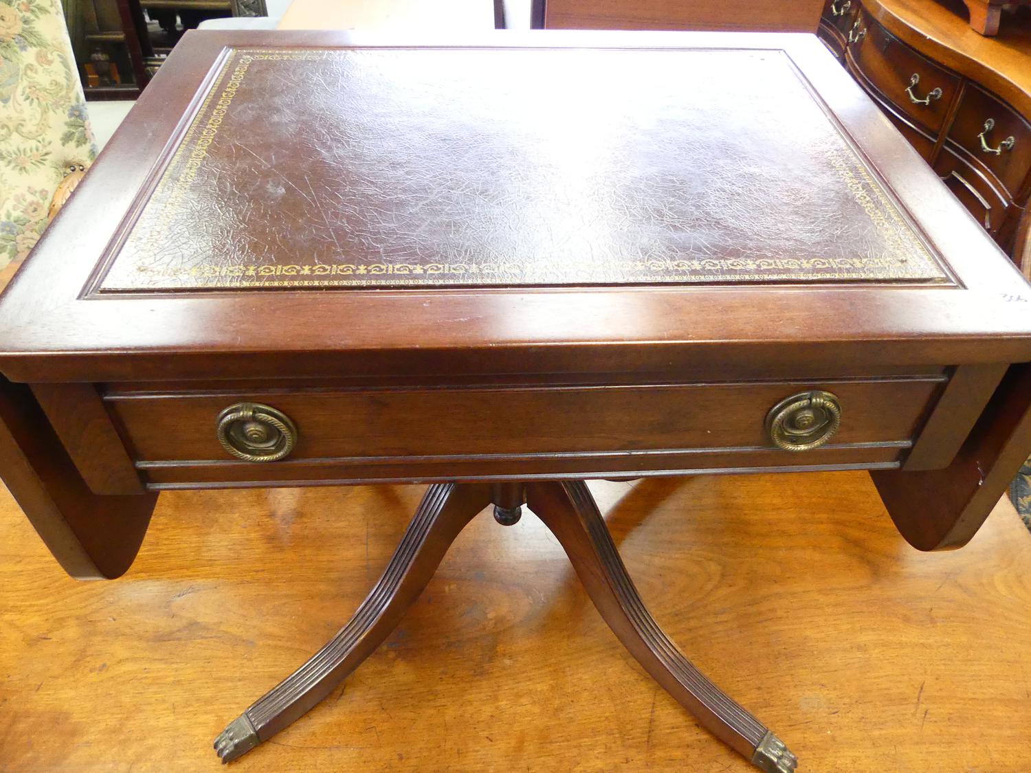 gilt tooled leather inset drop leaf silver table, 19" x 37" x 16"