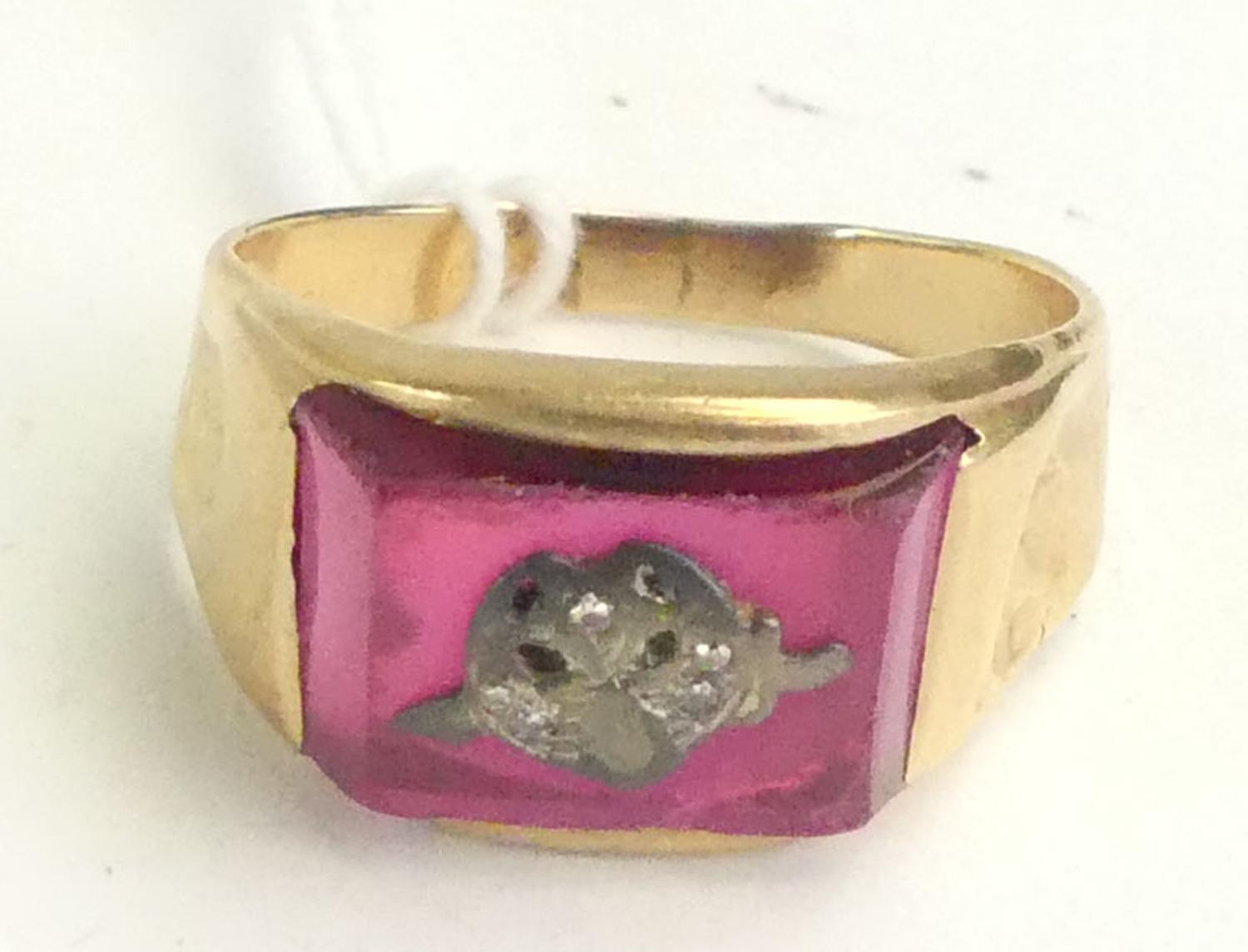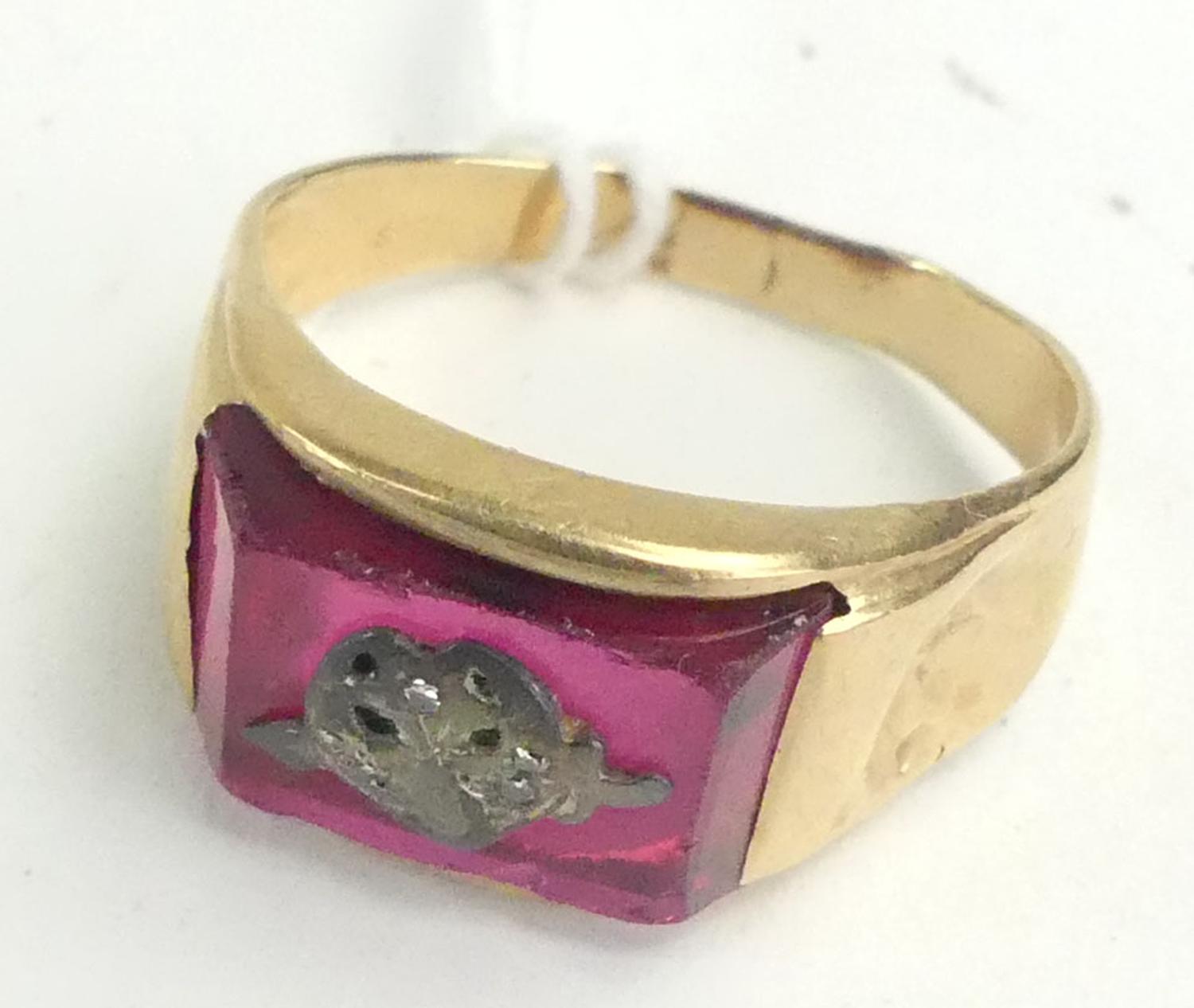 14k yellow gold syn ruby gents ring, size 10 1/2