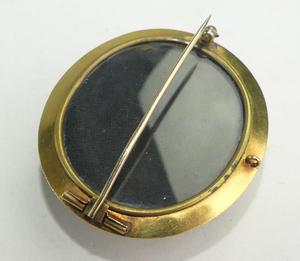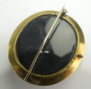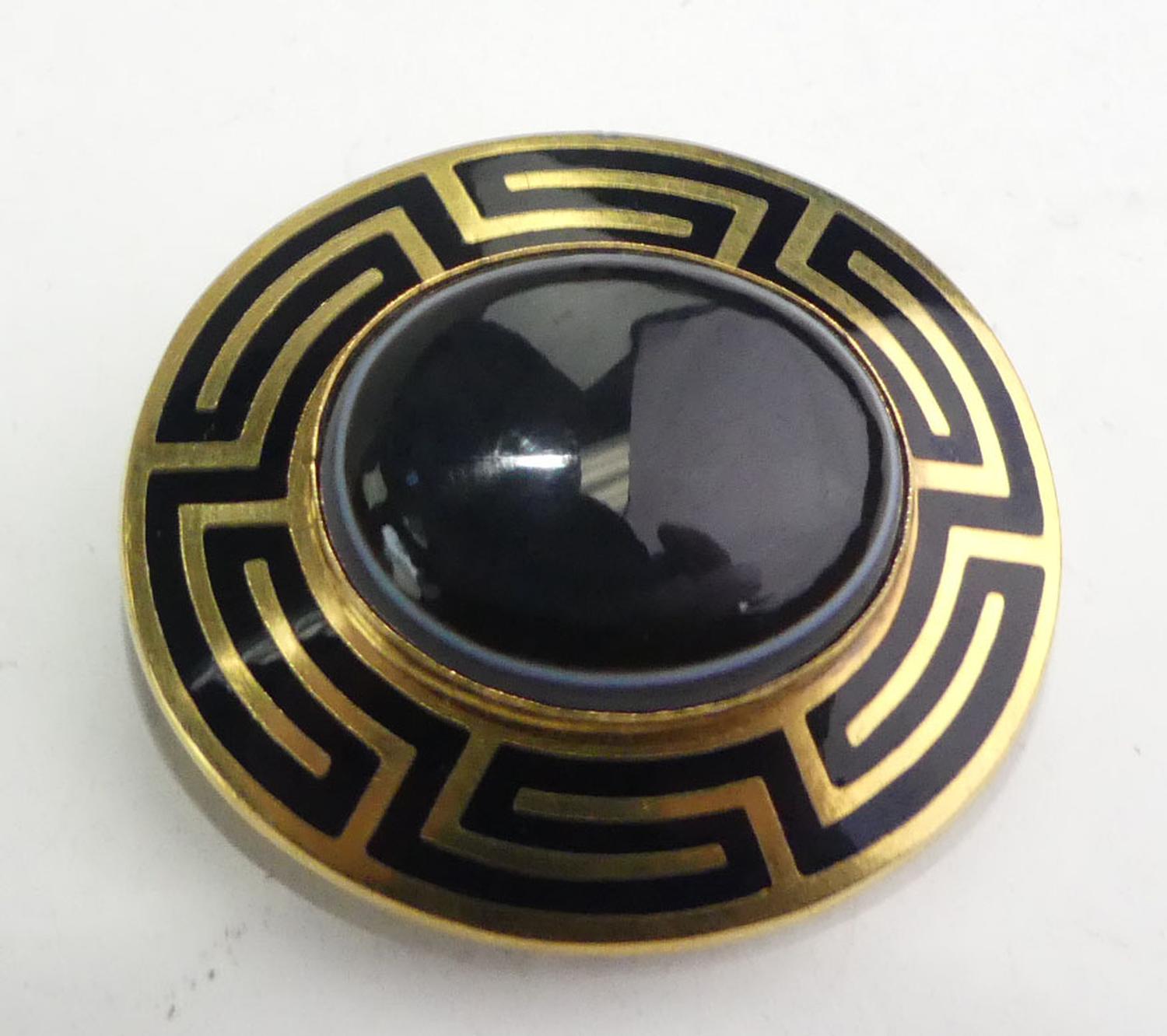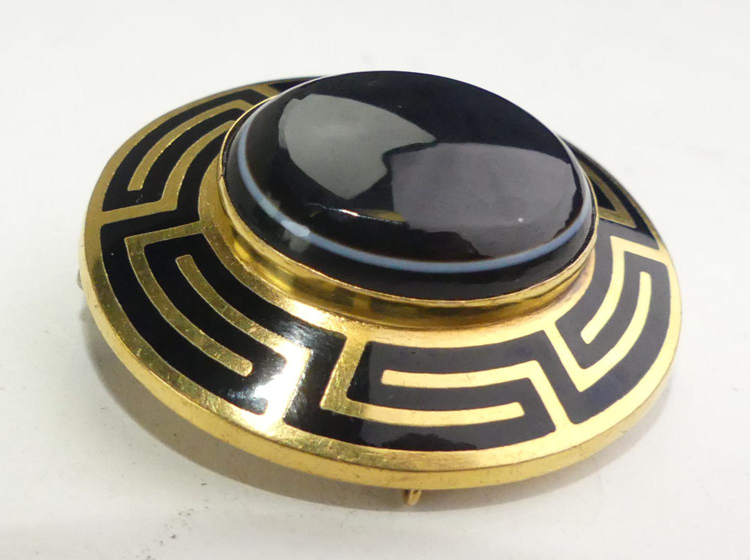 victorian gold banded agate brooch, greek key design enamel 14k gold and gilt, width 1 7/8"