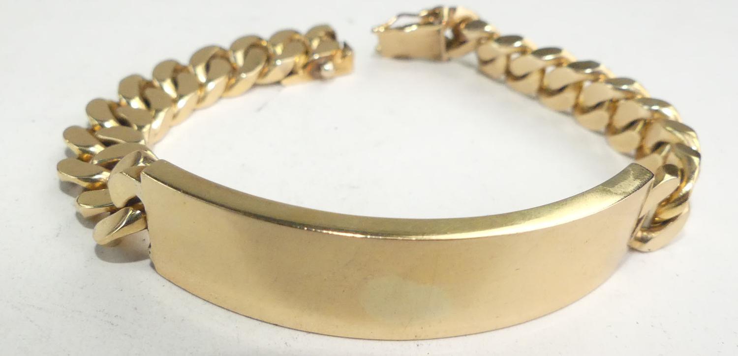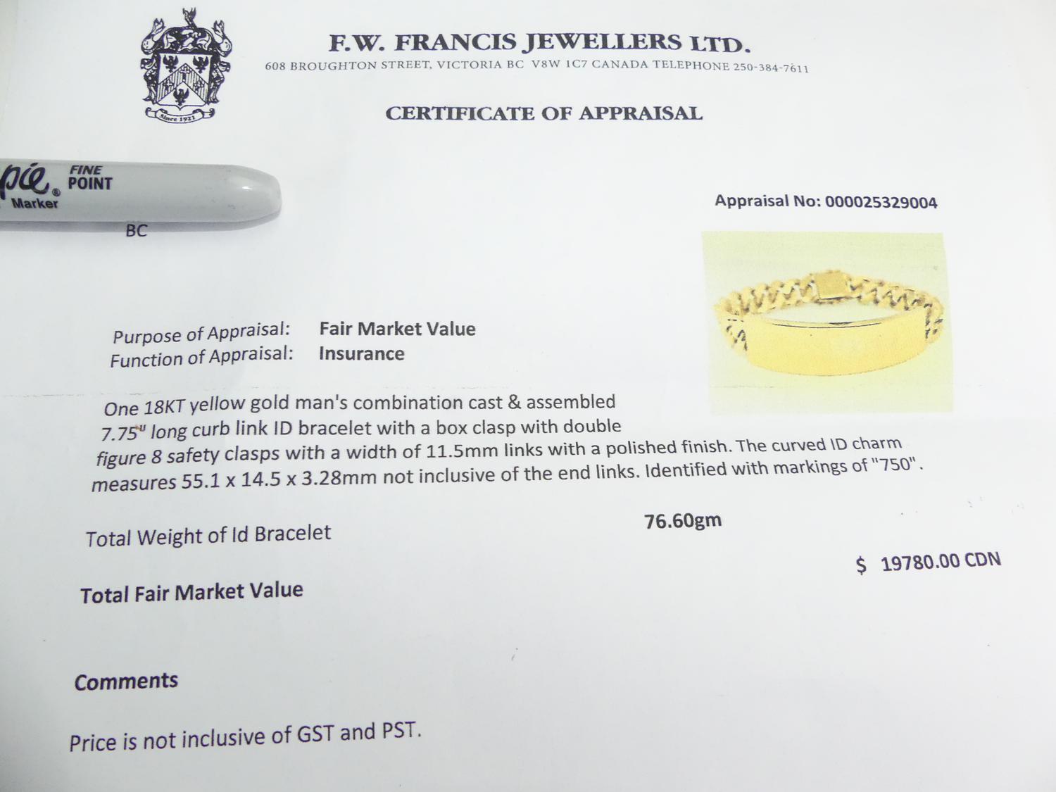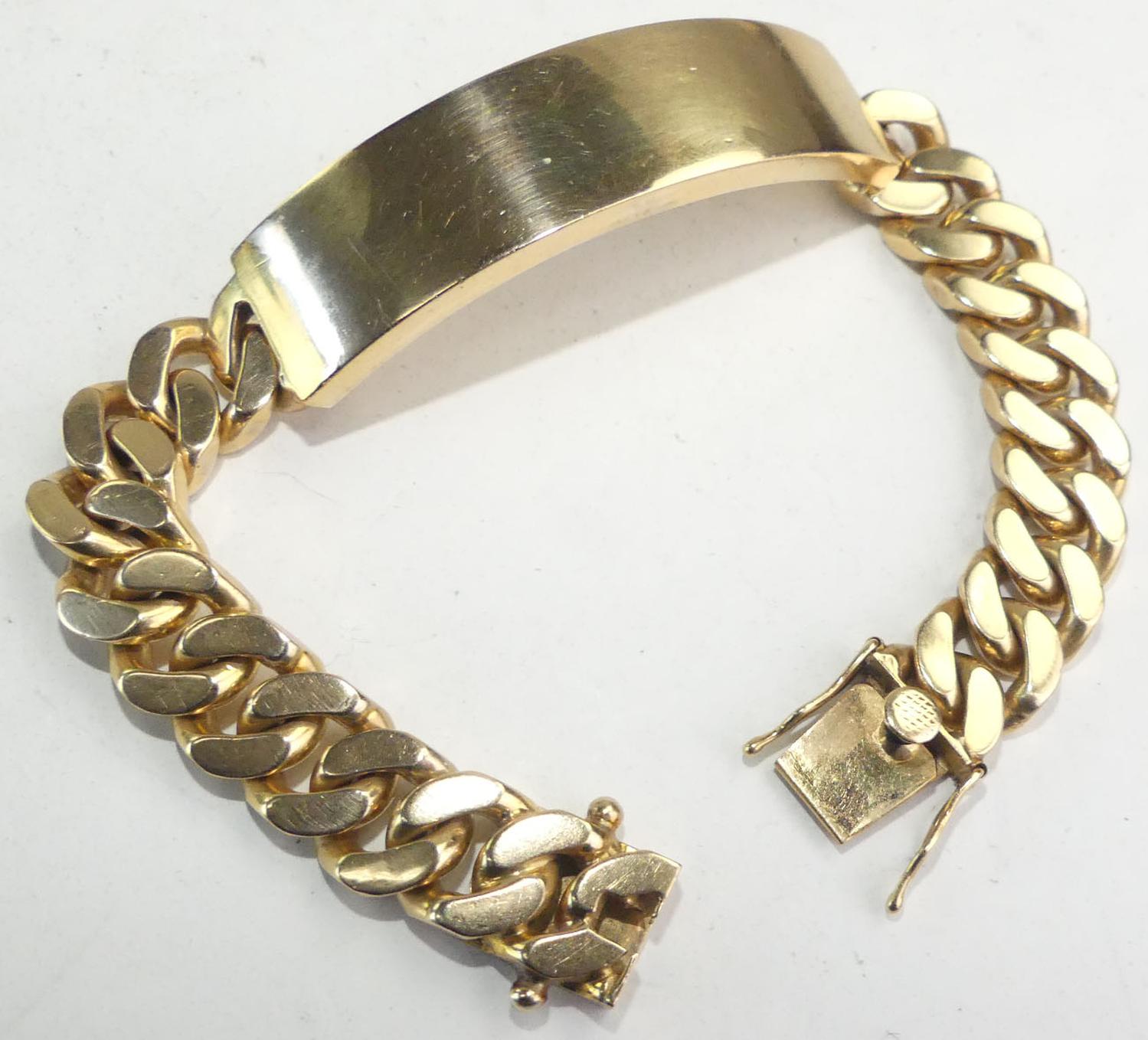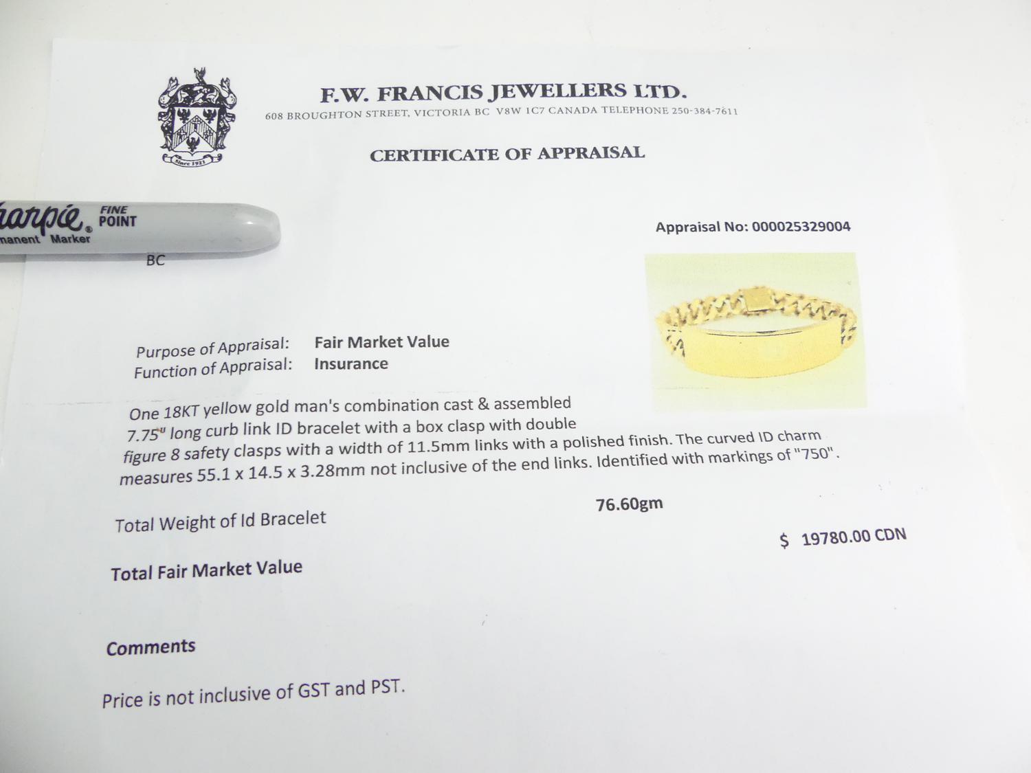 mens 18k curb link id bracelet, length 8", weighing approx 76.6 grams, with appraisal