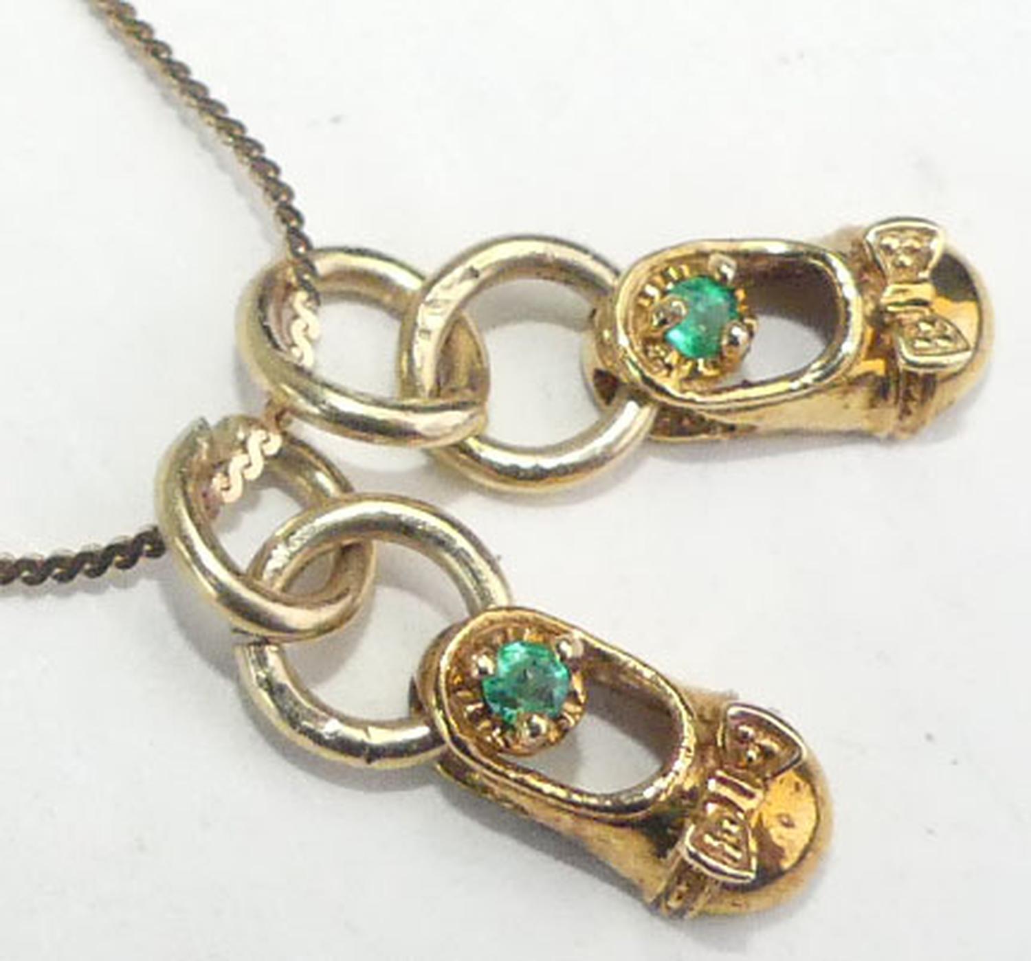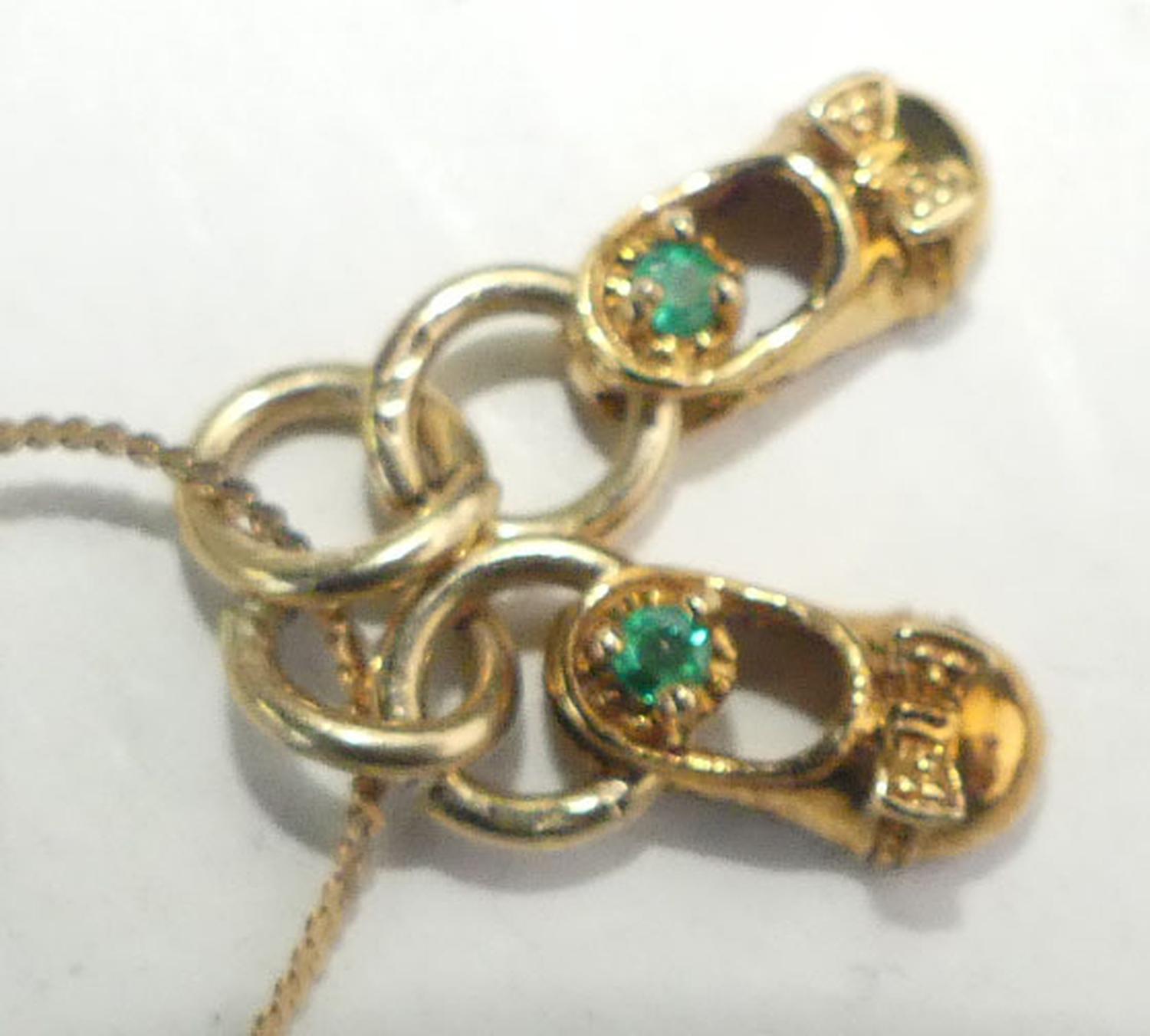 10k yellow gold baby shoe charm pendant necklace, set with emeralds, 16" in length, 2.8 grams