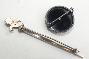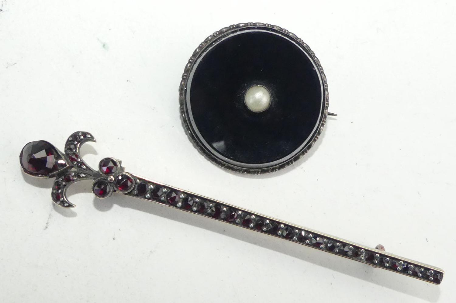victorian silver gilt garnet brooch with onyx seed pearl pin, circa 1900s