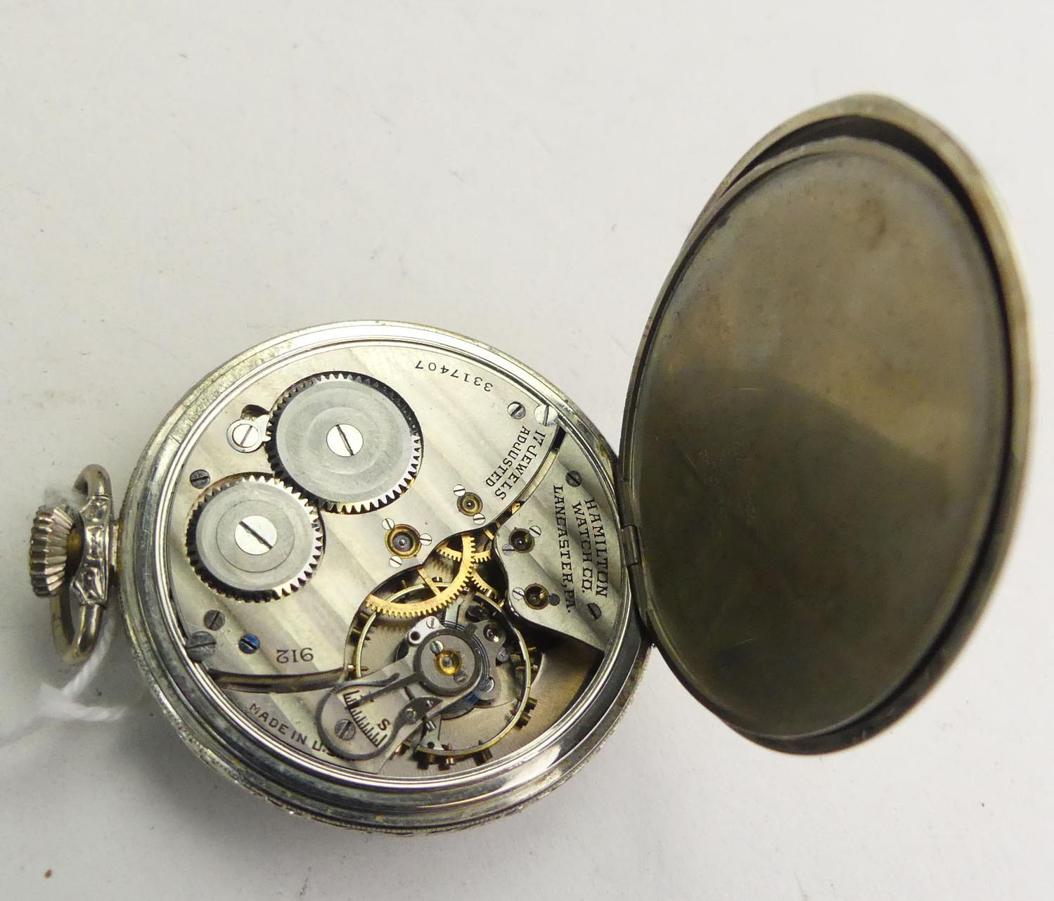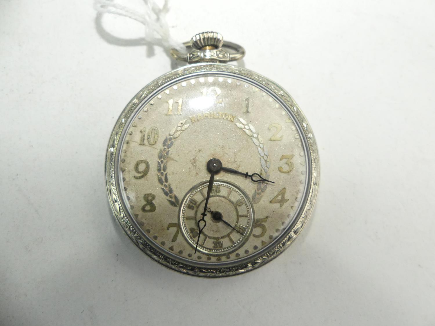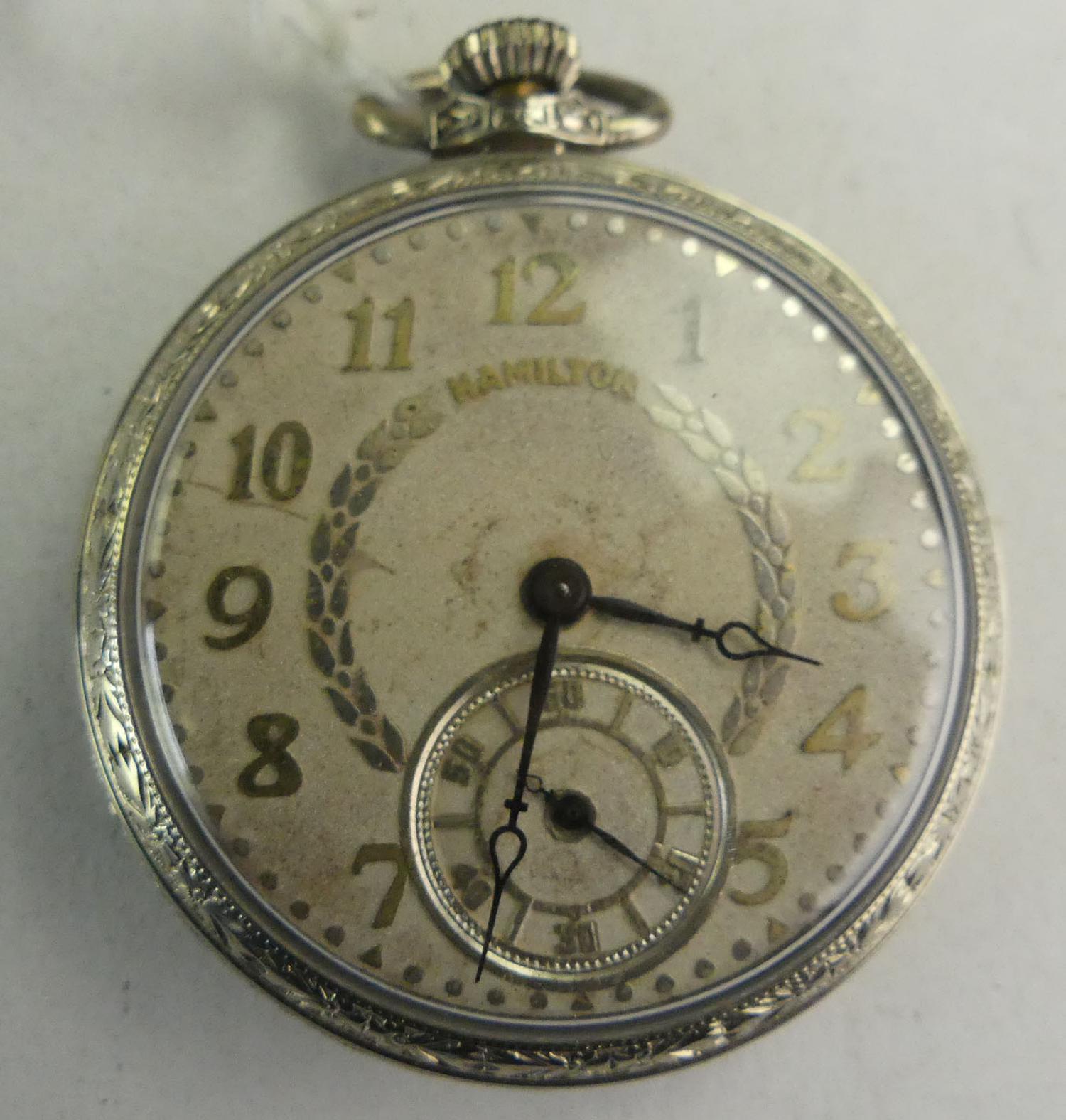 art deco hamilton white gold filled openfaced 17 jewel pocket watch, ser# 3317407