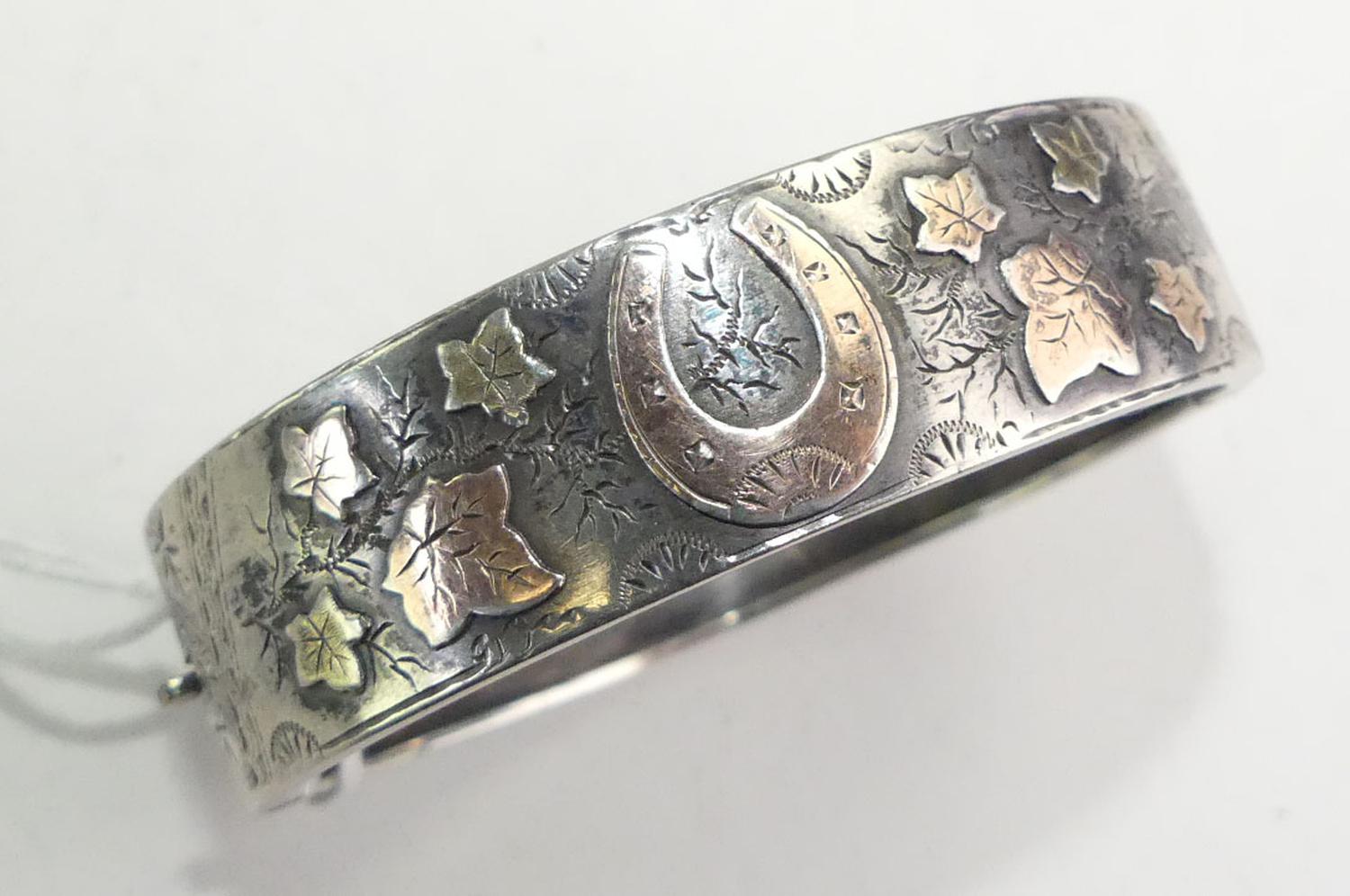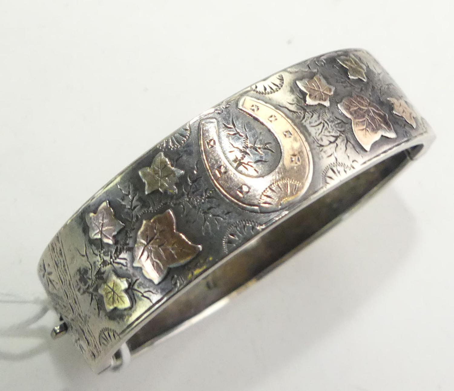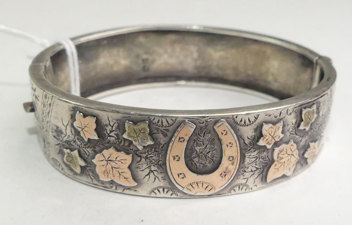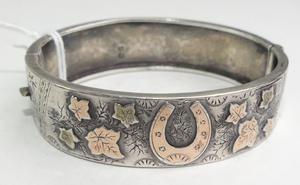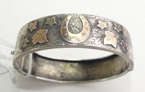 victorian sterling pink gold manchette bangle with horseshoe, 2 1/4" across, w/a 18 grams, sydenham brothers, circa 1889
