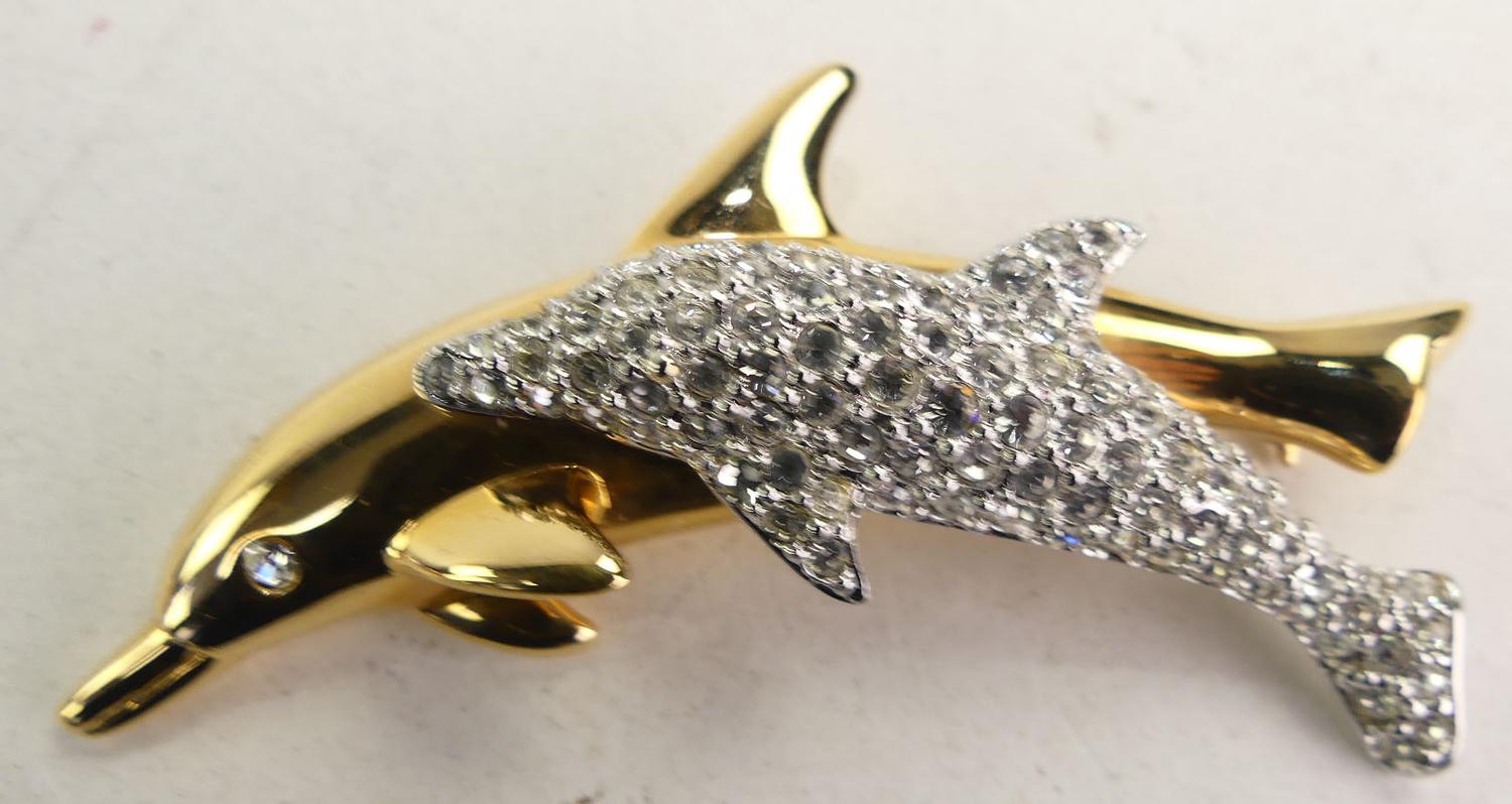 vintage swarovski signed dolphins brooch, width 2 1/2"