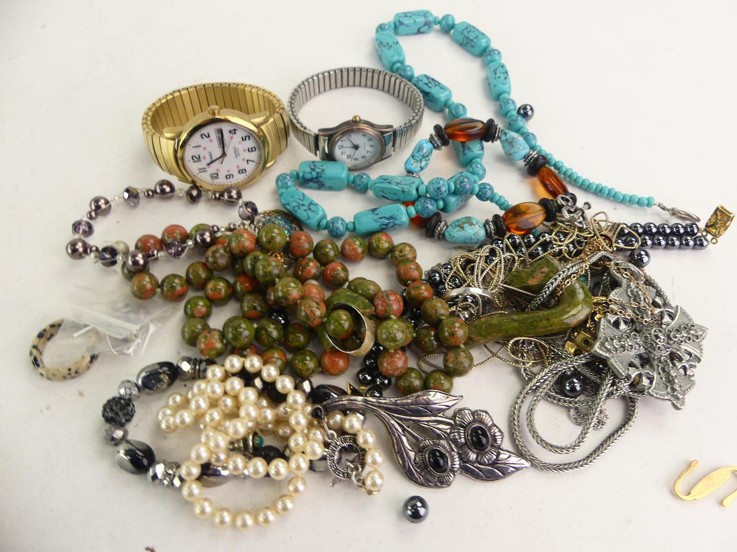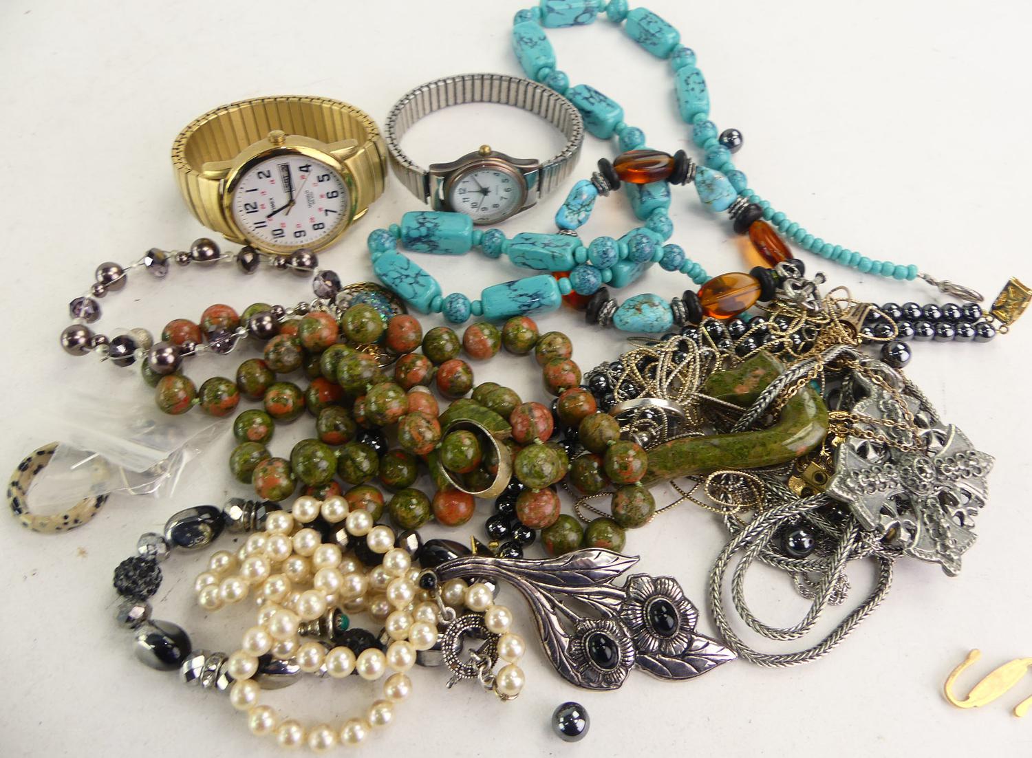 lot of silver, gold plated, costume and bead jewelry with two quartz watches
