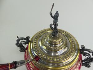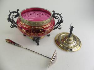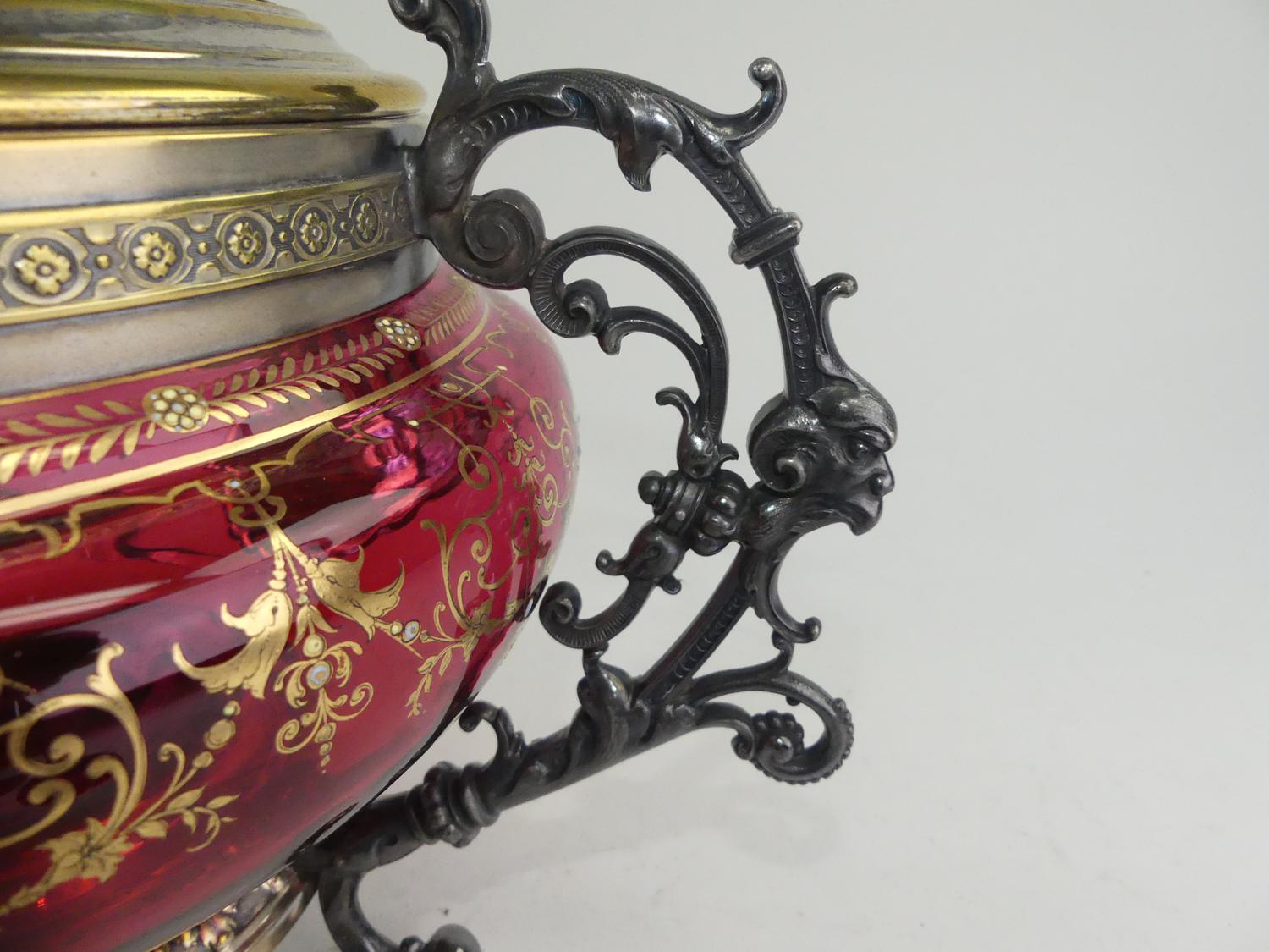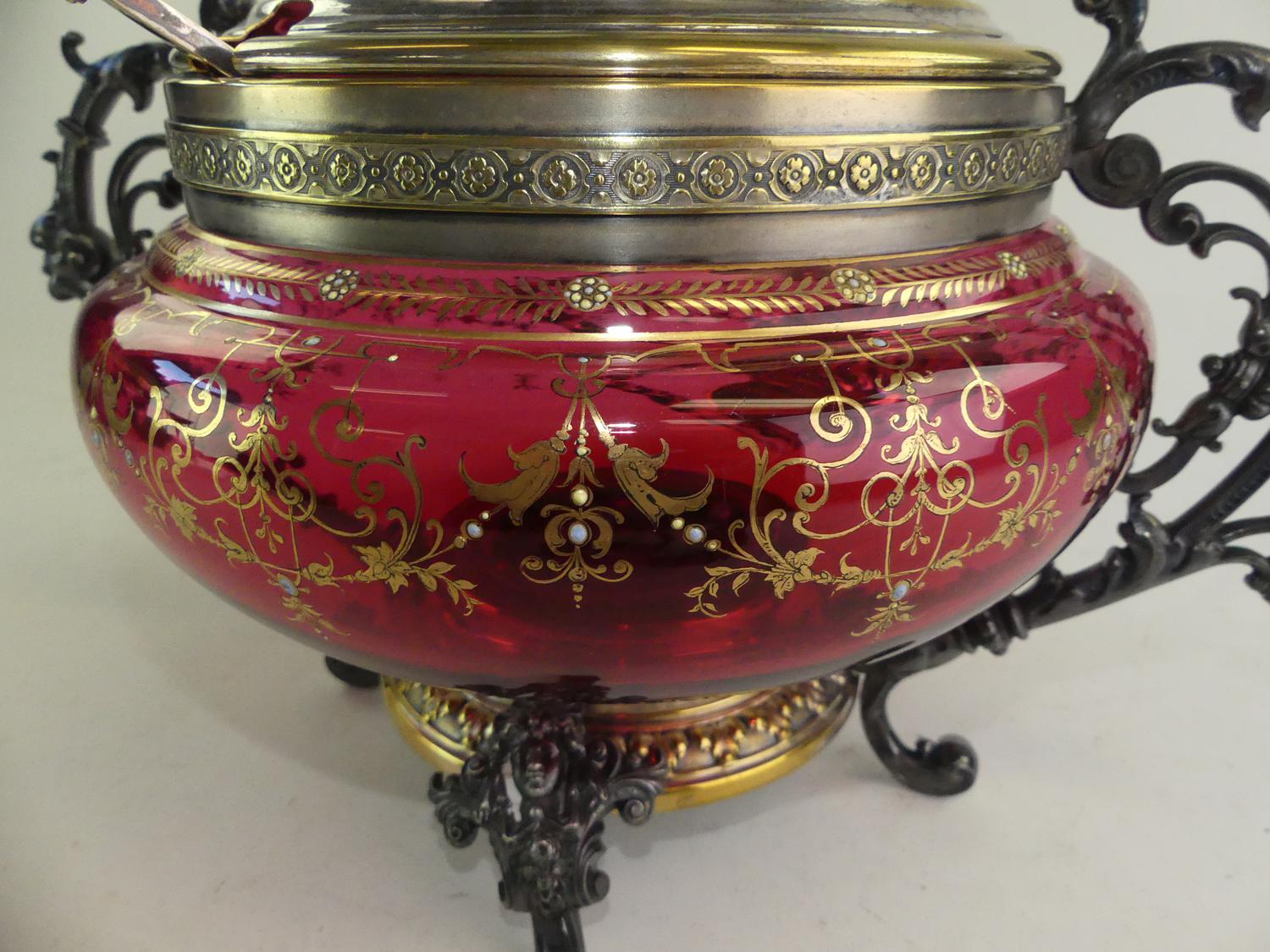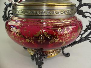 gilt decorated cranberry glass covered bowl, 13" x 14"