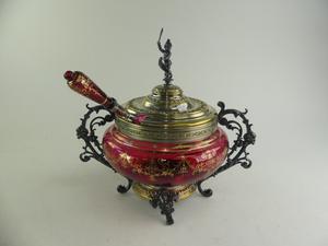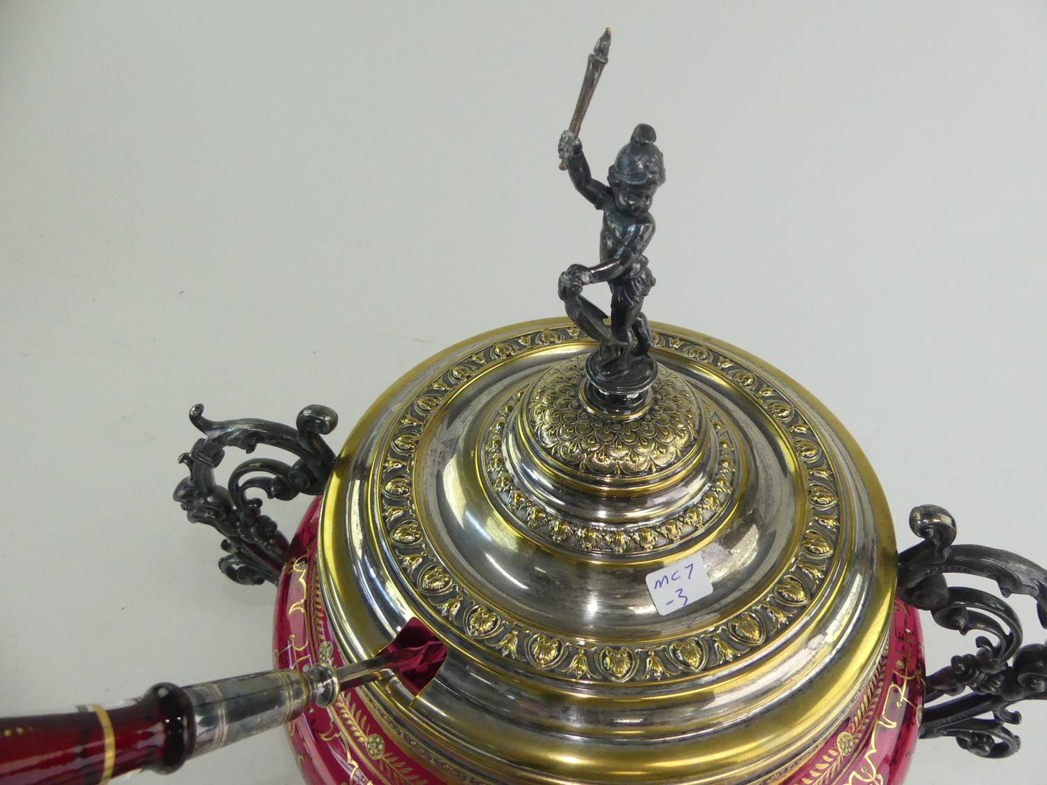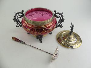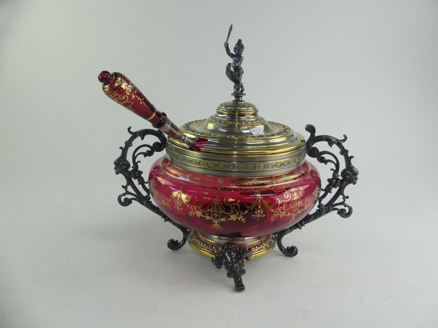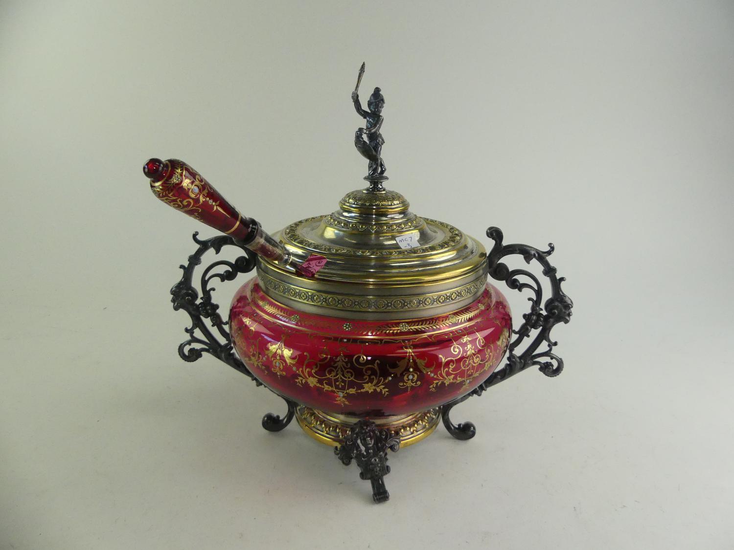 gilt decorated cranberry glass covered bowl, 13" x 14"