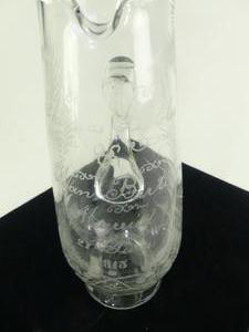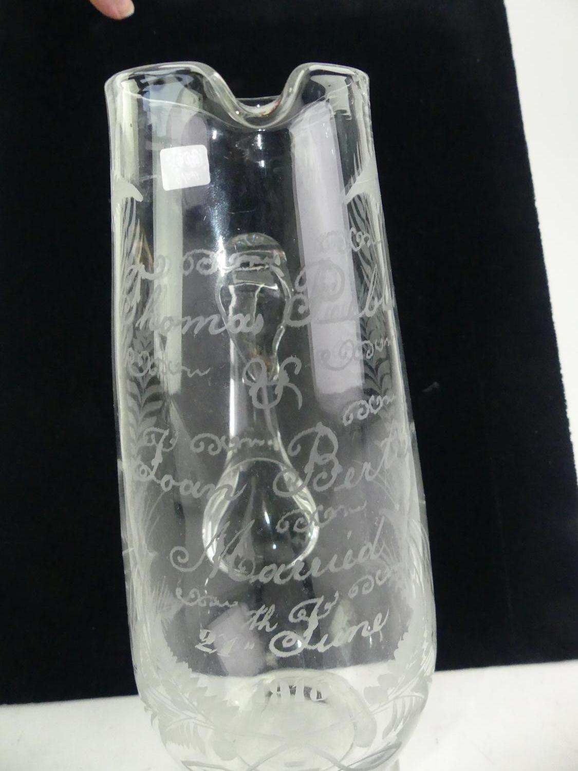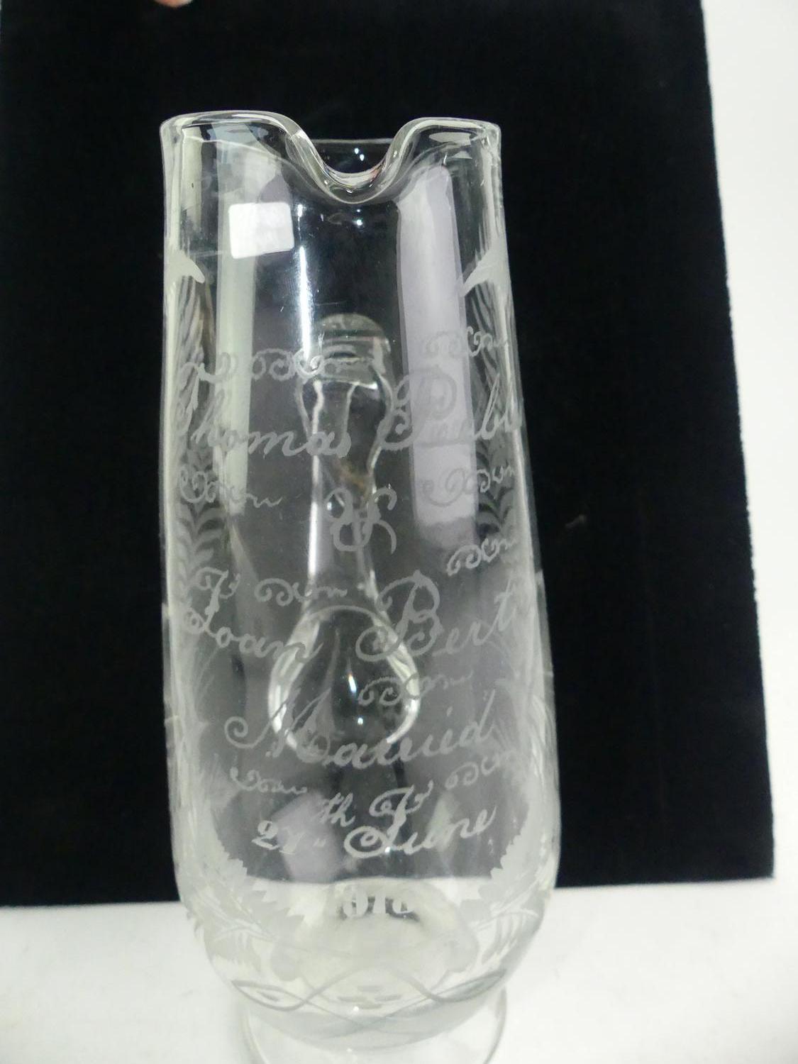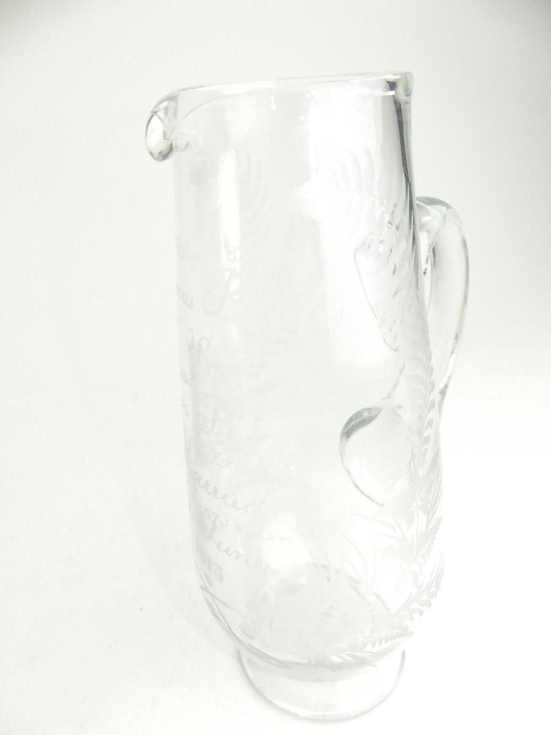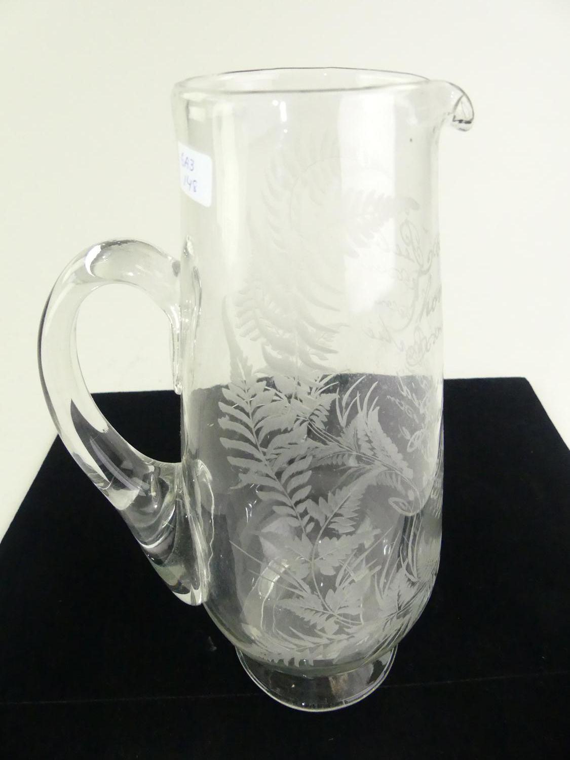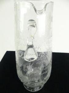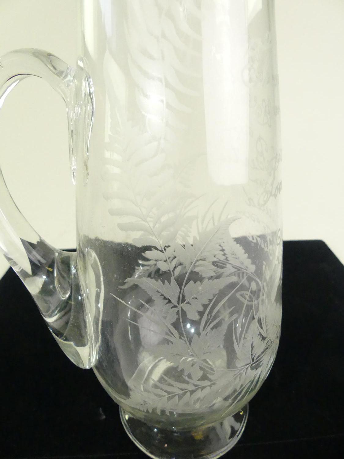 antique etched glass presentation jug, dated 1913, 10 1/4"