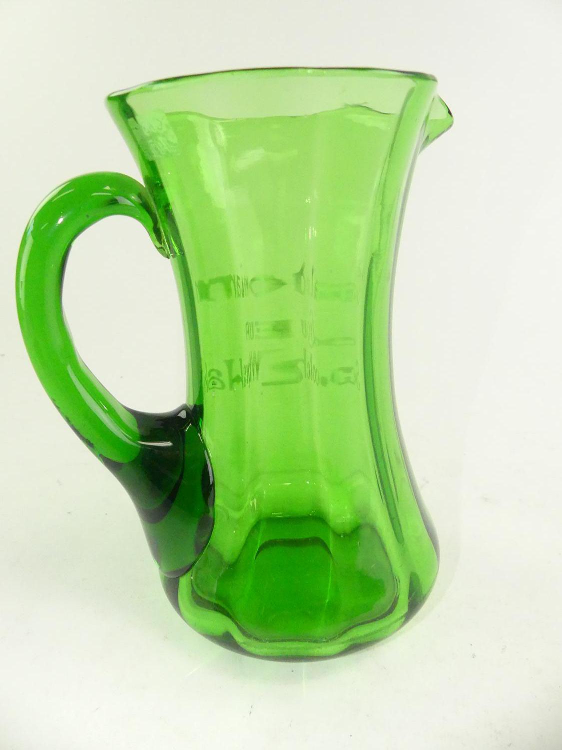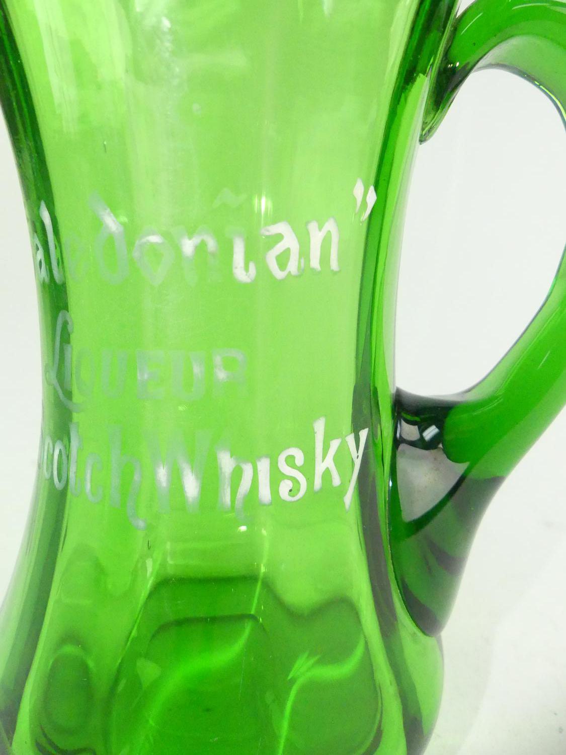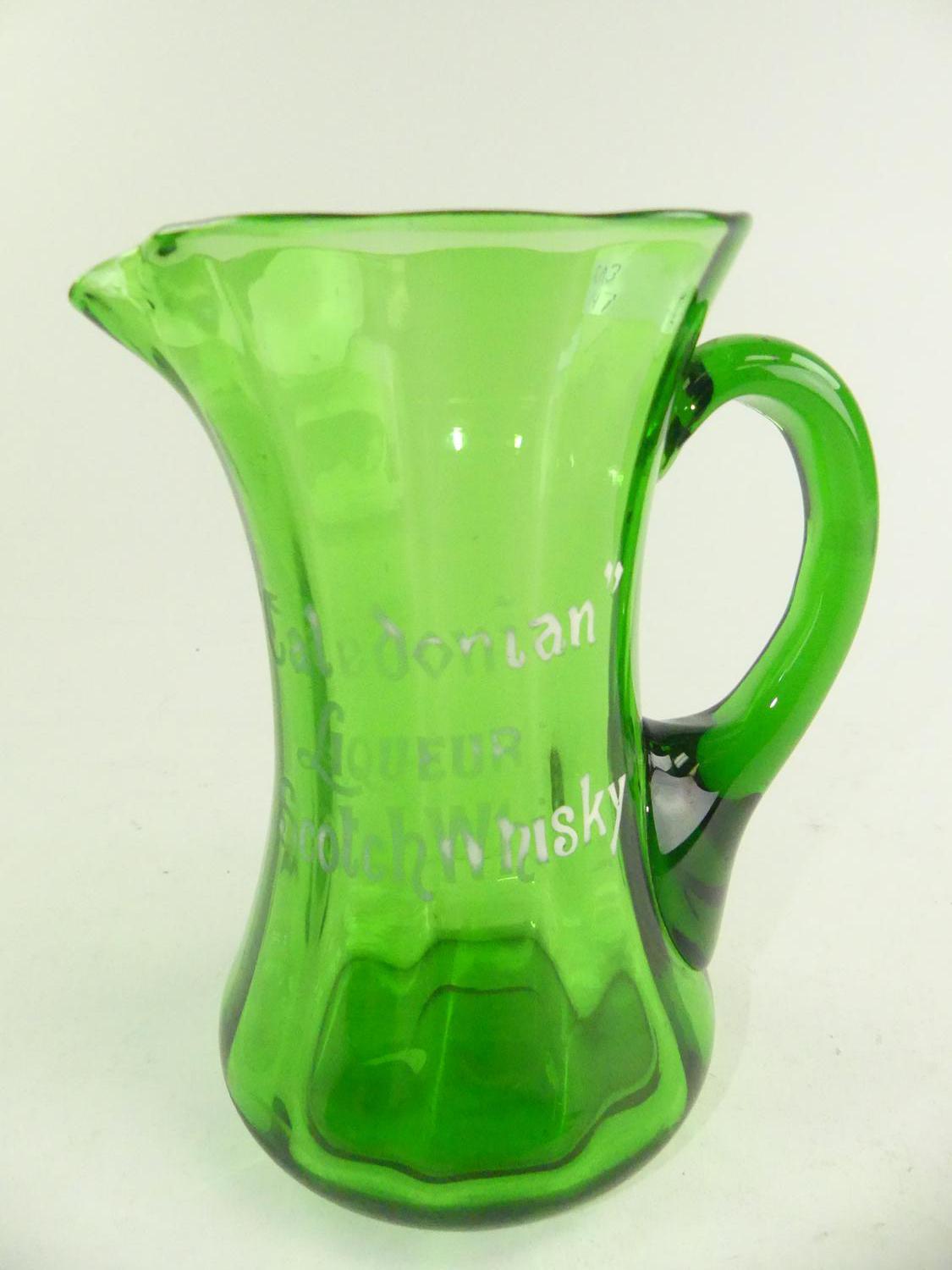 "caledonian scotch whiskey" green glass pitcher, ht 7 3/4"