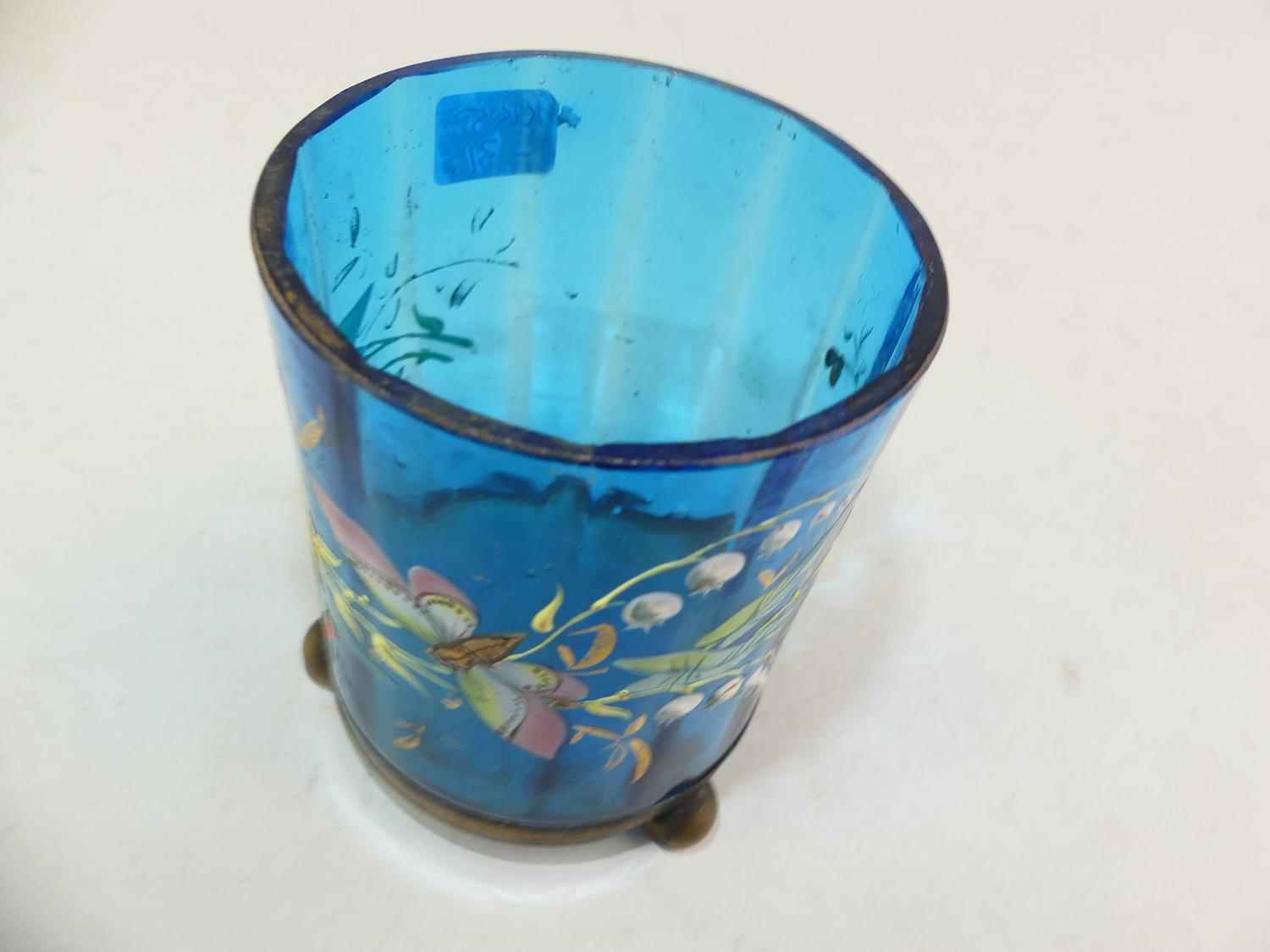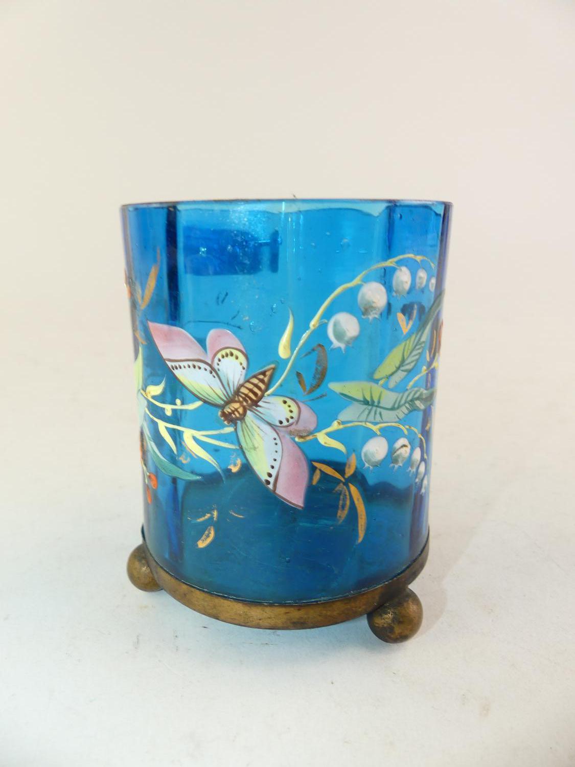 art nouveau panted blue glass vase, ht 4"