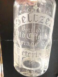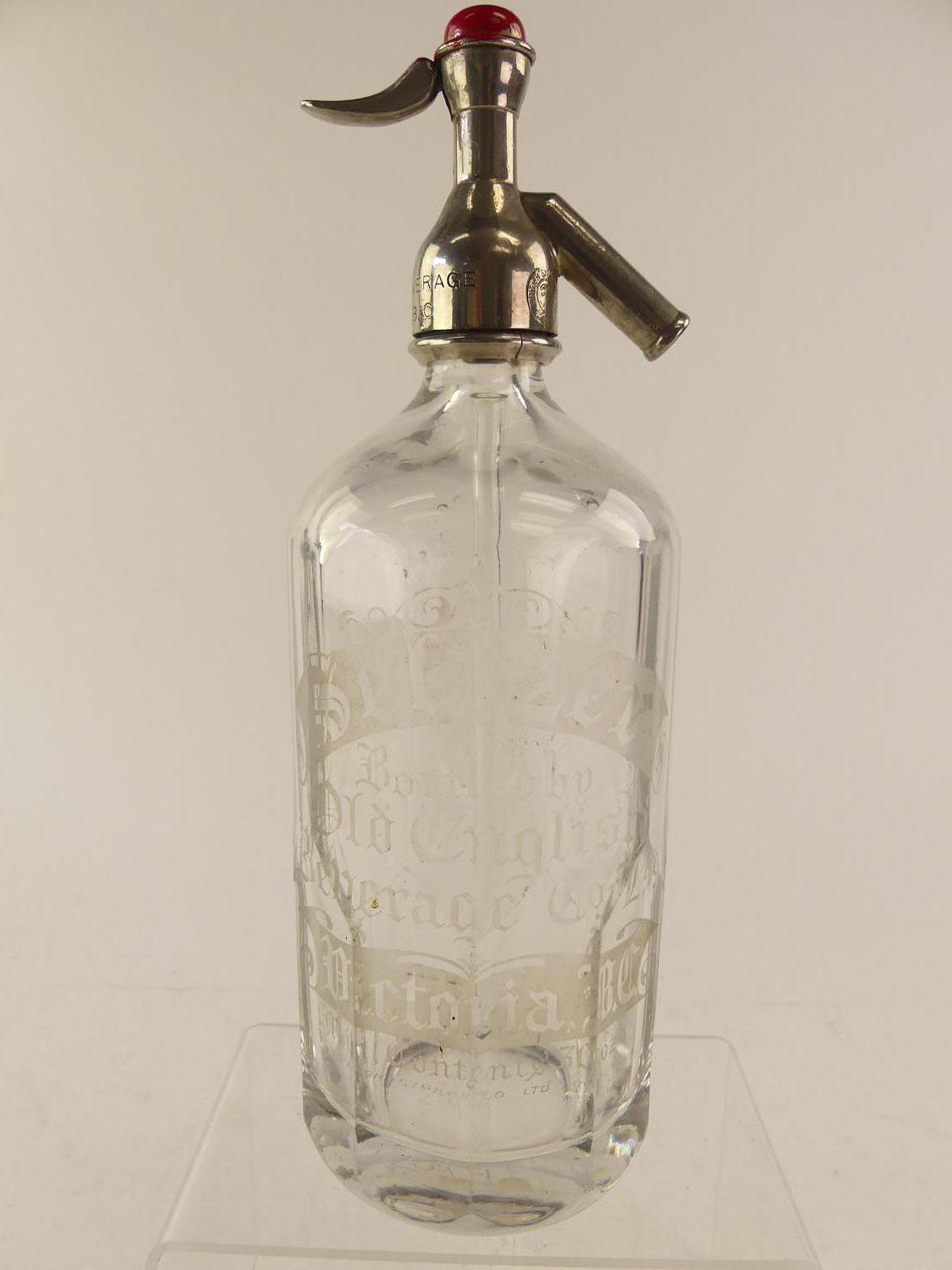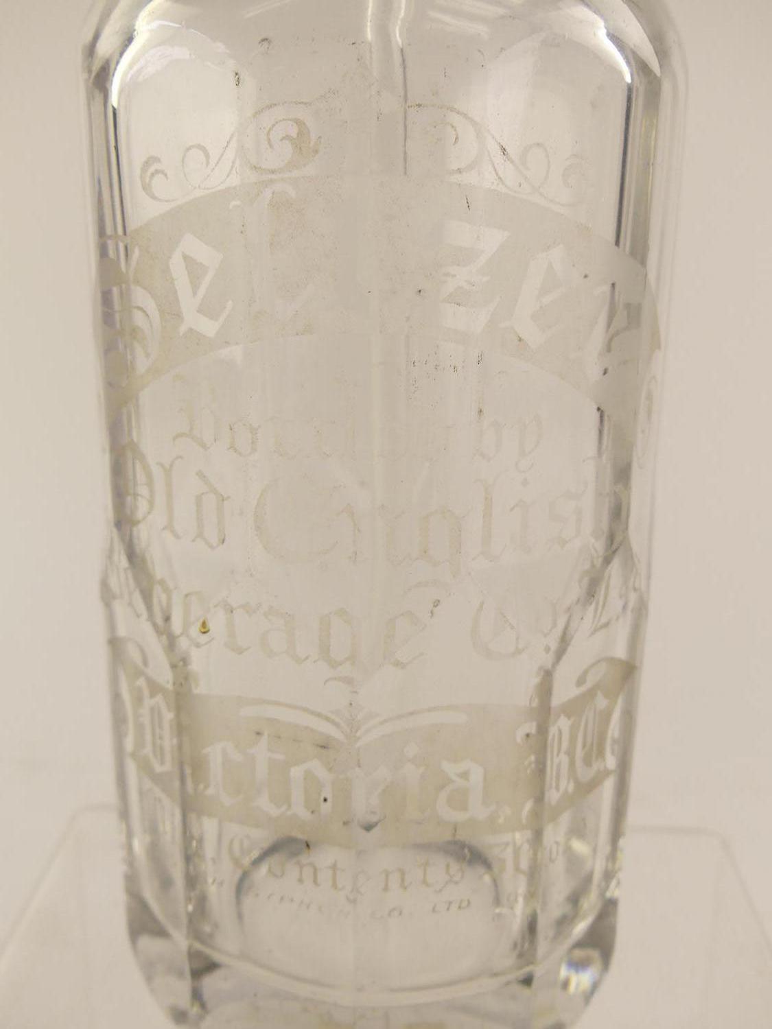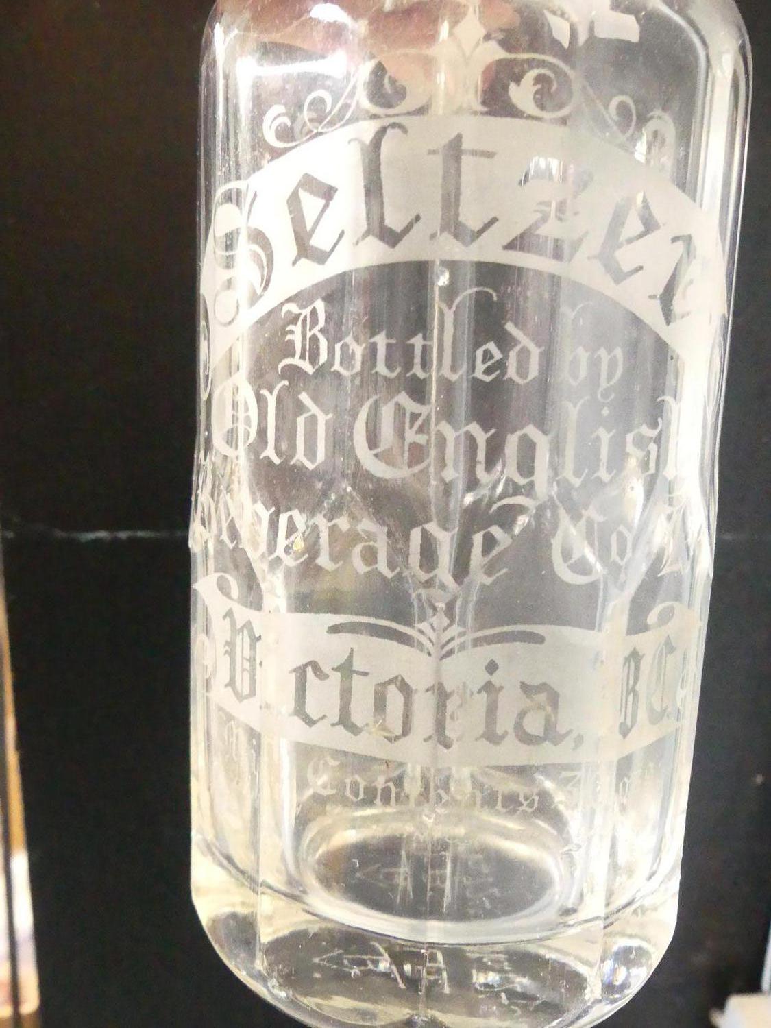 antique seltzer bottle - "bottled by old english beverage co. ltd, victoria, bc" height 12"