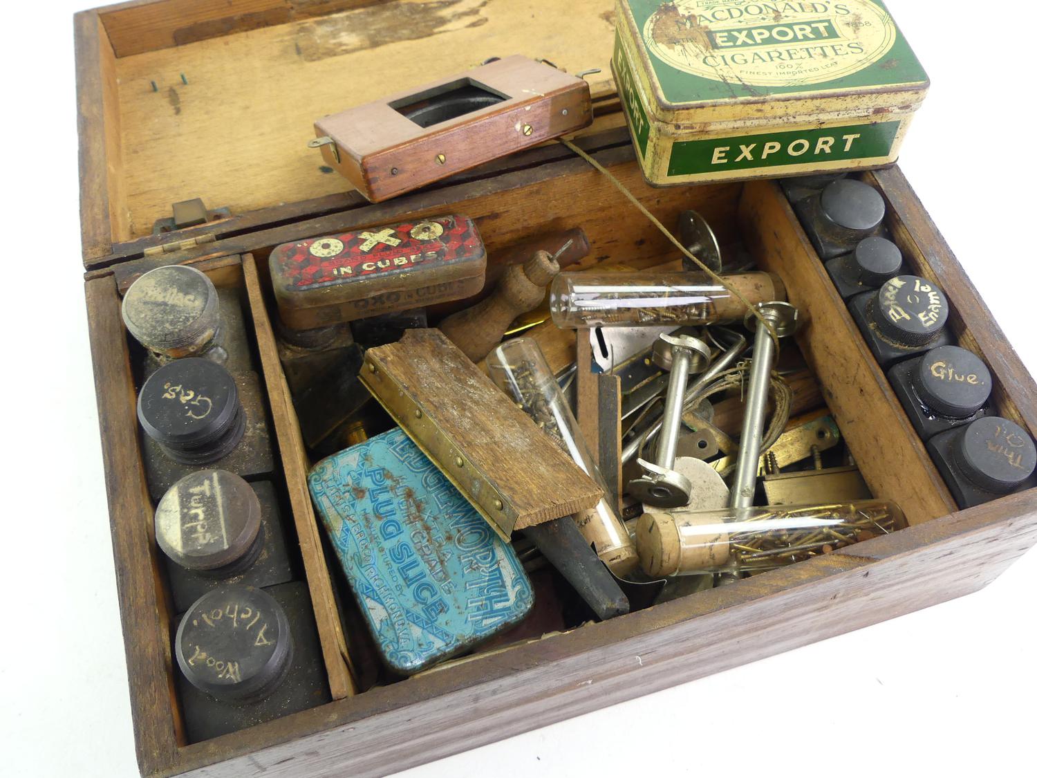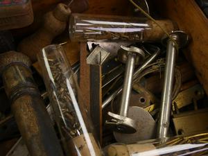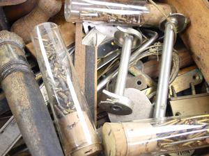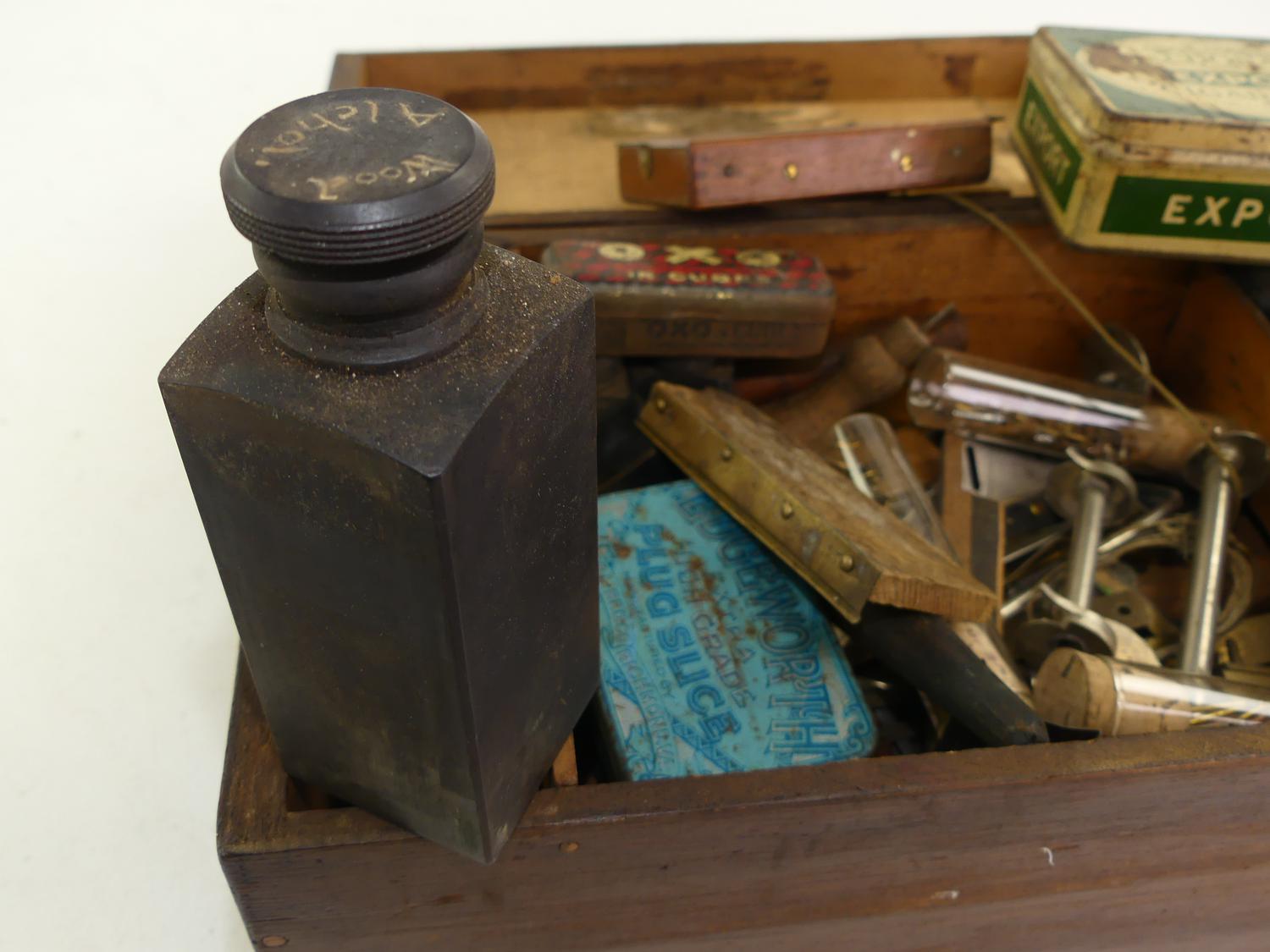antique box of brass fittings and parts, bakelite bottles, etc.
