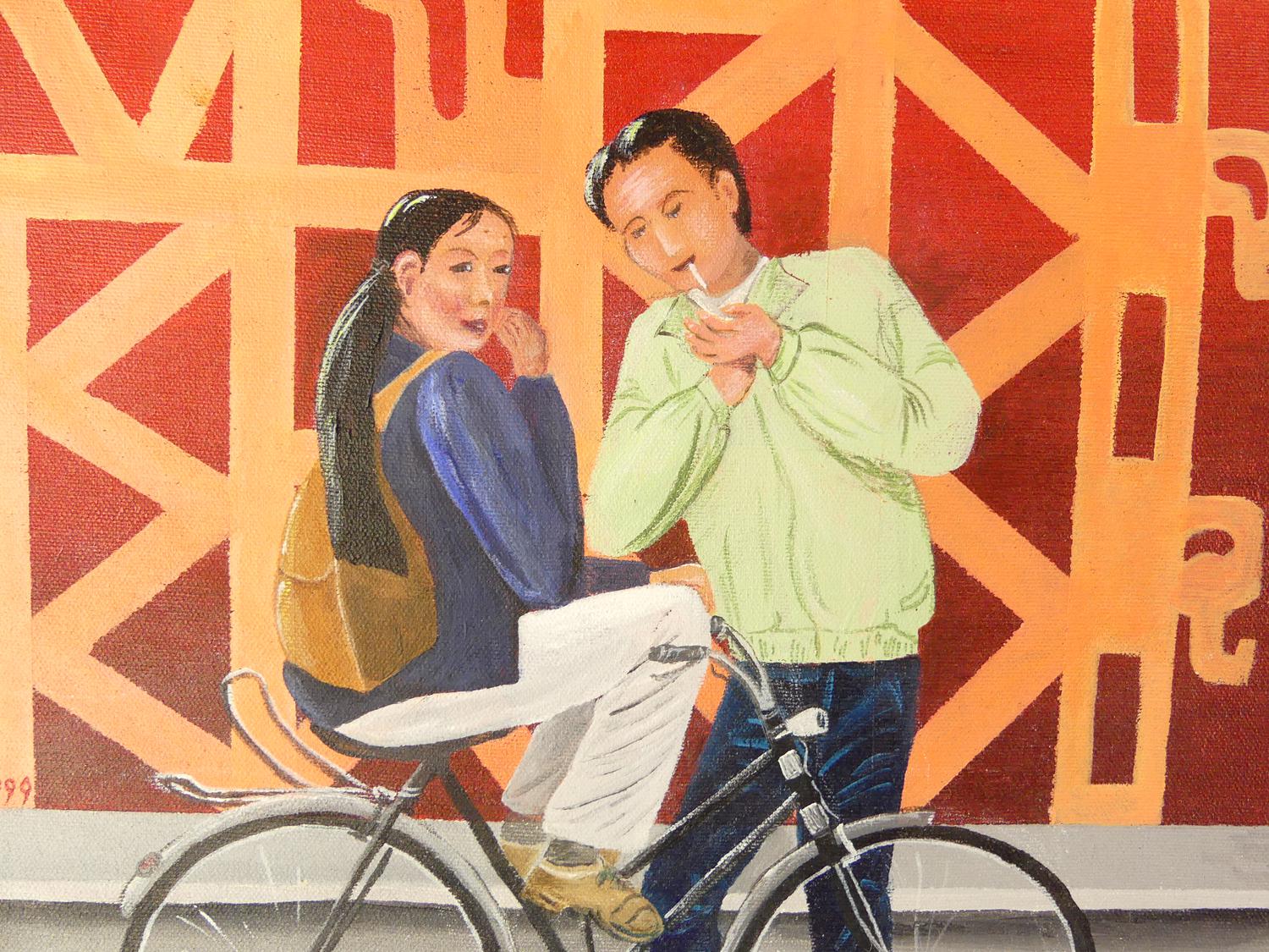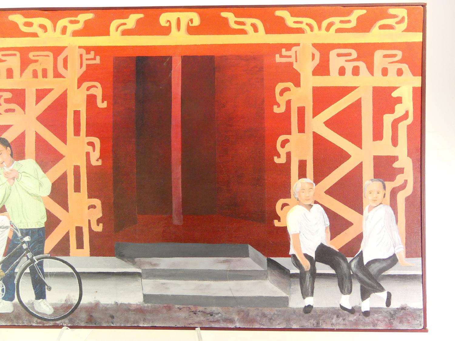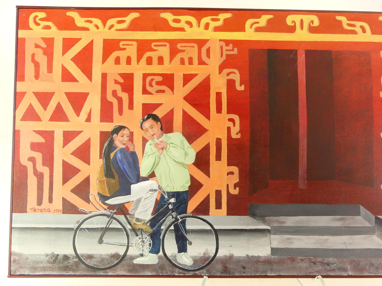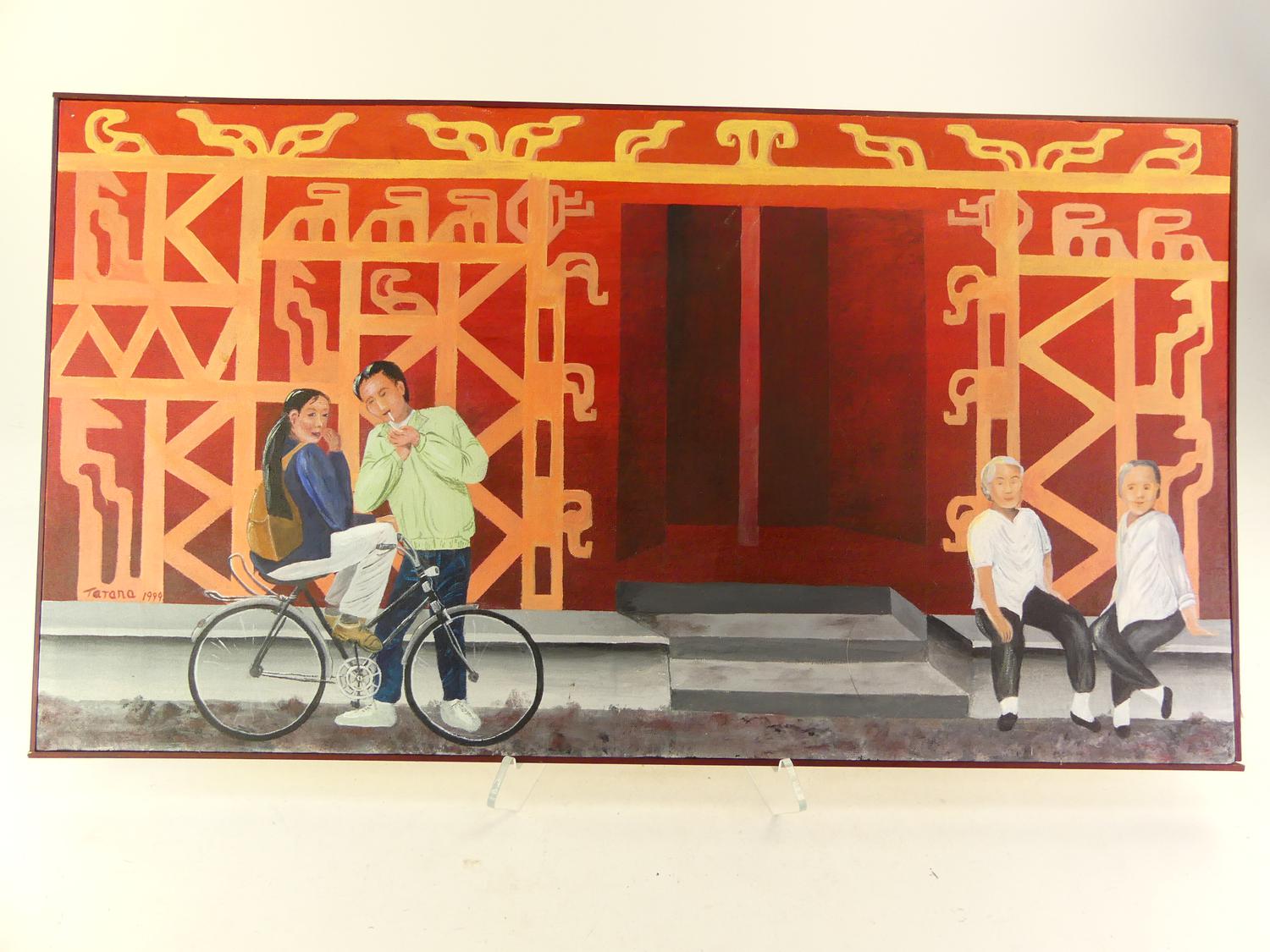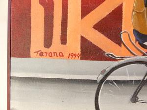 taruna, d.1999, oil on canvas, 18" x 33", "street scene"
