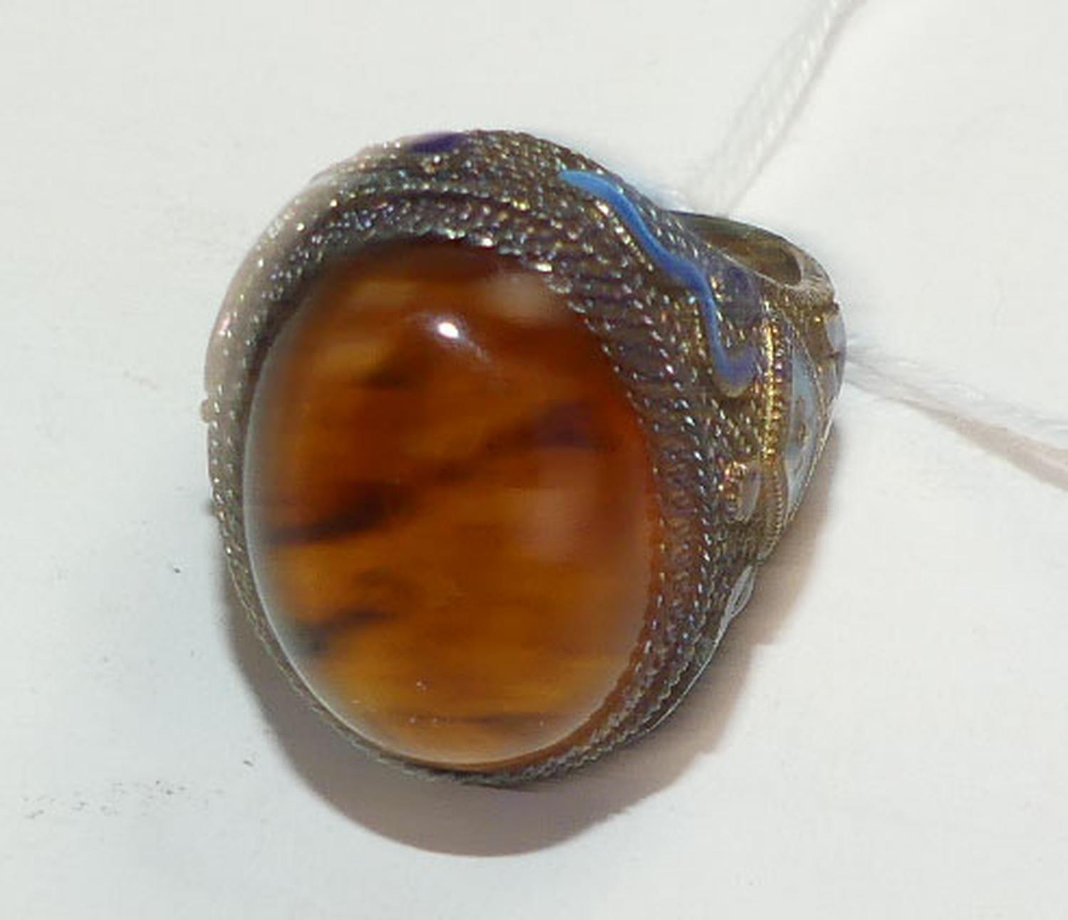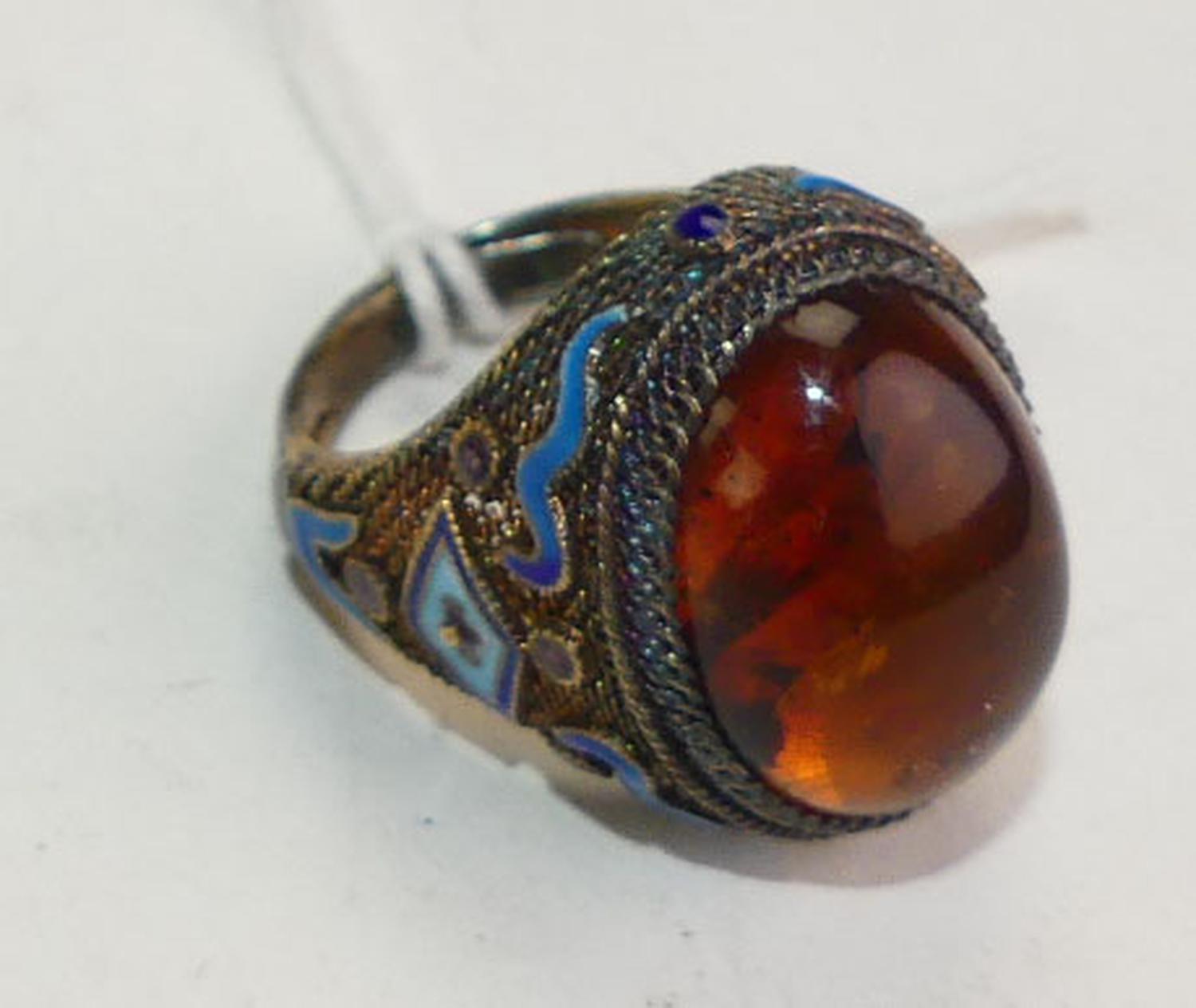 antique chinese silver vermeil enamel amber ring, size 7, adjustable