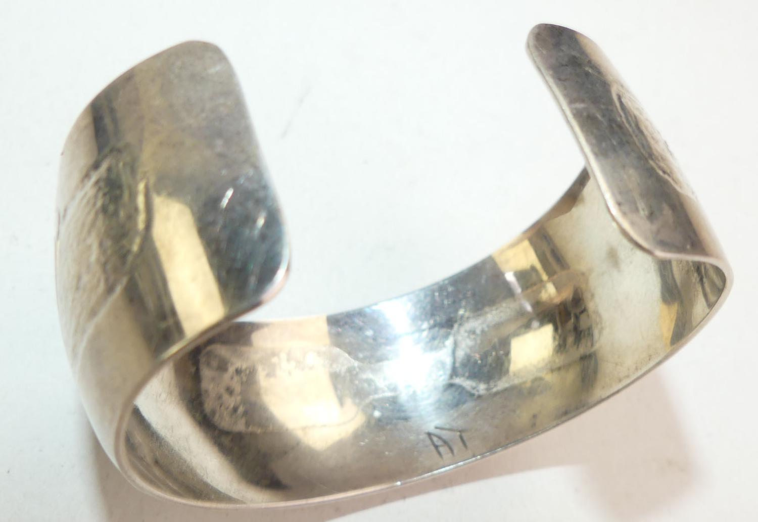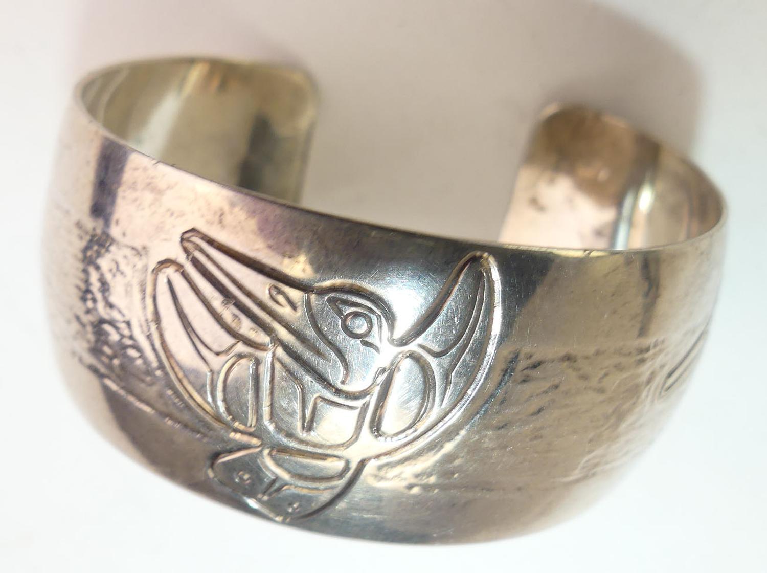 first nations sterling silver hummingbird cuff bracelet, signed at, width 2 1/4" across