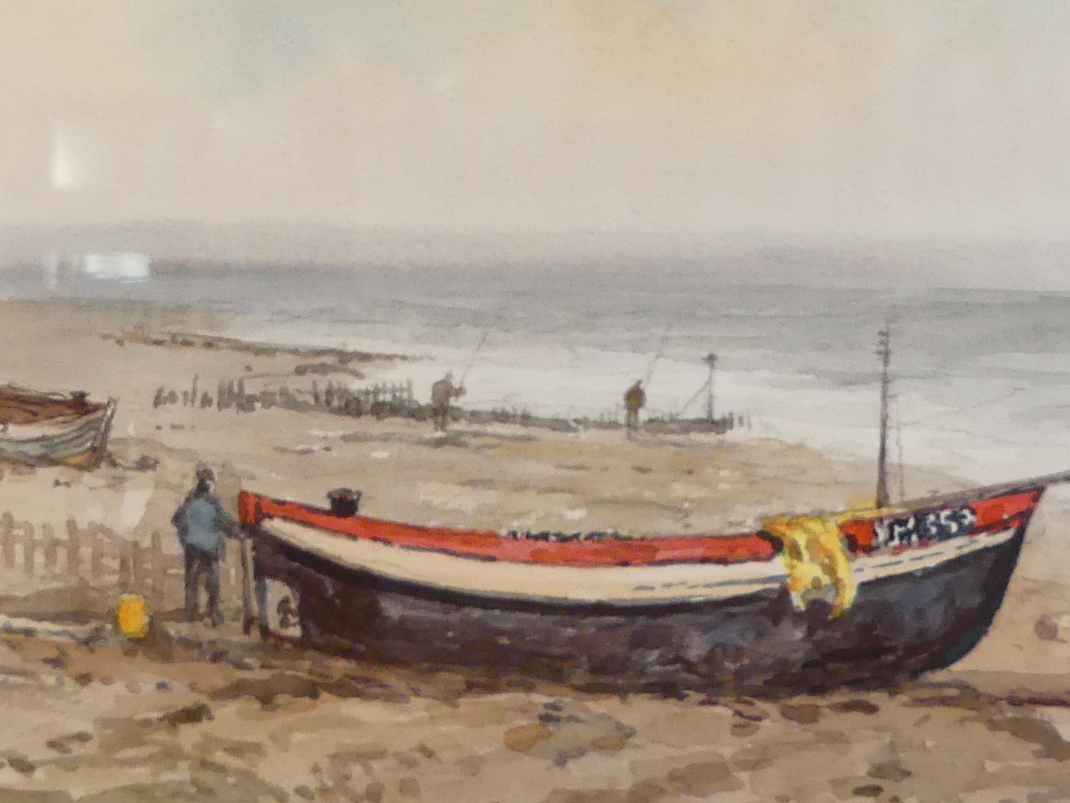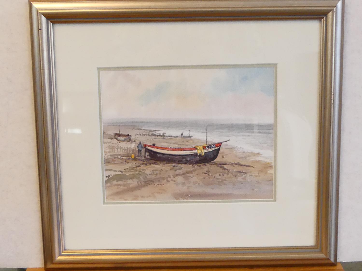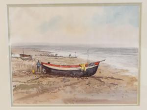 keith johnson (1931-2018), watercolour, 9" x 11 1/2", "beach scene with boat"