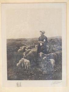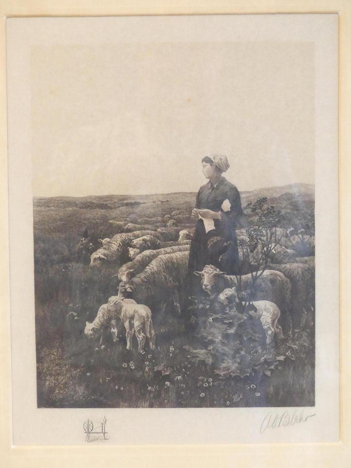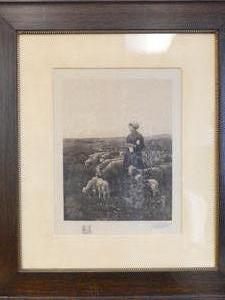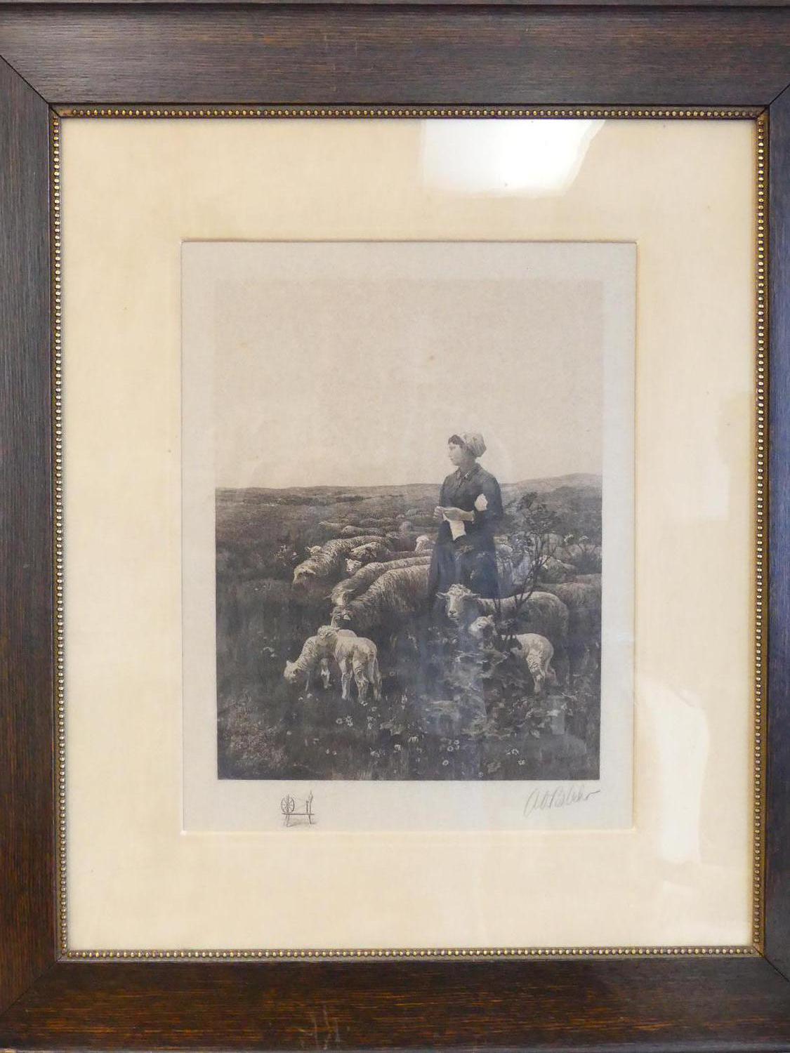 antique parcel gilt oak framed lithograph after luigi chialiva (1842-1914), overall 30" x 26", "the gentle sheperdess"