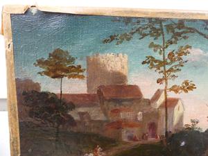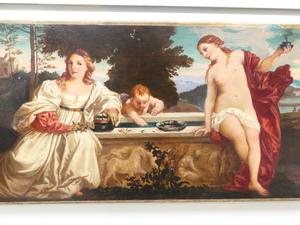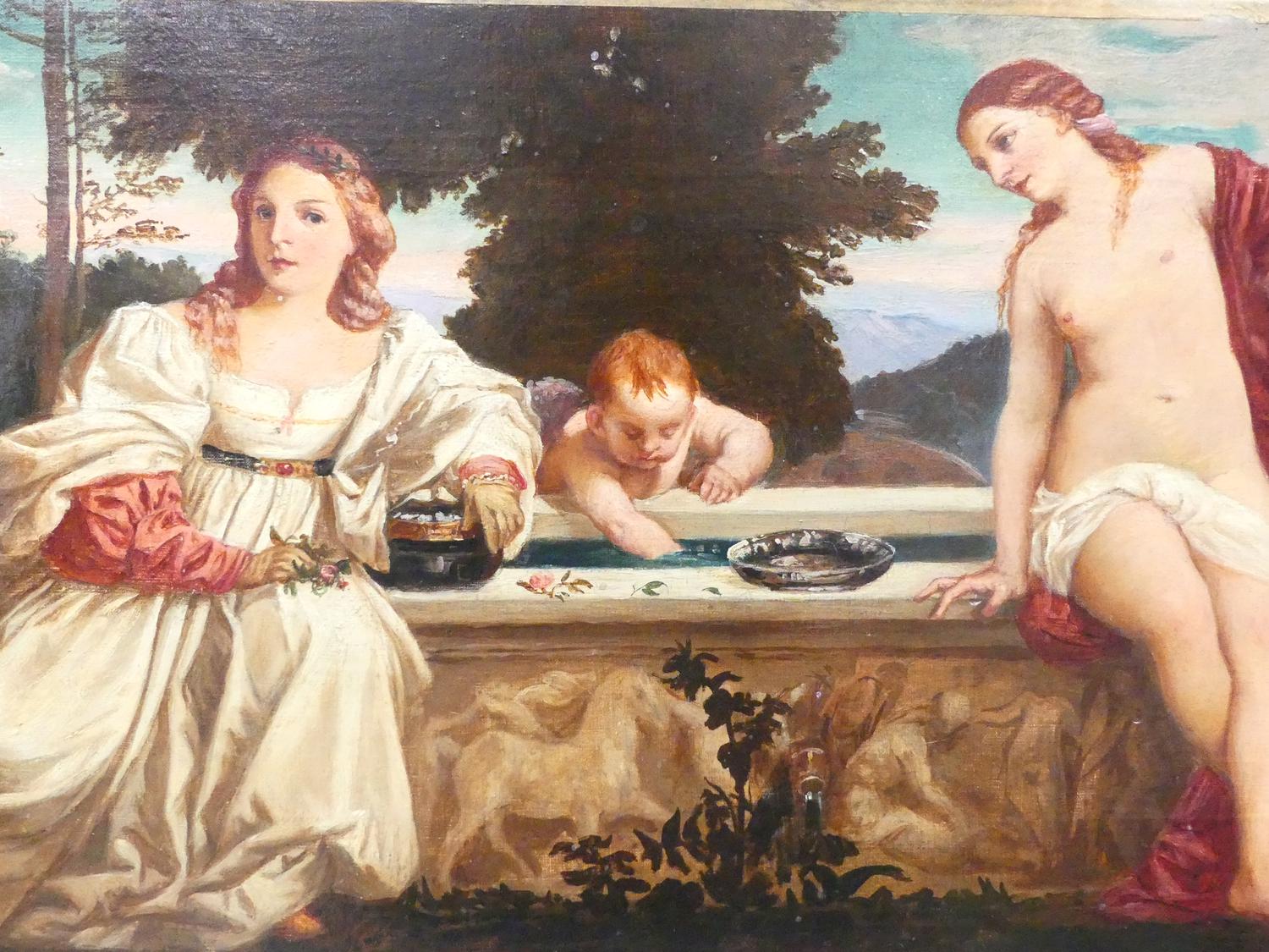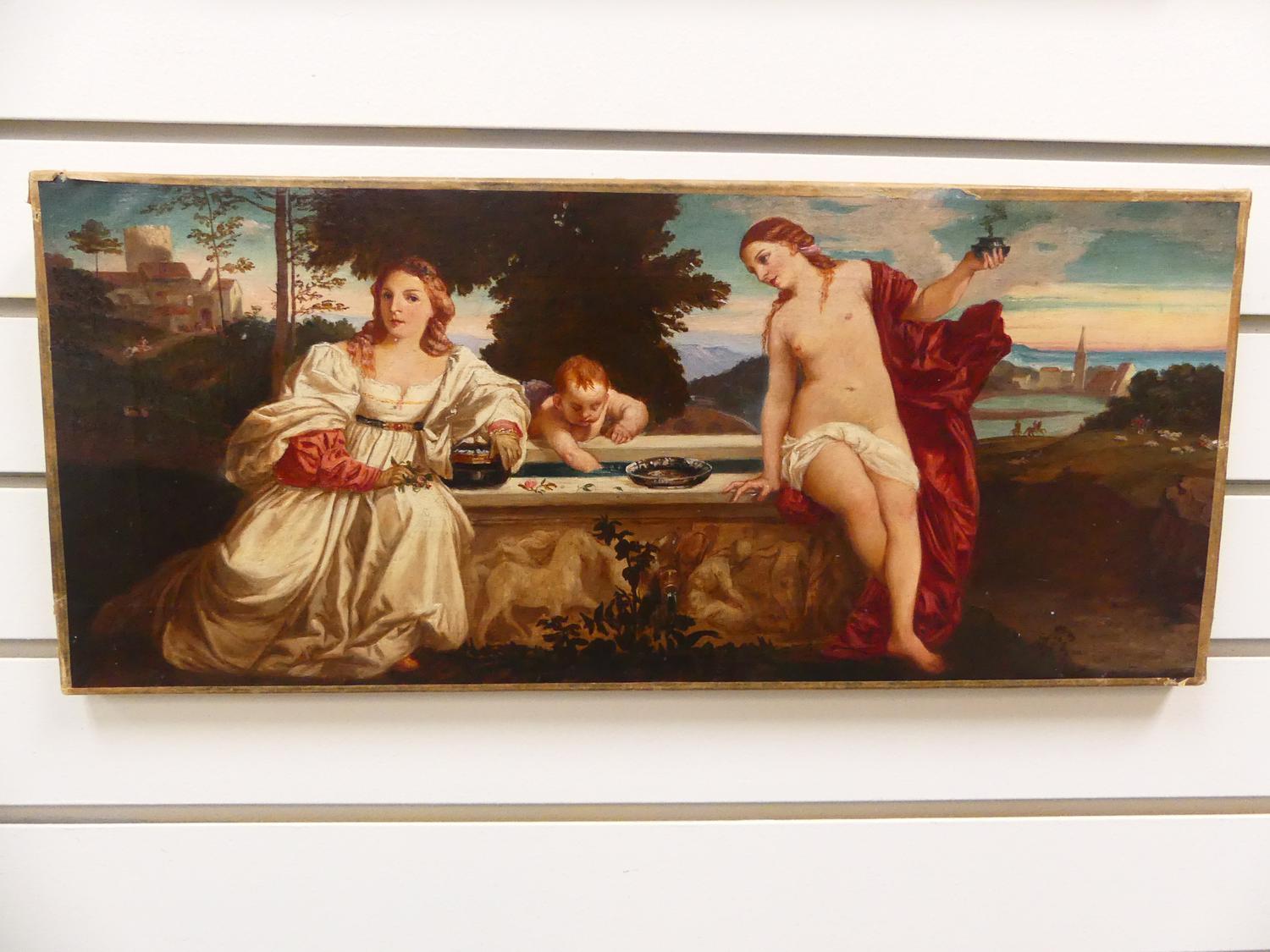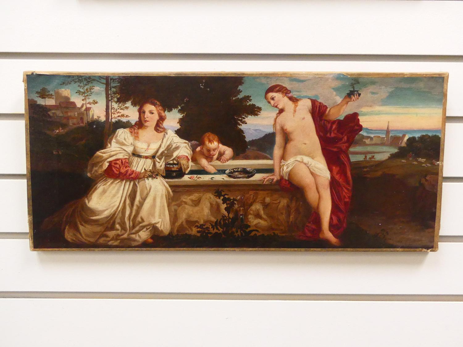after titian circa 1514, early 20th century oil painting 8 1/2" x 19", "sacred and profound love"