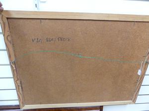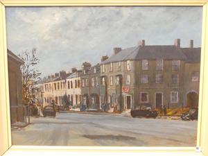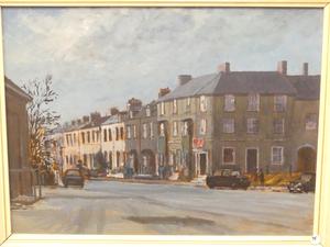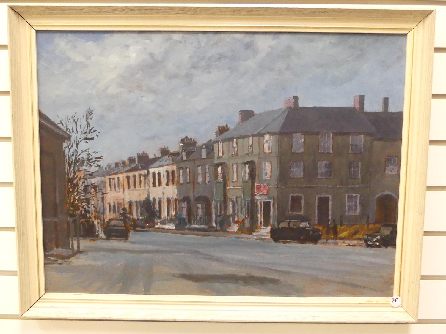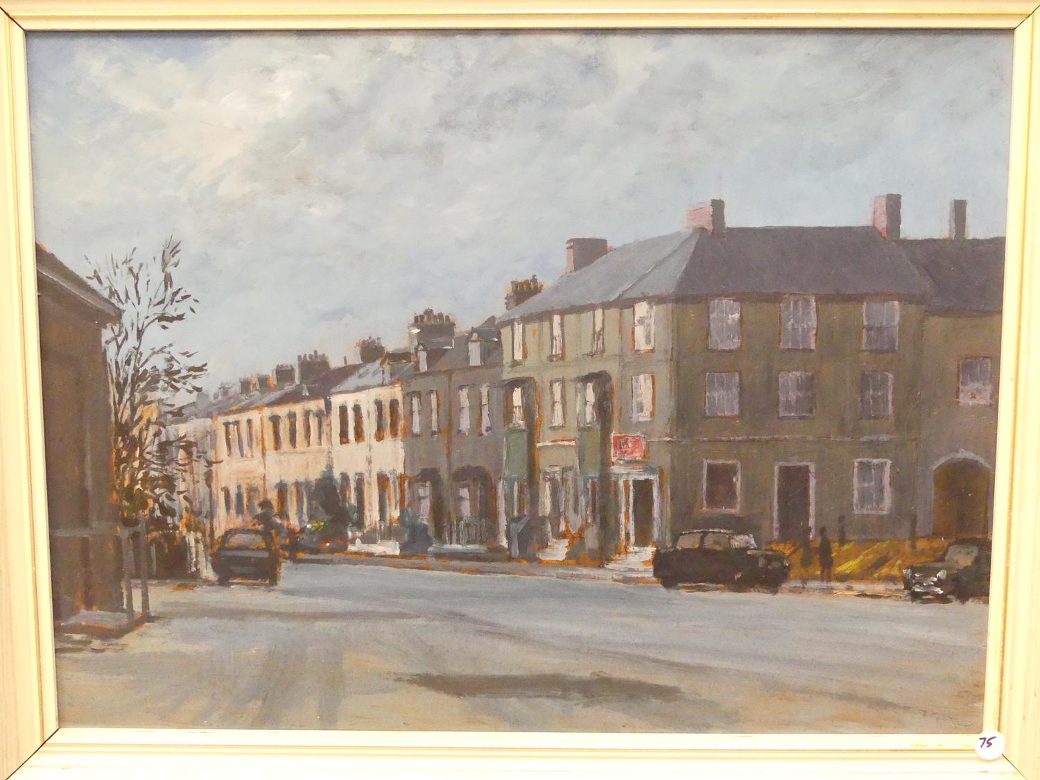 unisgned mid 20th century oil on board, 17 1/2" x 23 1/2", "plymouth street scene"