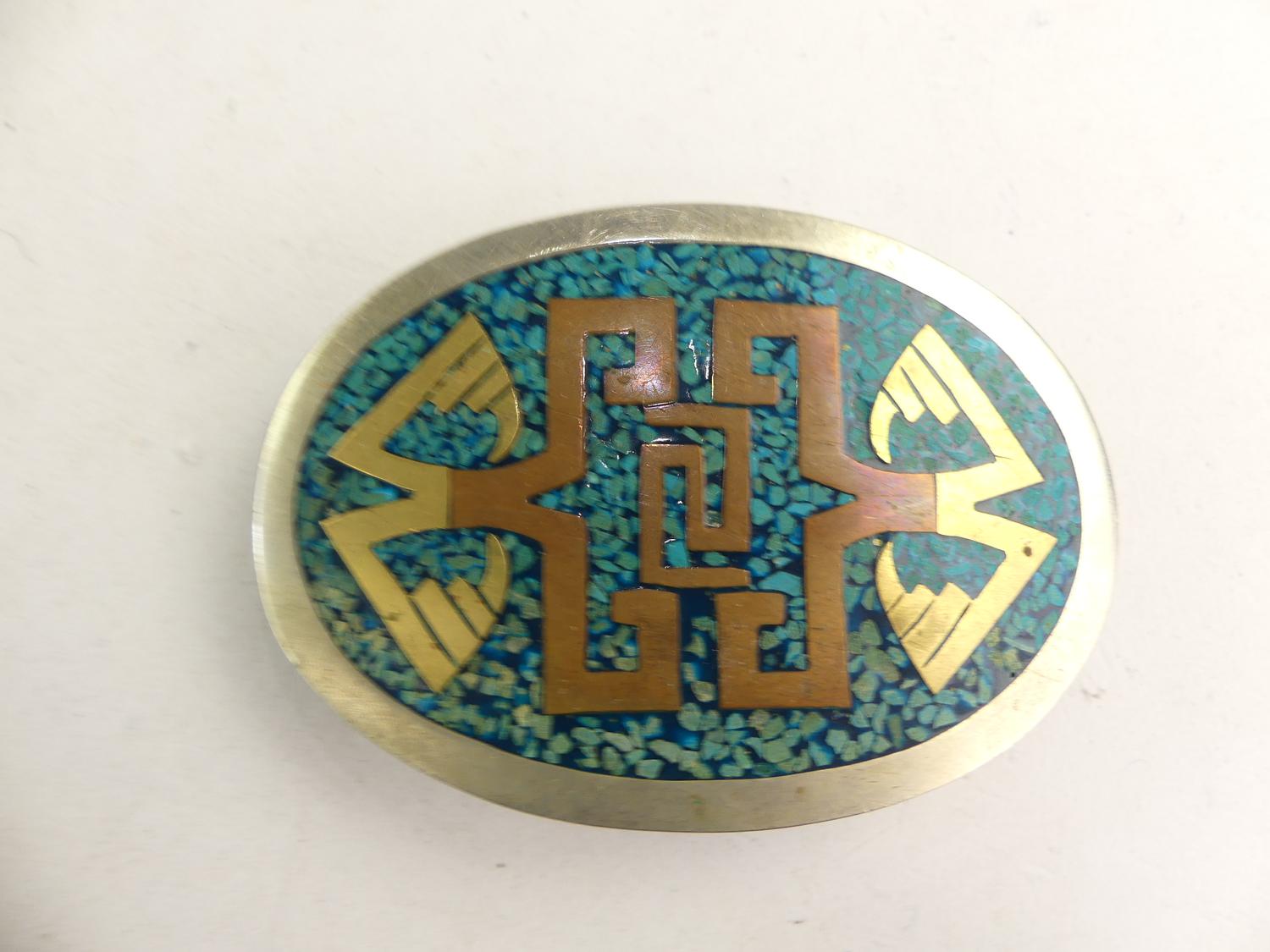 mexican alpaca inlaid belt buckle 3 1/2" x 2 1/4"