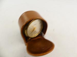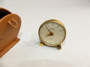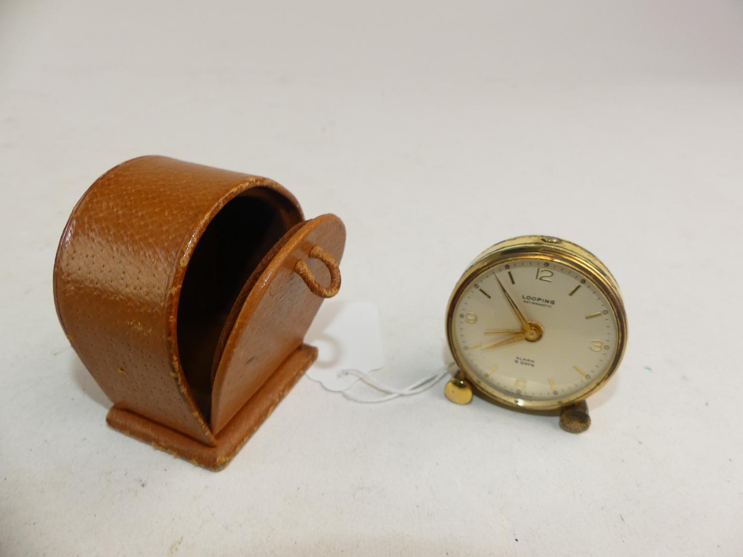 looping automatic swiss 8 day alarm clock with original travel case, ht 2"