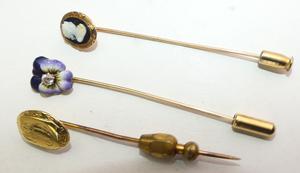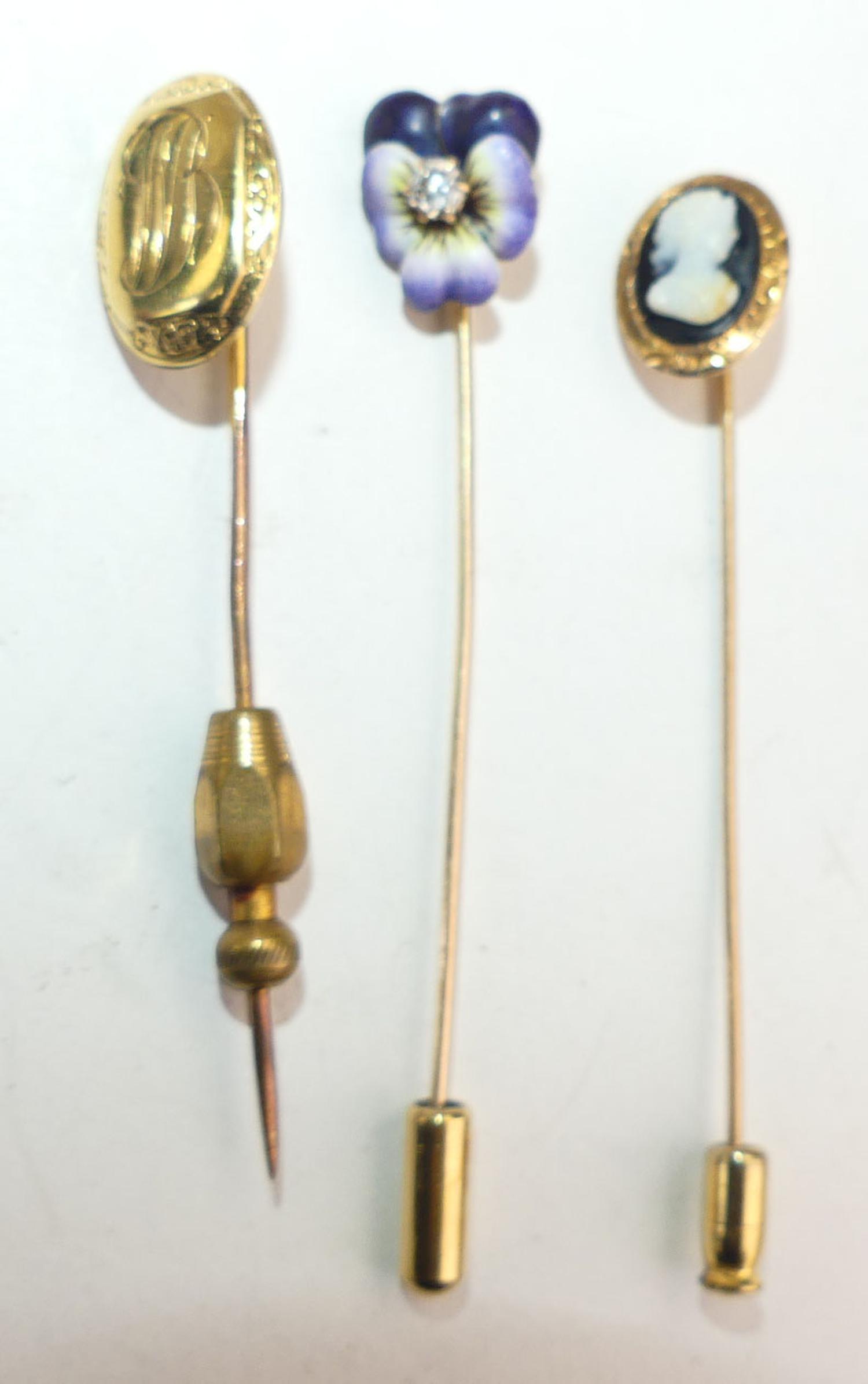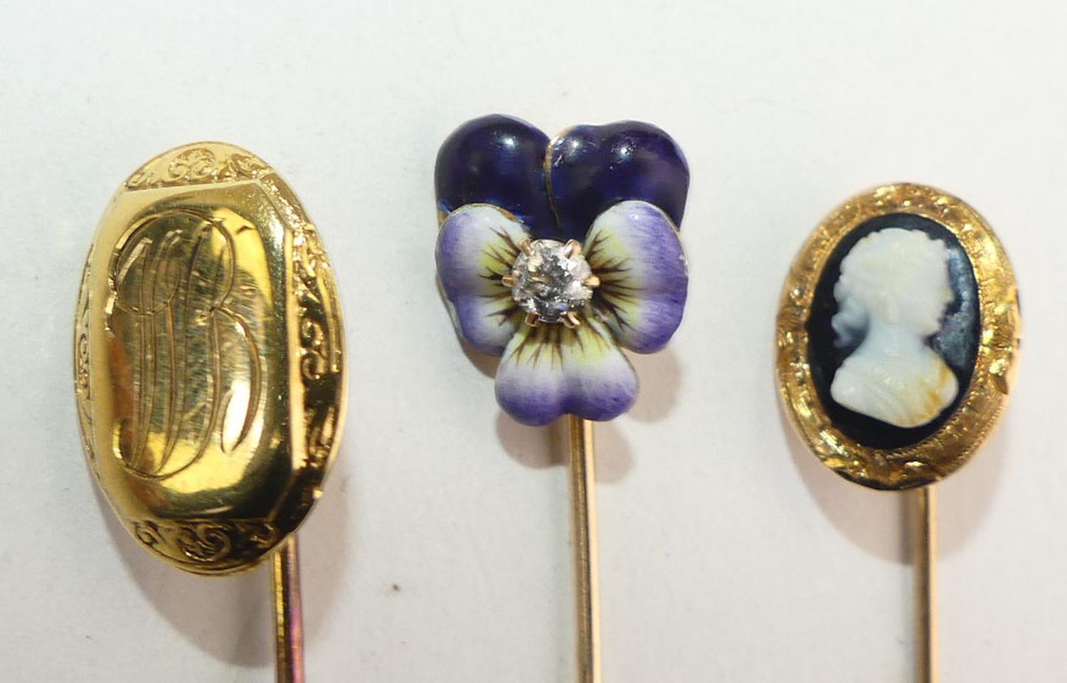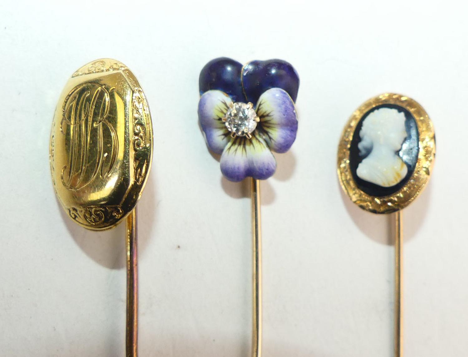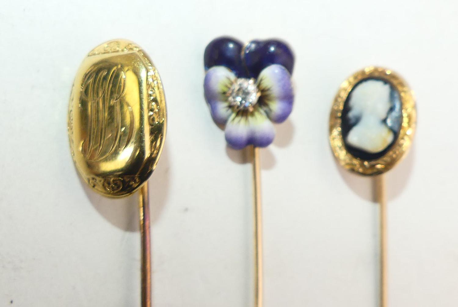 9k gold sardonyx cameo pin, 10k gold engraved pin, with 10k enamel diamond pansy stickpins, stoppers are NOT gold