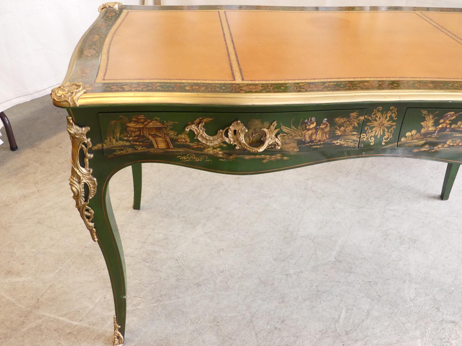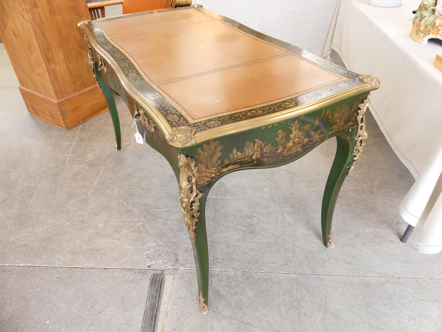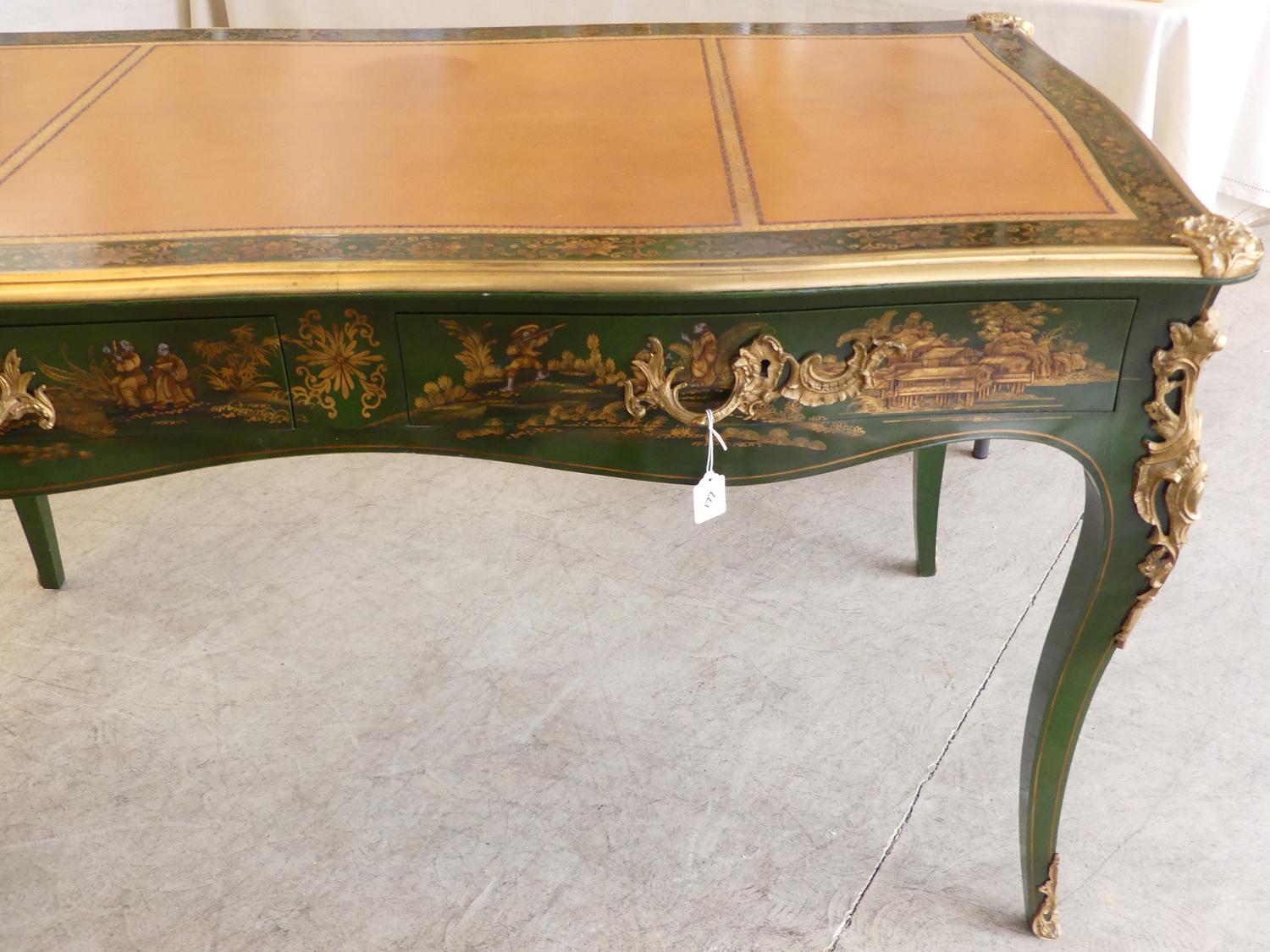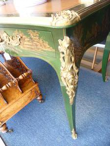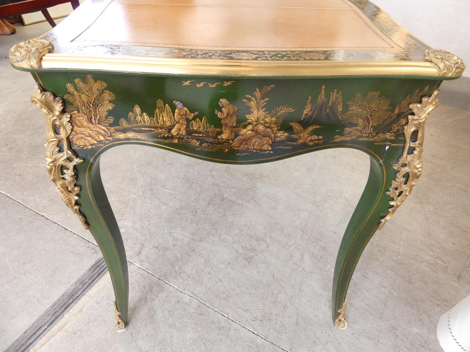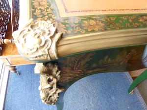 having a gilt tooled leather inset writing surface surrounded by gilded palmettes and a stepped brass moulded edge, above a pair of drawers in the fitted serpentine apron decorated with Chinoiserie scenes, raised on figural ormolu mounted tapering curving legs with sabots.