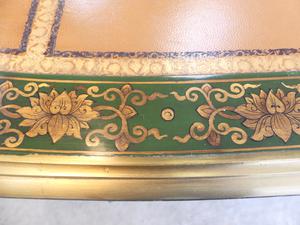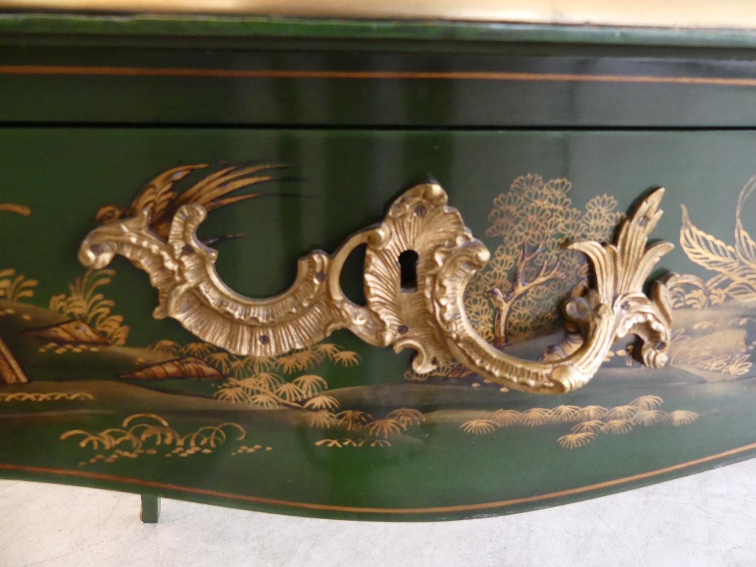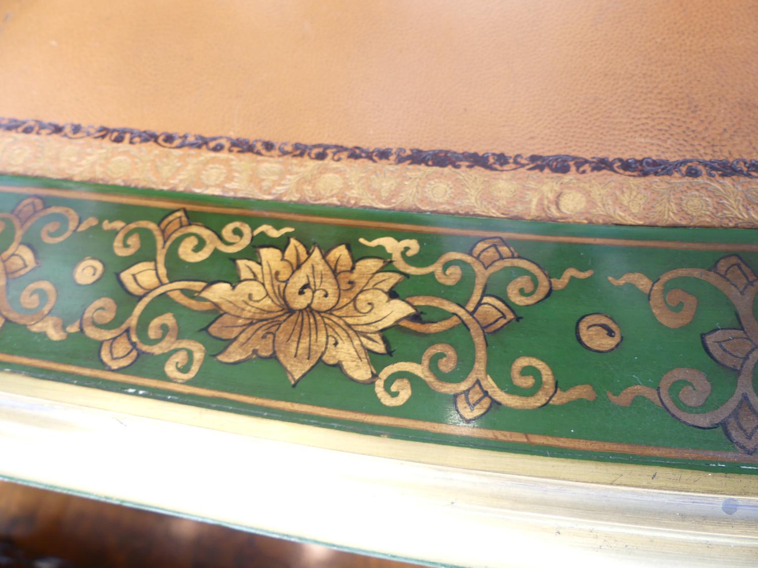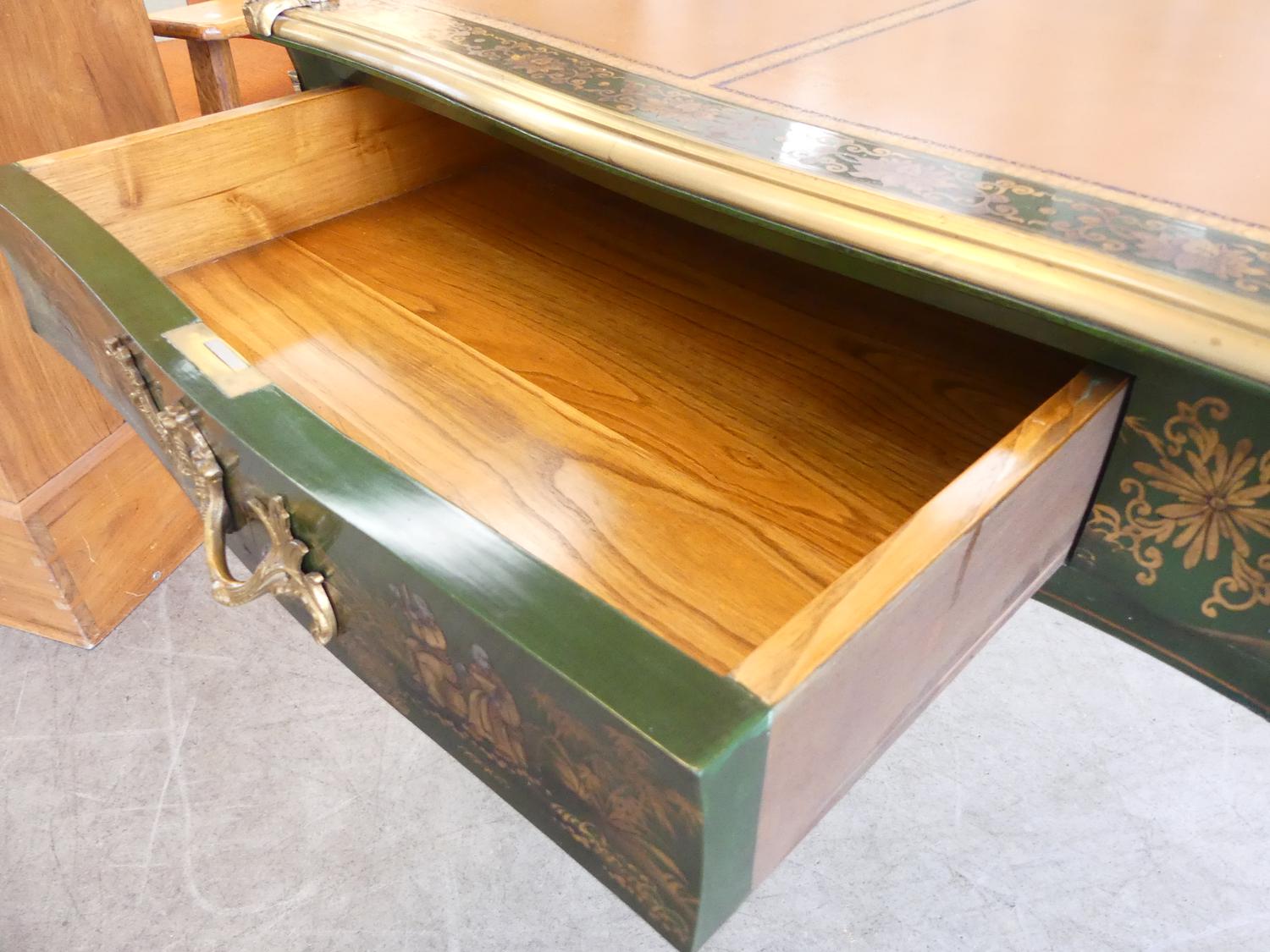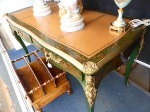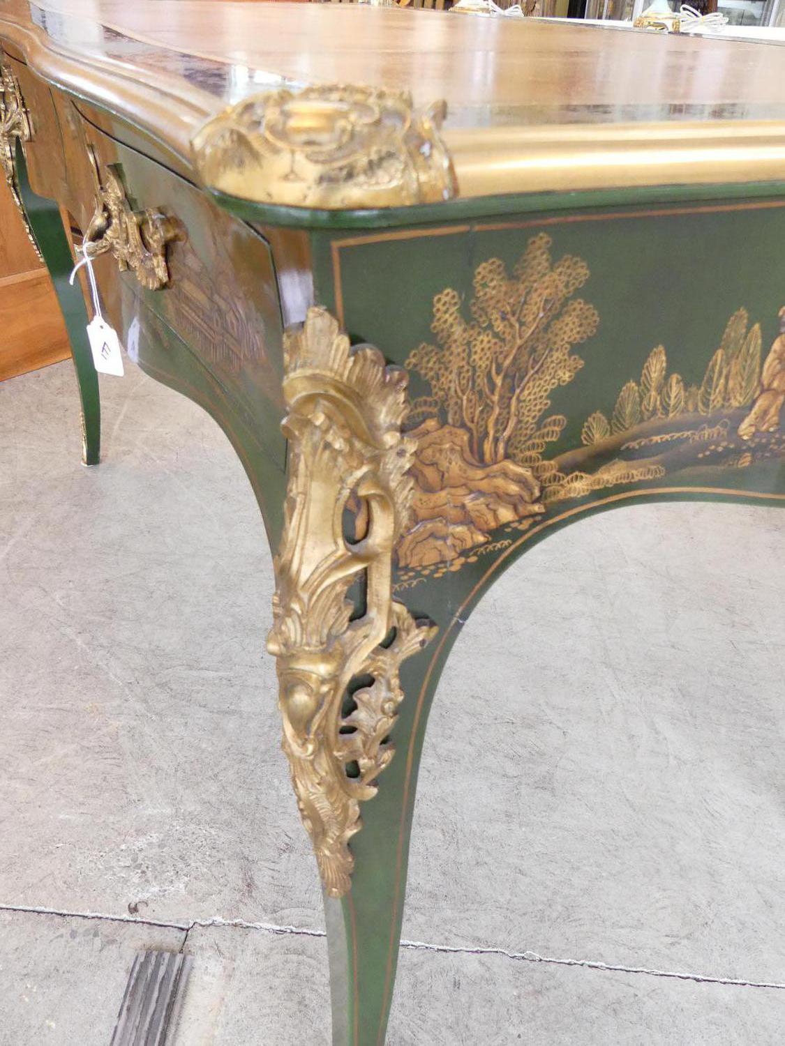 having a gilt tooled leather inset writing surface surrounded by gilded palmettes and a stepped brass moulded edge, above a pair of drawers in the fitted serpentine apron decorated with Chinoiserie scenes, raised on figural ormolu mounted tapering curving legs with sabots.