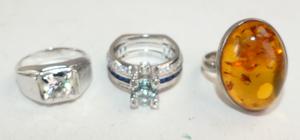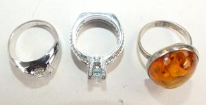 3 sterling silver rings, including amber
