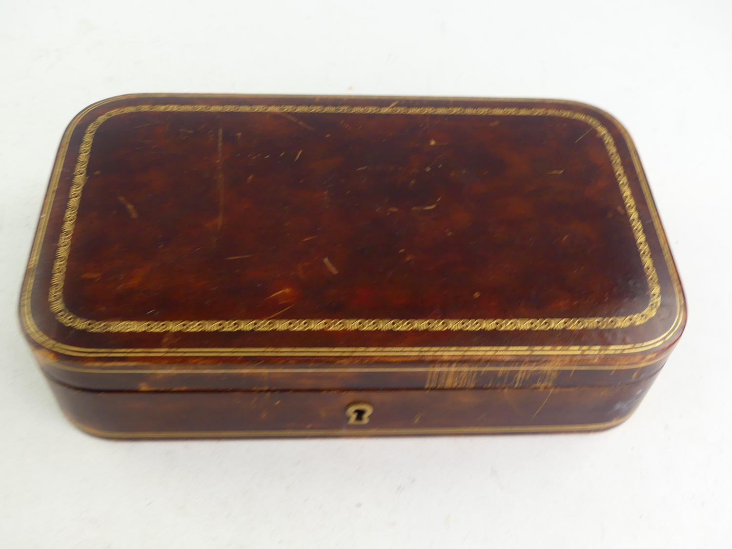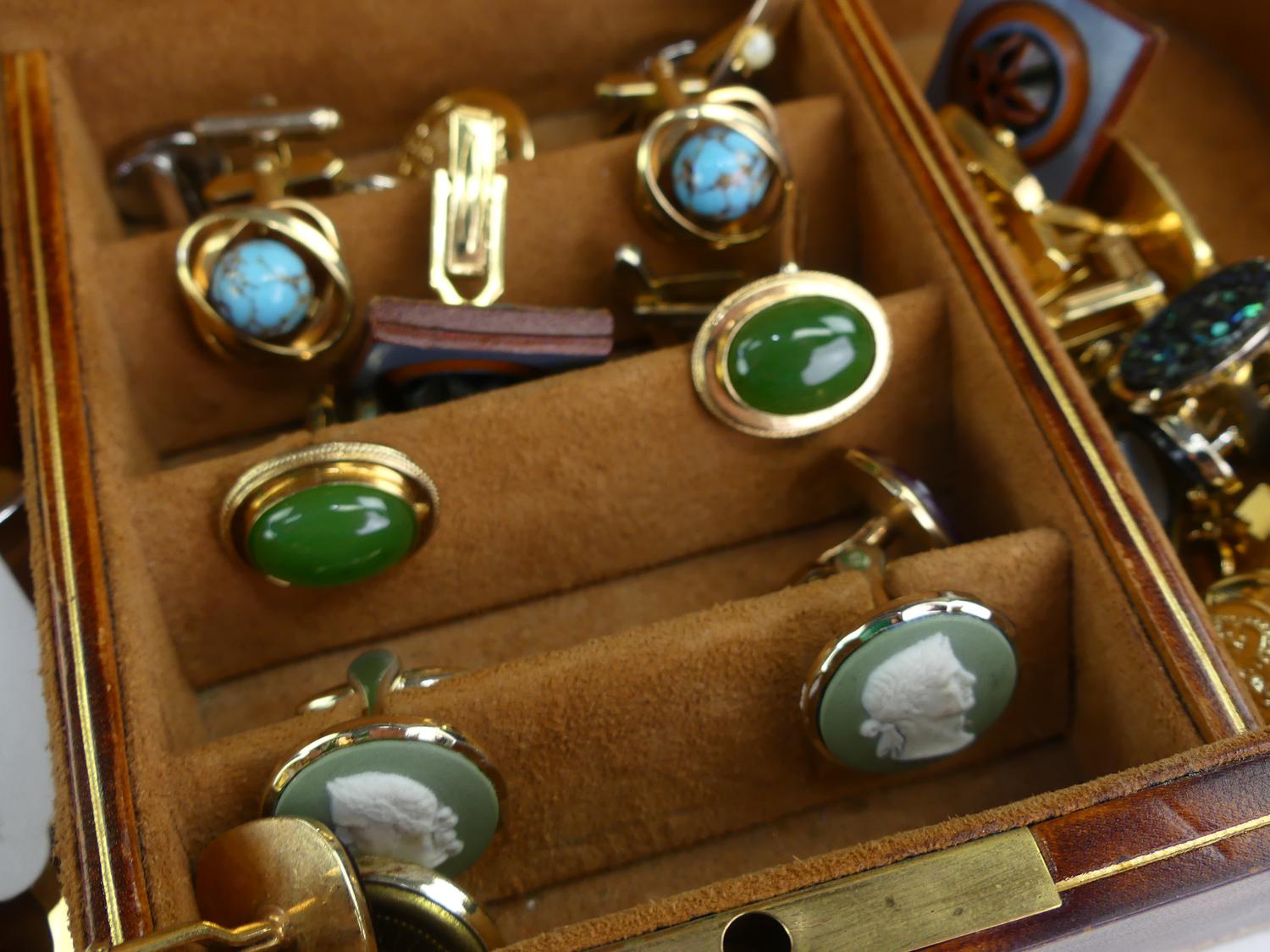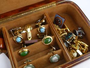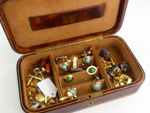 gents gilt leather dresser box with cufflinks, including tigers eye, wedgewood