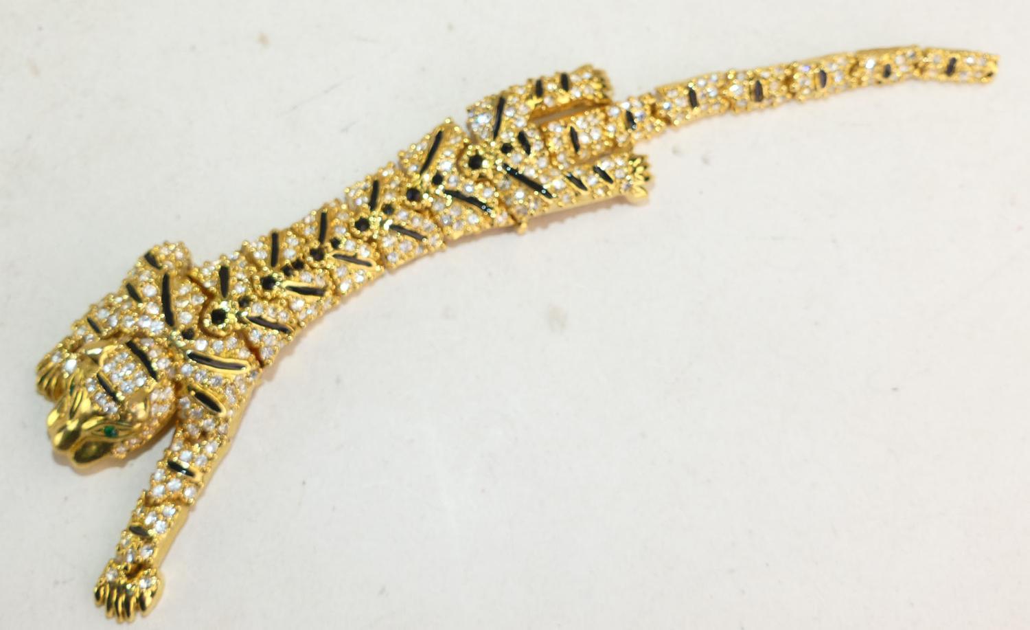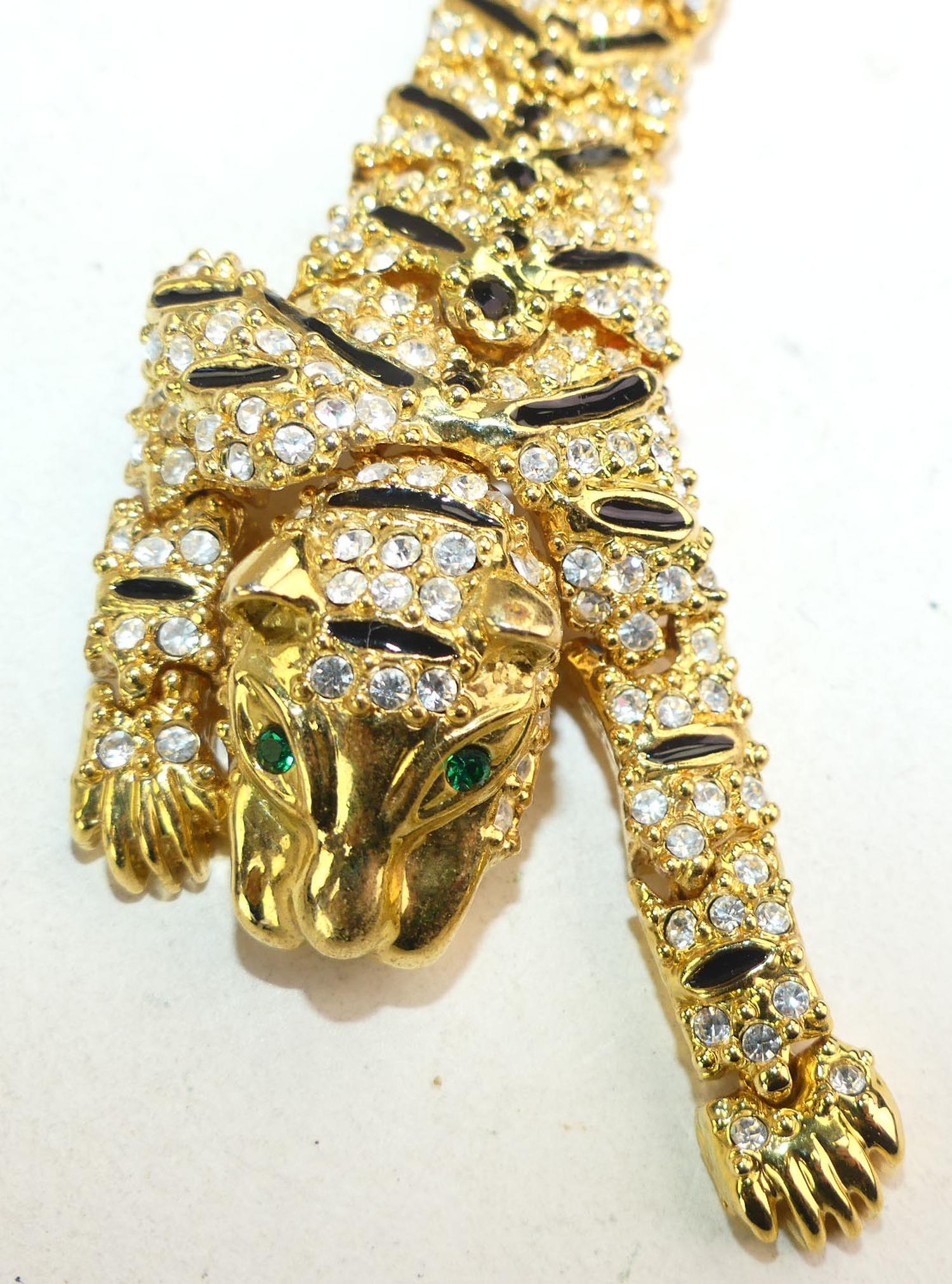 vintage goldtone rhinestone articulated tiger shoulder duster brooch, enamel