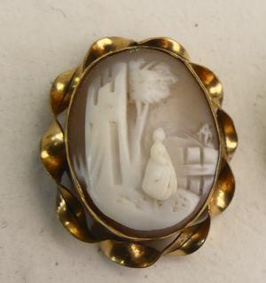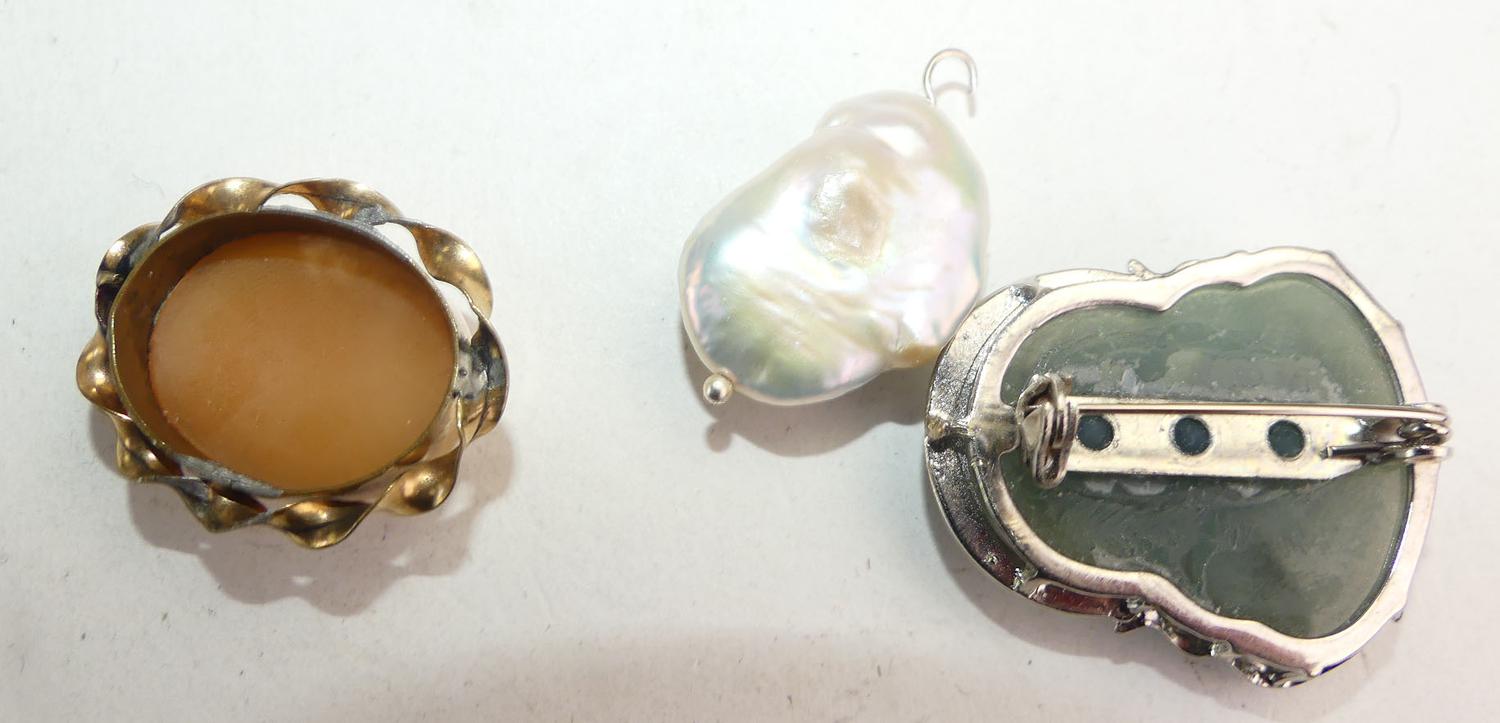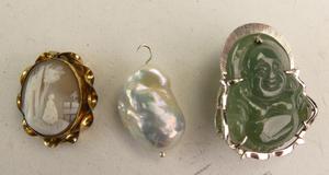 carved hardstone budda pendant brooch, pearl pendant, shell cameoz(pin missing)