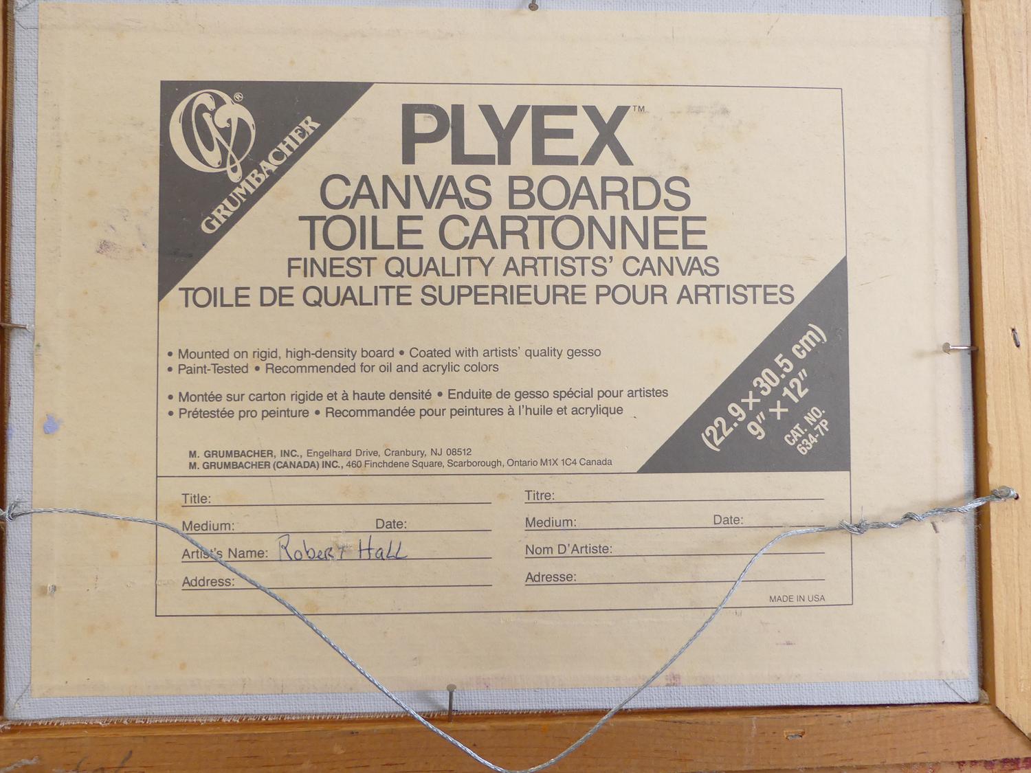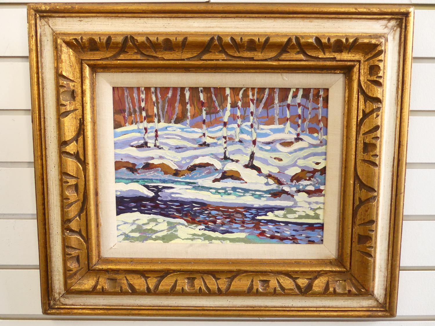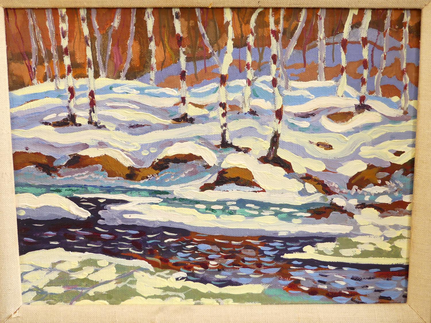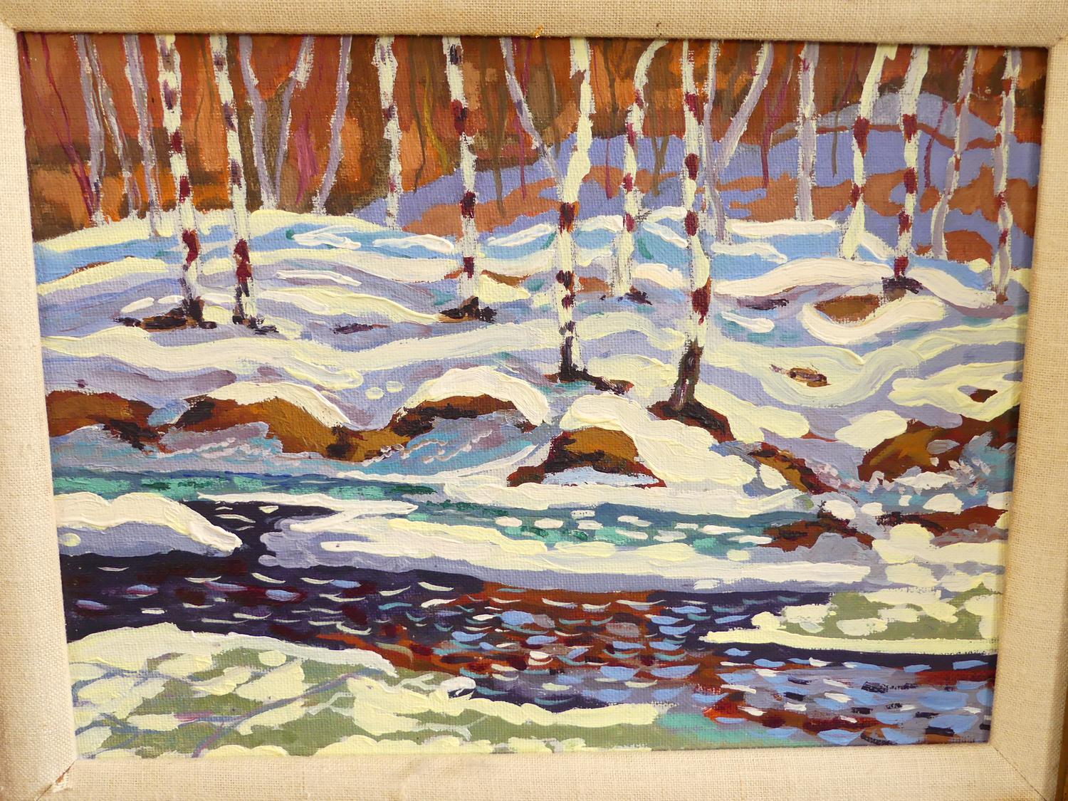 robert hall, oil on board, 9" x 12", "winter river scene with birches"