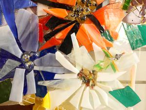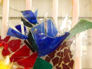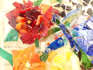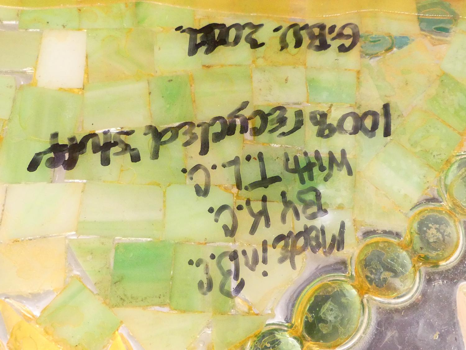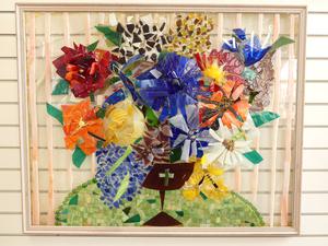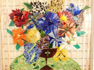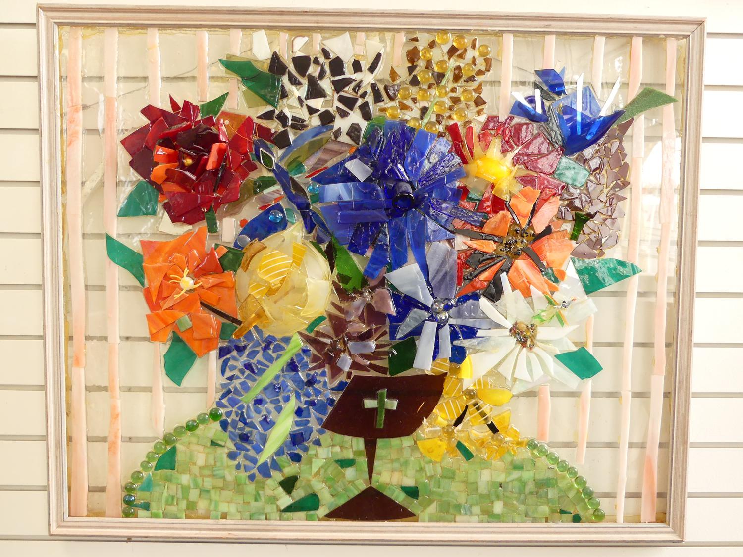 glass mosaic panel, 30" x 37", "flowers", inscribes verss -made in bc by kc with tlc