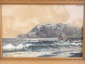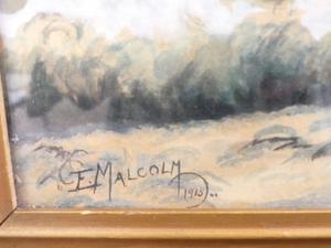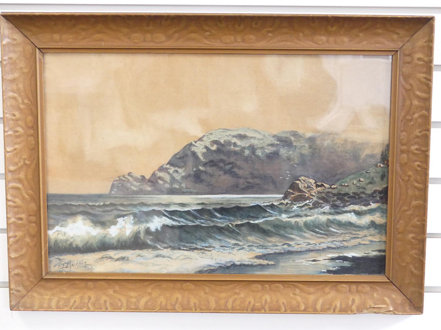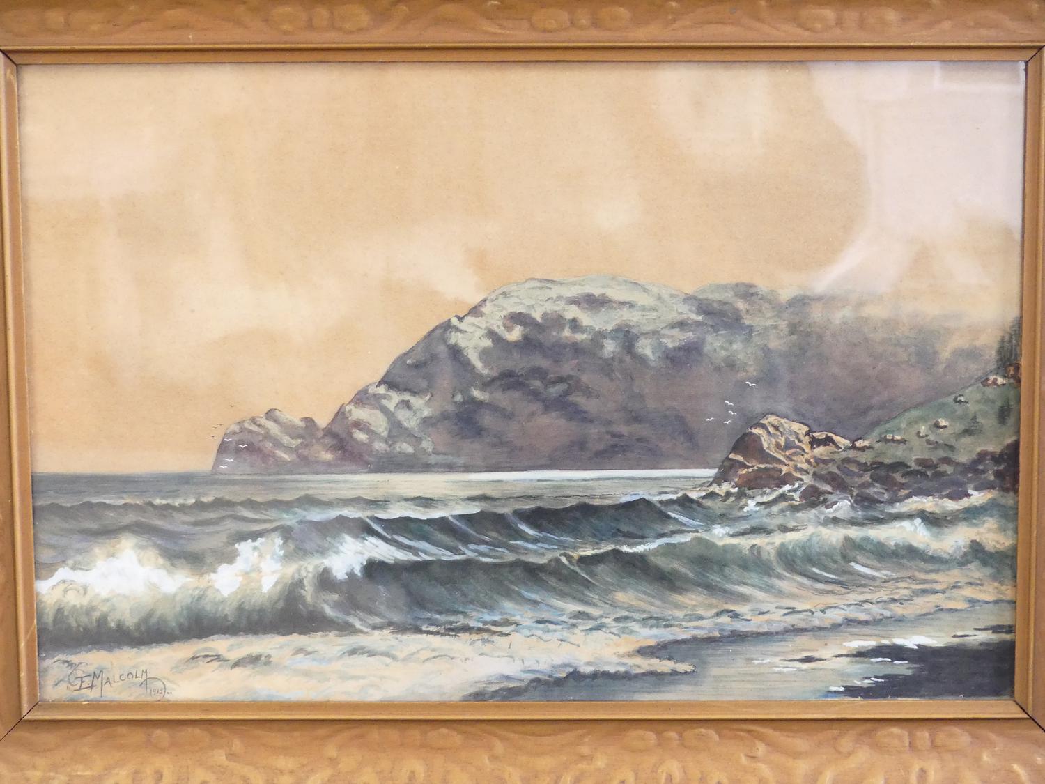 f. malcolm, dated 1915, watercolour, 12" x 18", "crashing surf"