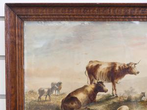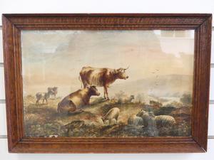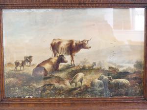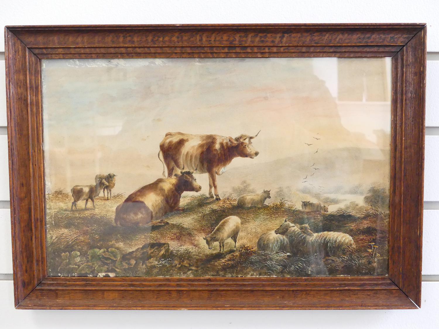 bearing initials and dated 1915 watercolour, 8 1/2" x 13 1/2", cattle and sheep on hill crest"